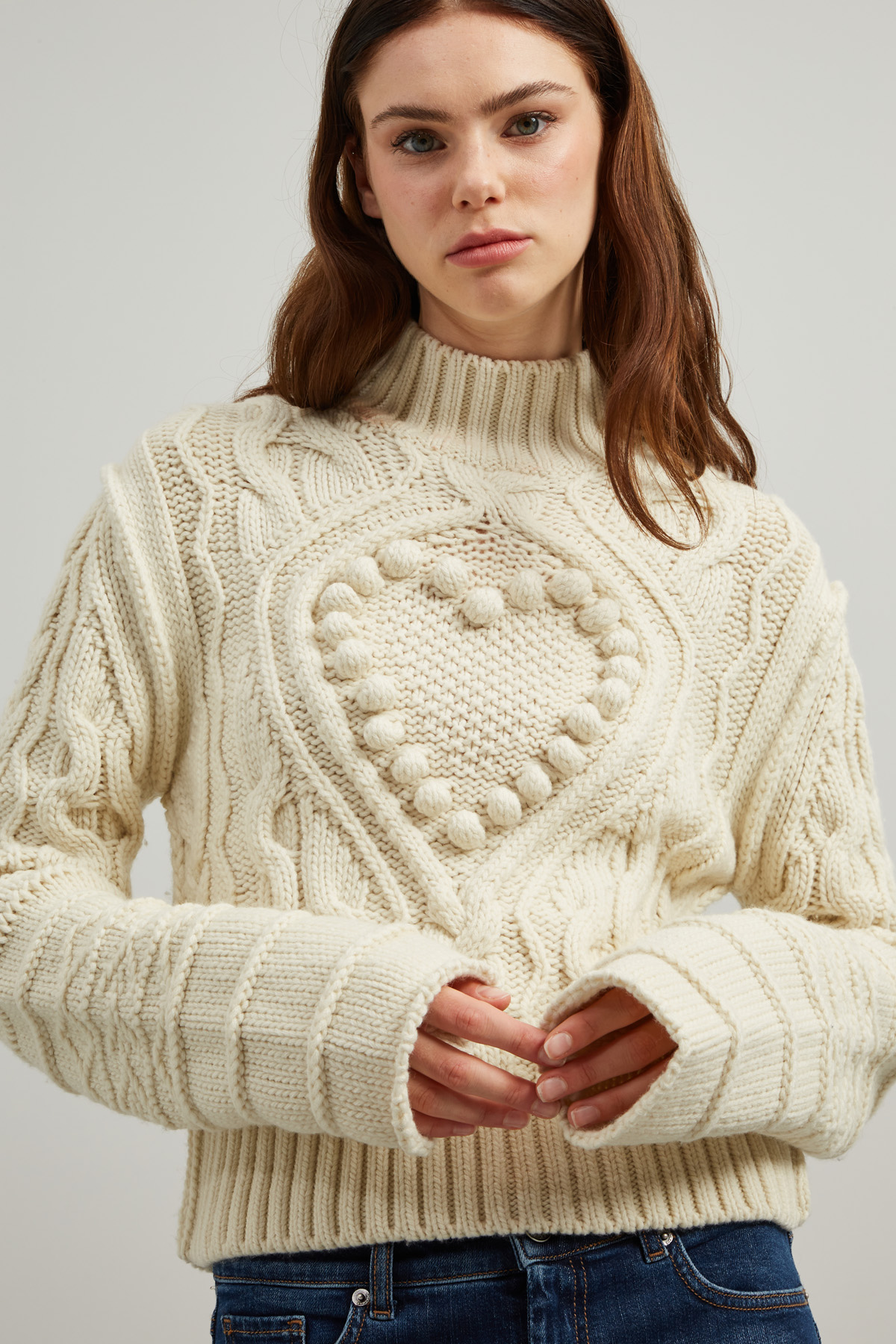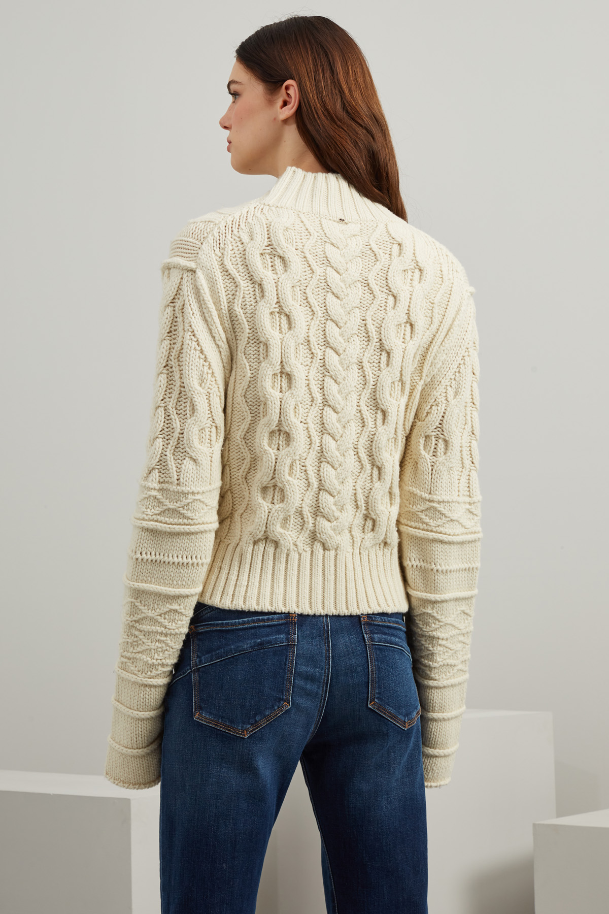 Maglia corta dalla linea dritta realizzata in filato di pura lana, con lavorazione a rilievo, collo alto, maniche lunghe e profili rifiniti a coste.