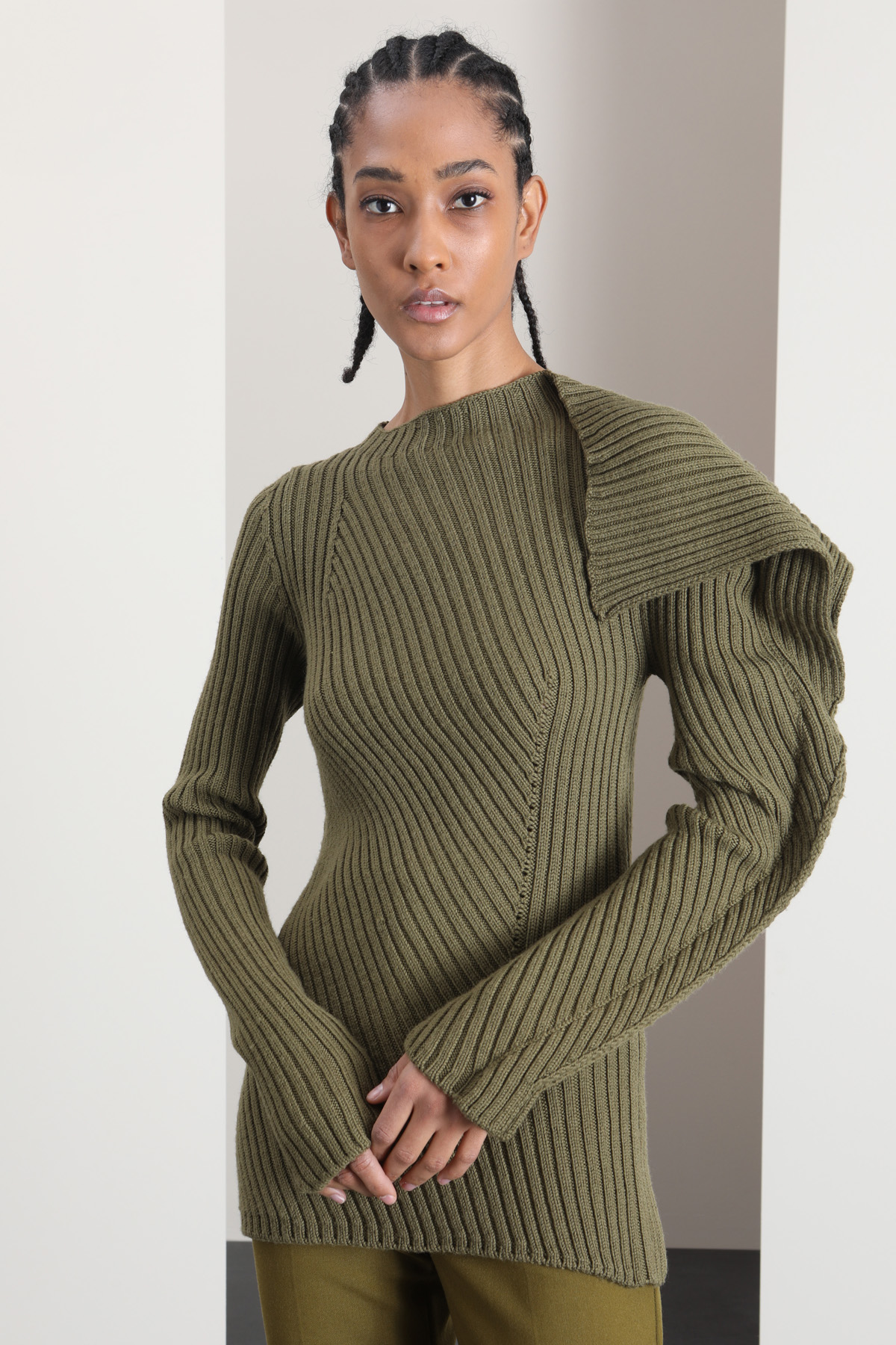 Maglia dalla linea aderente realizzata in filato di pura lana, con lavorazione a coste, scollo a giro e maniche lunghe con motivo di volant.