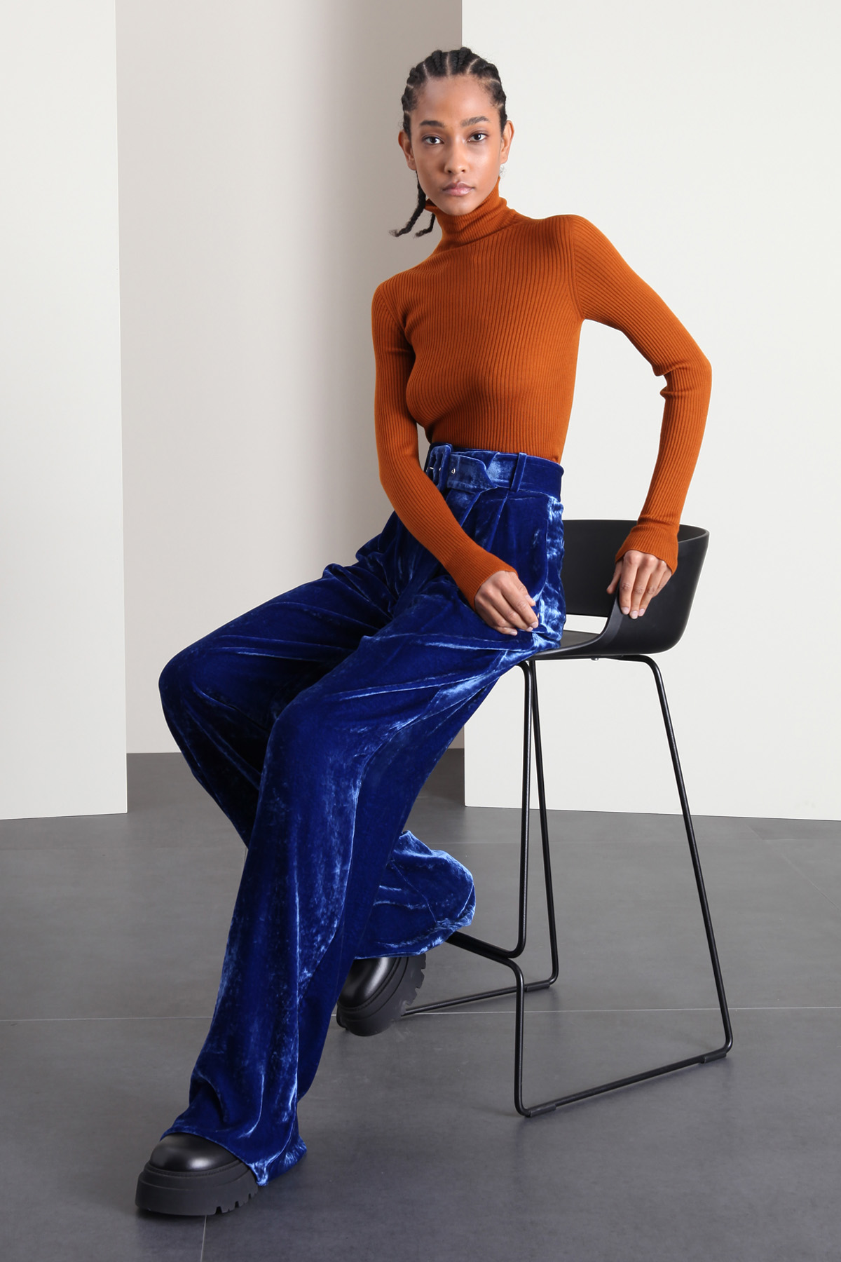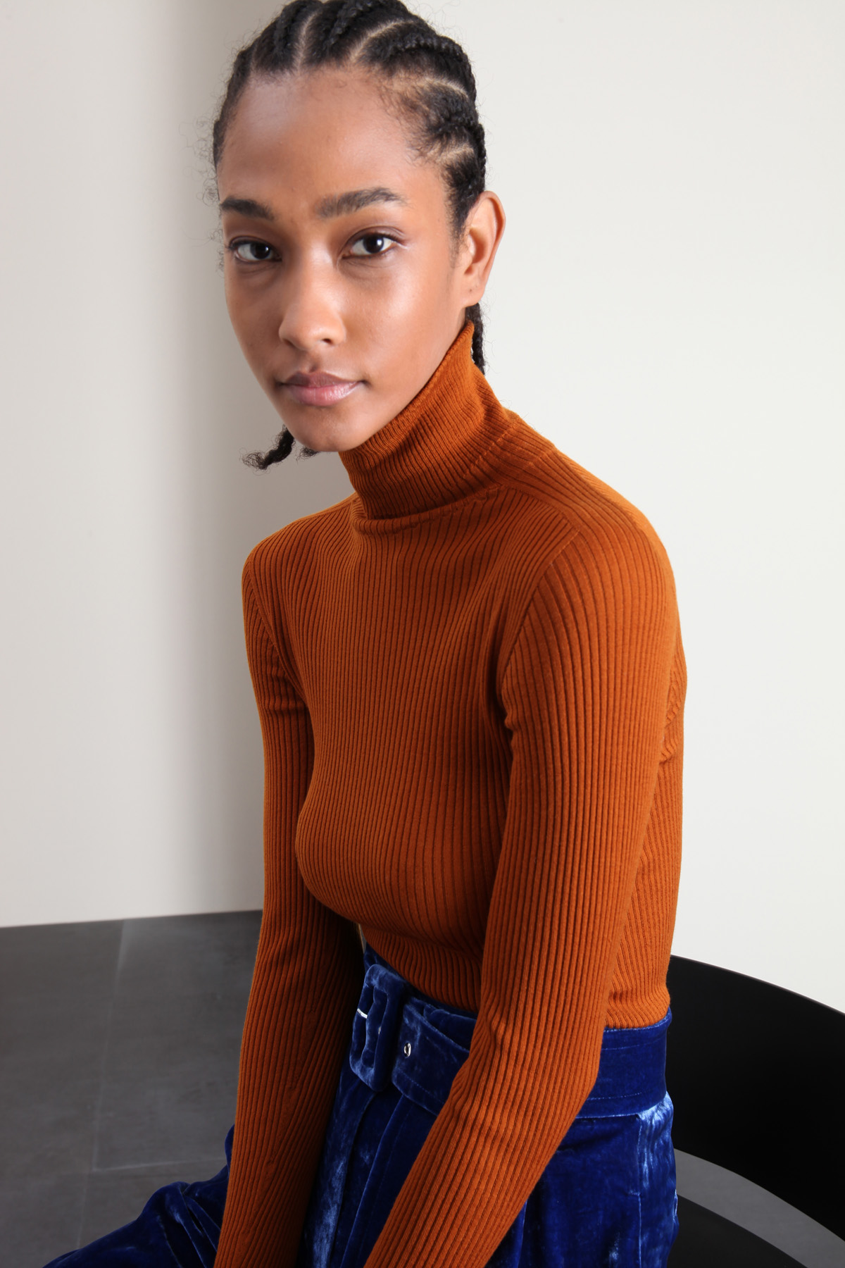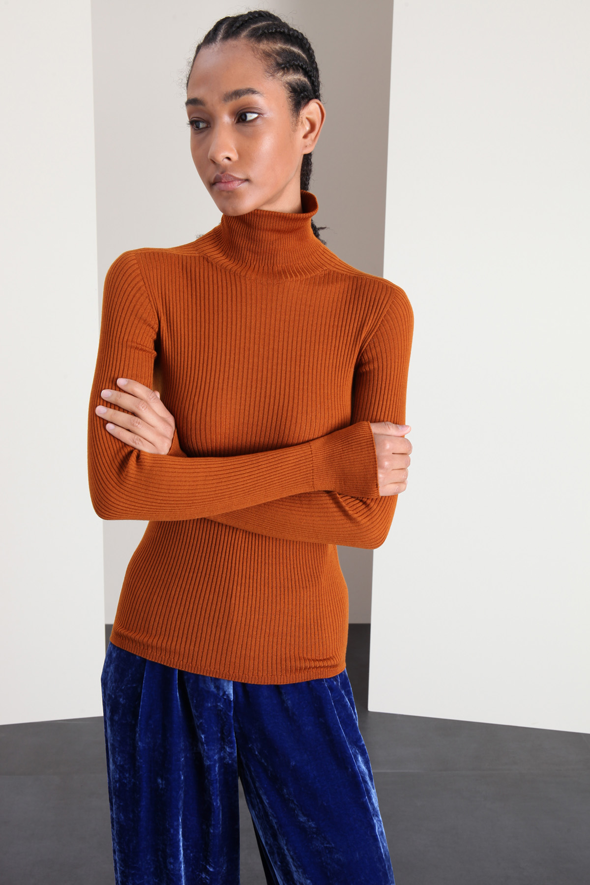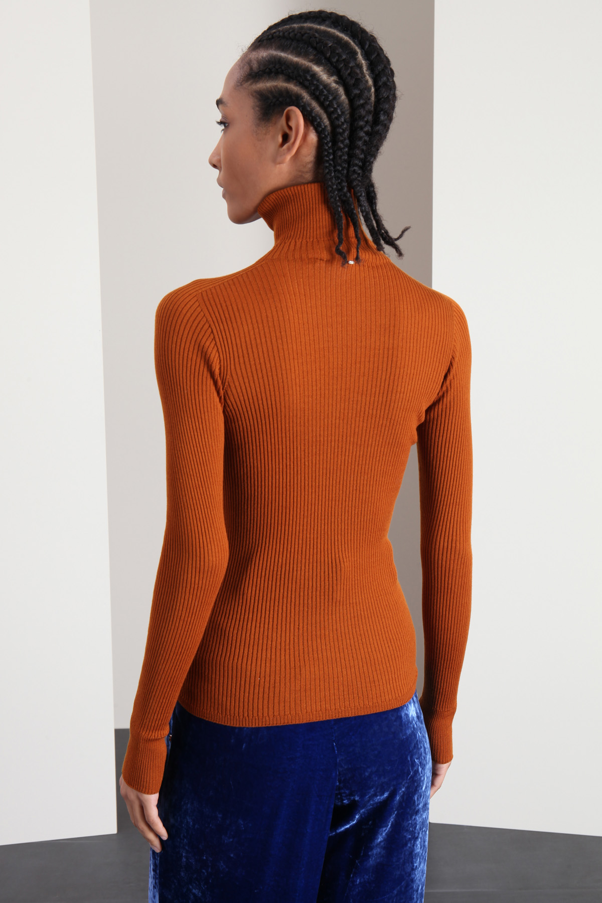 Dolcevita dalla linea aderente realizzato in filato di pura lana, con lavorazione a coste, collo alto e maniche lunghe.