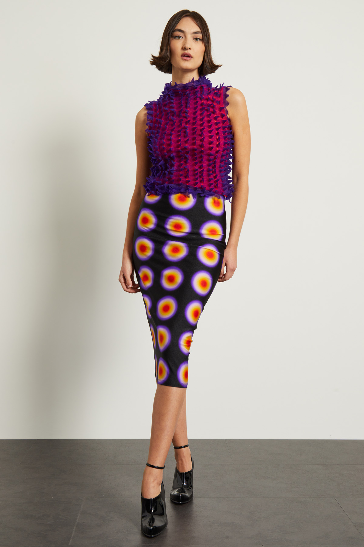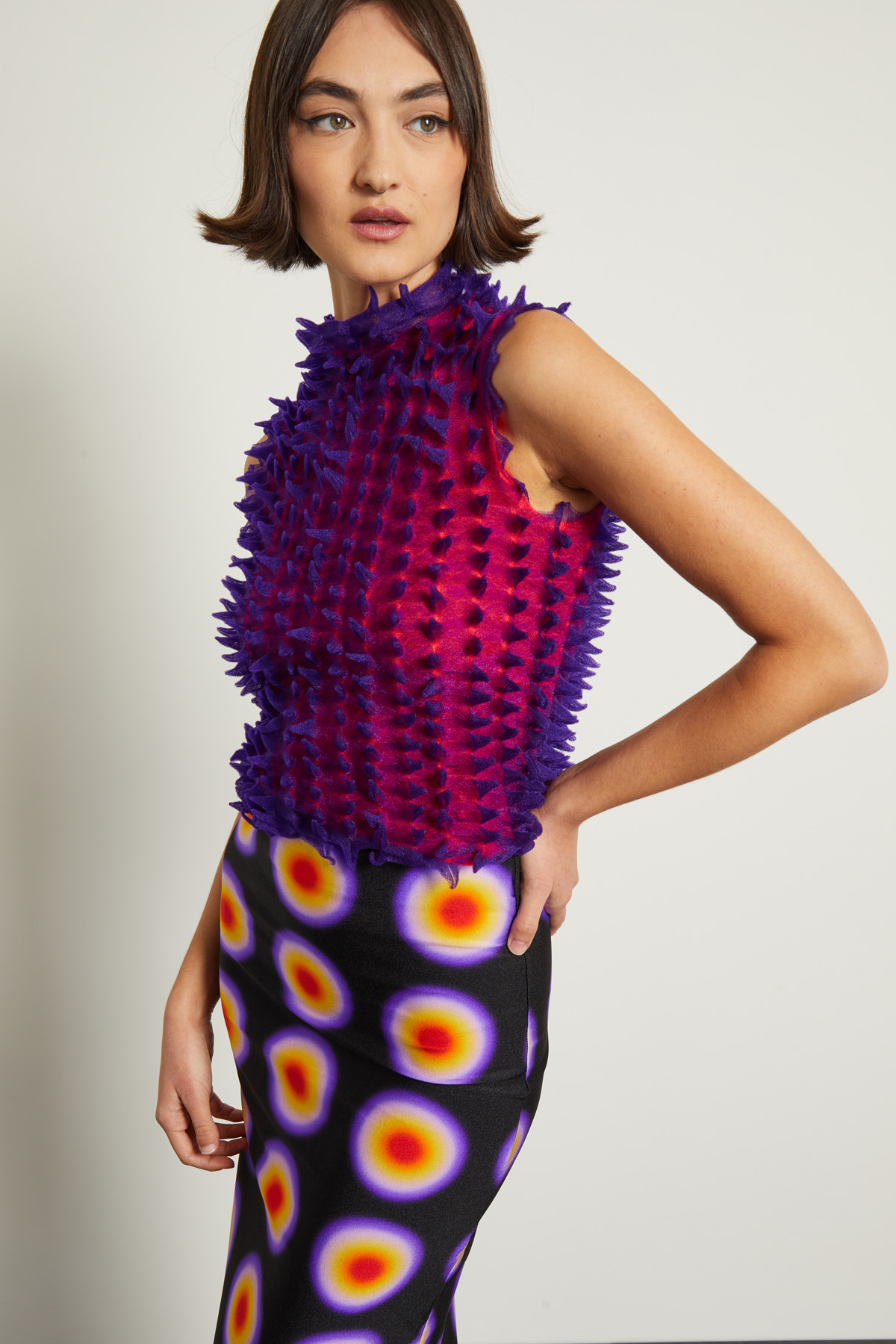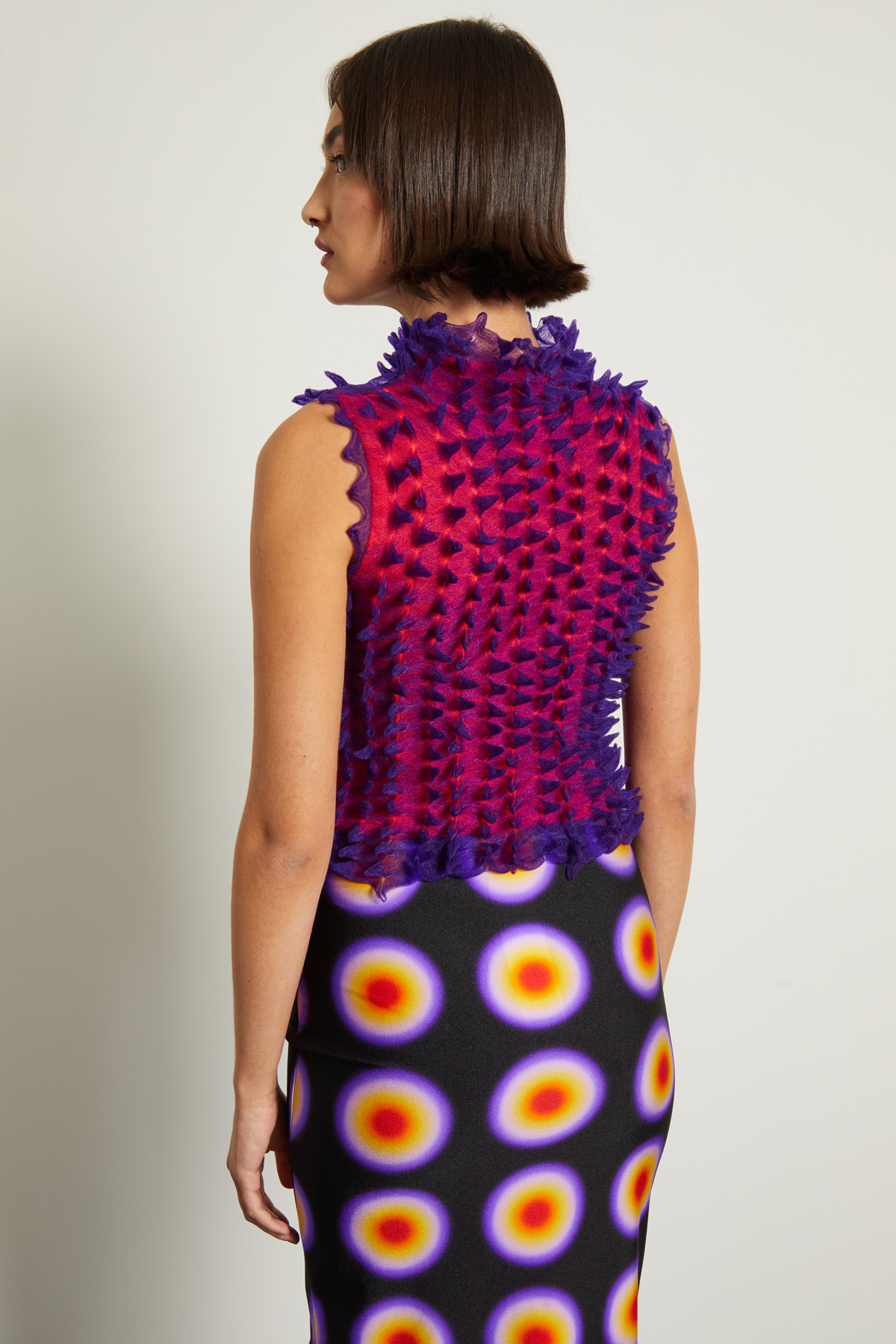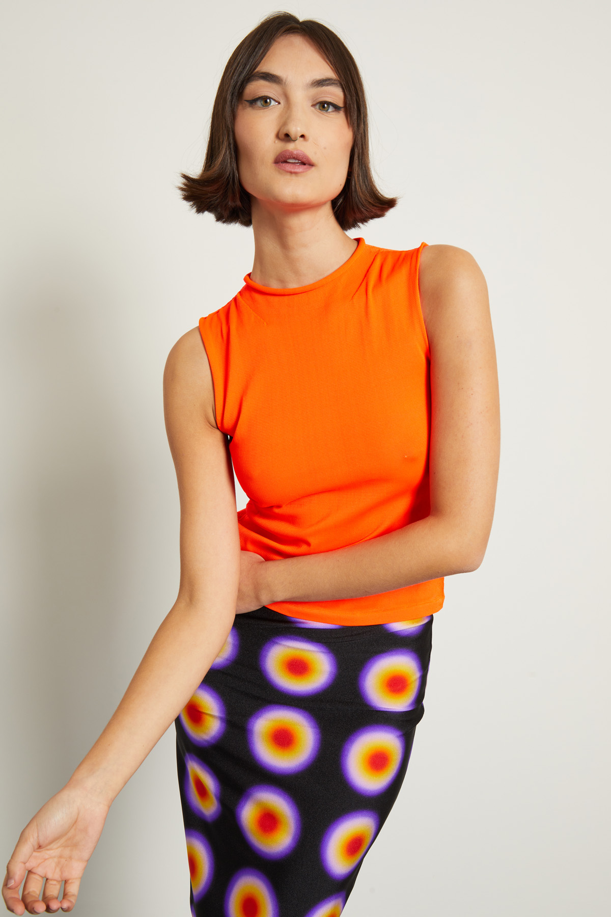 Top smanicato corto dalla linea aderente realizzato in jersey tecnico con lavorazione a rilievo e collo alto. Capo dotato di top sottoveste in abbinamento.