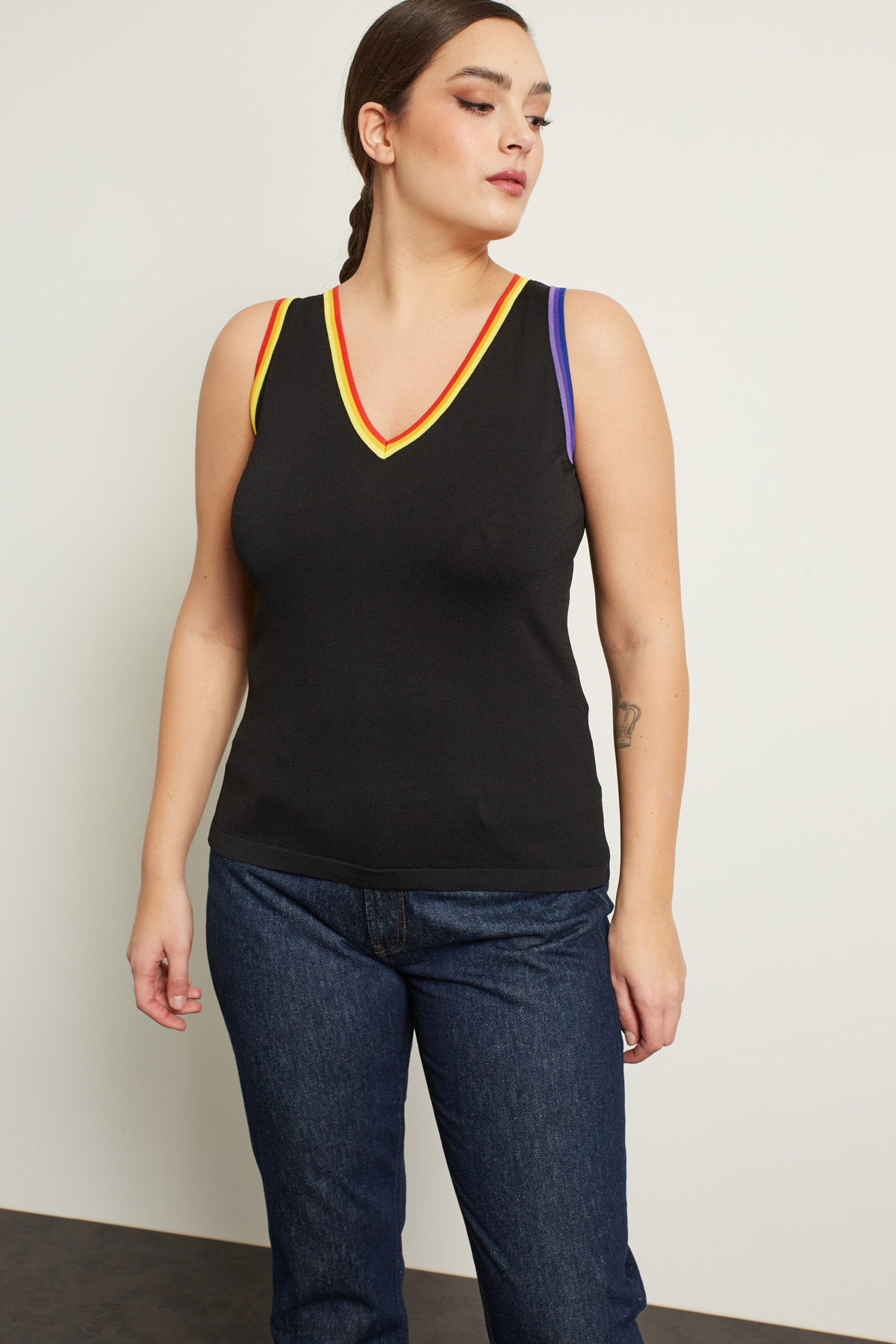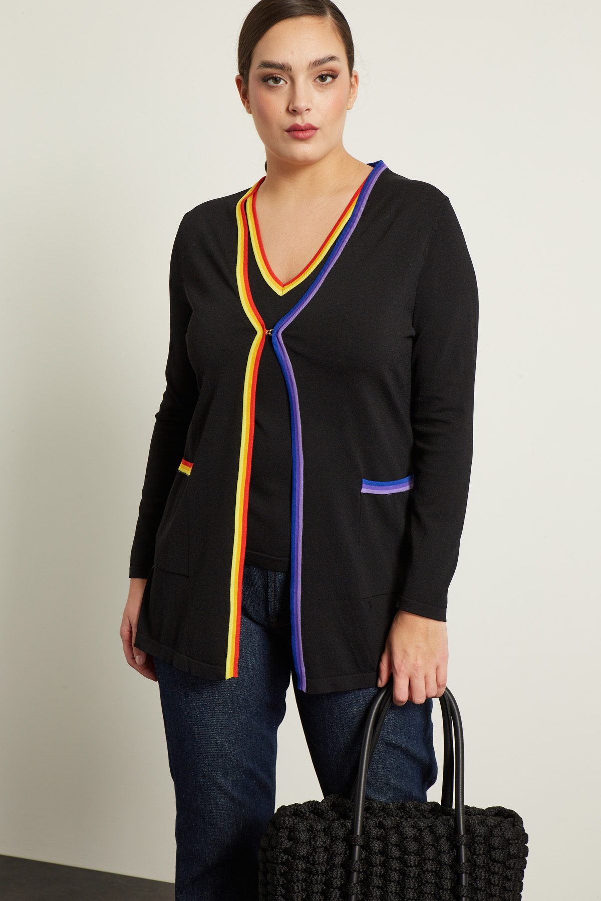 Maglia dalla linea dritta realizzata in filato di misto viscosa con profili a contrasto. Cardigan con scollo a V, maniche lunghe, tasche applicate sul davanti e spacchi laterali al fondo. Top smanicato con scollo a V. Allacciatura tramite gancio.