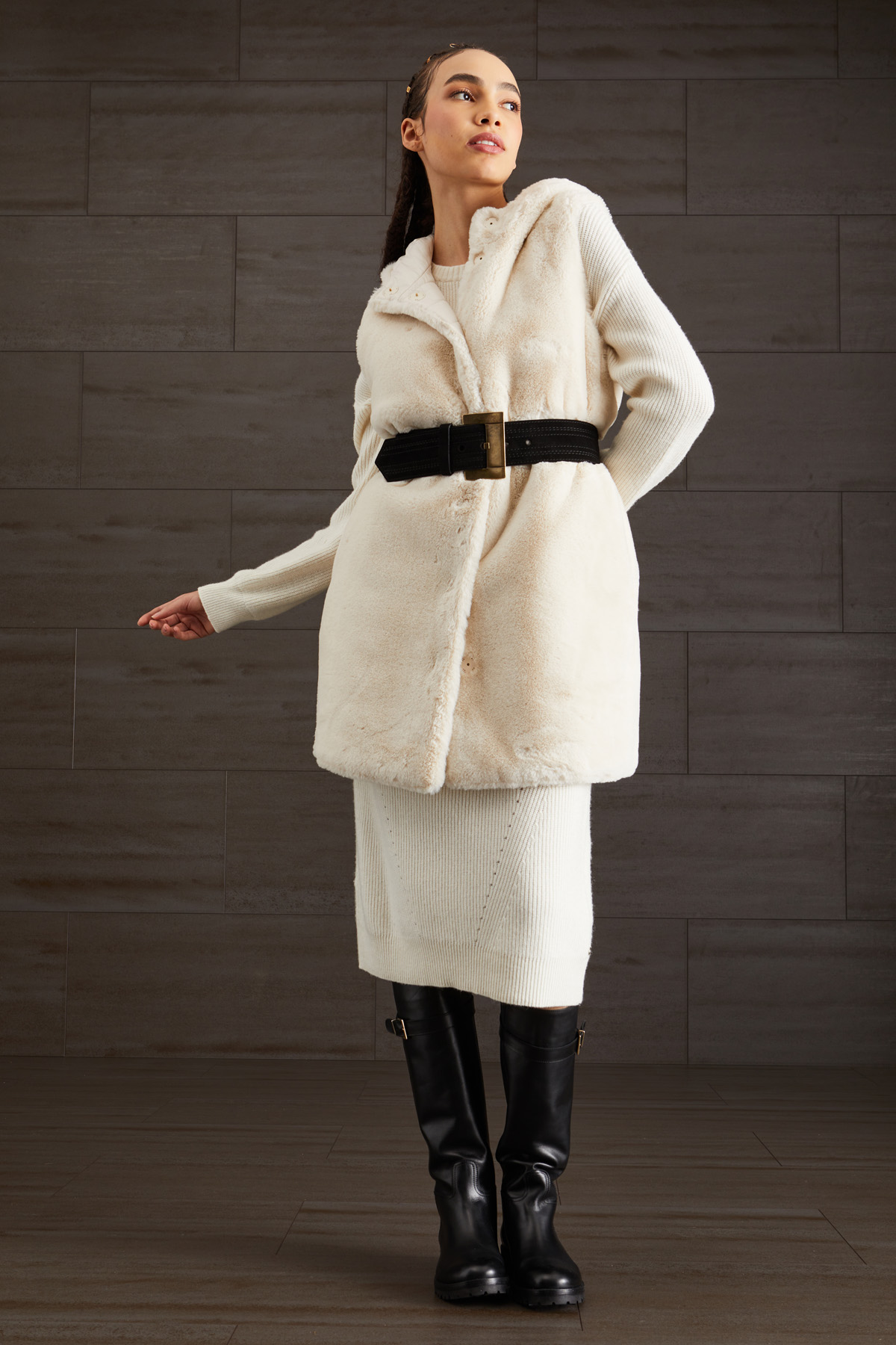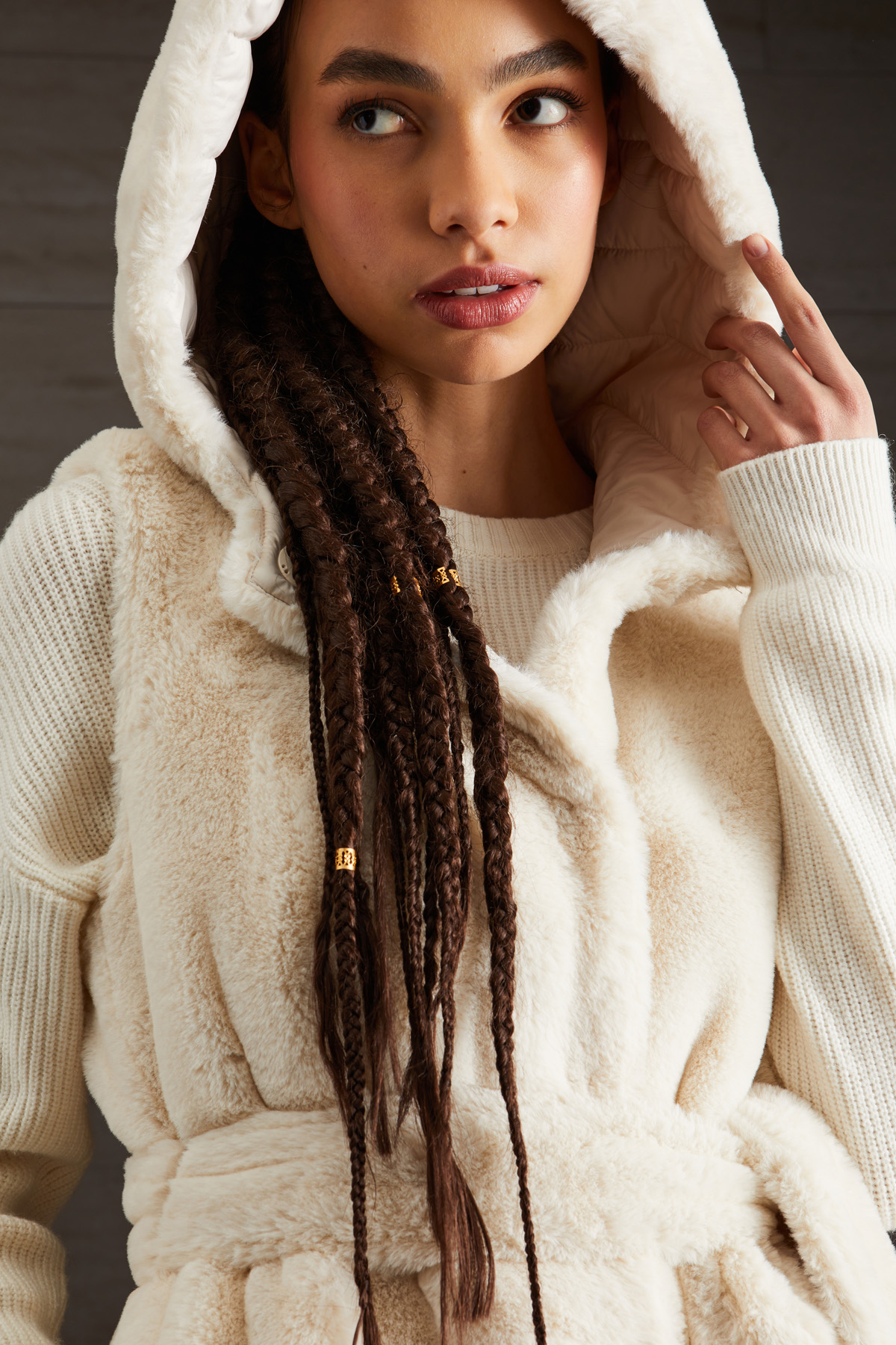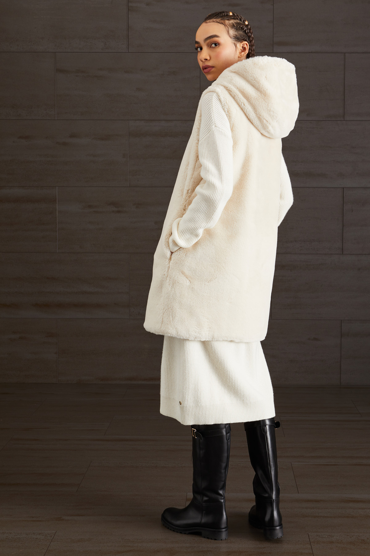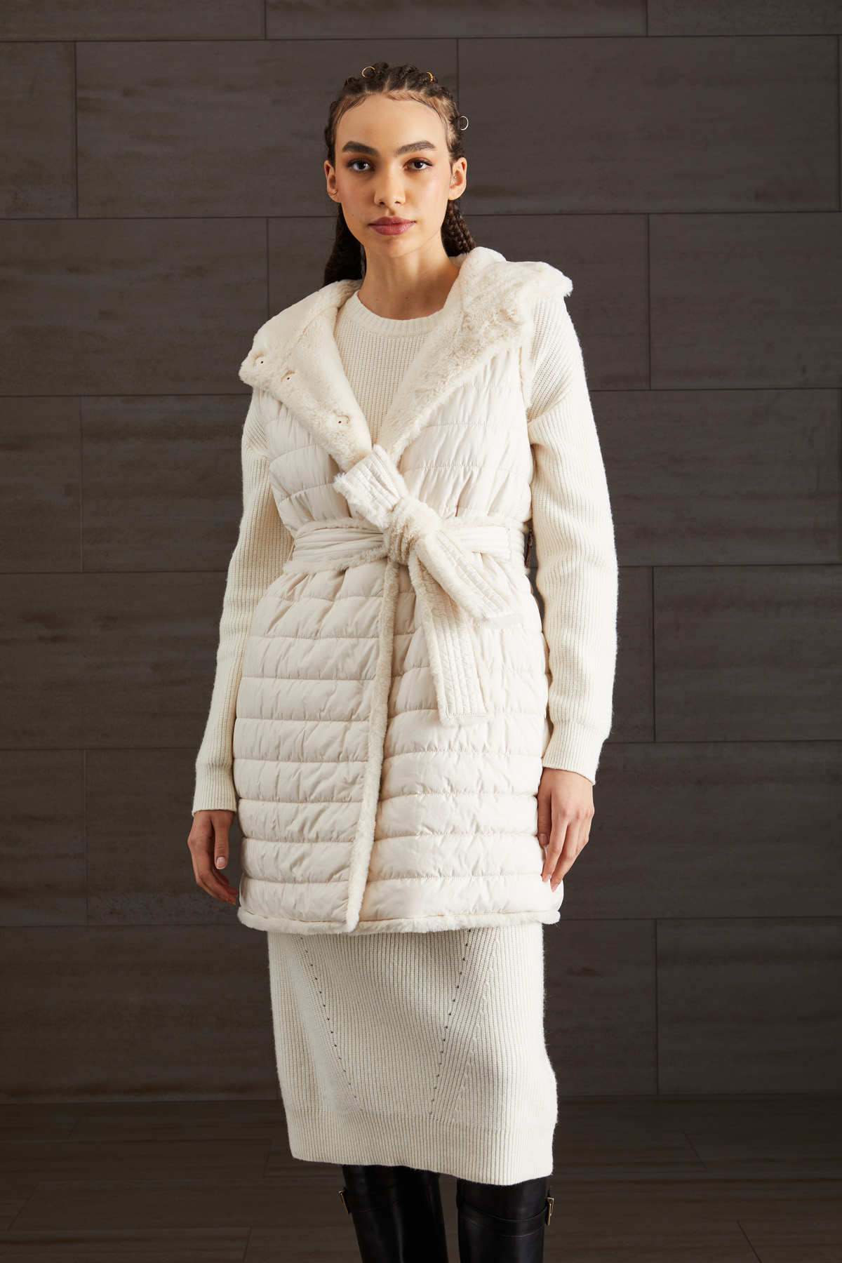 Gilet imbottito reversibile realizzato in tessuto effetto pelliccia, con cappuccio e tasche laterali inserite in cucitura. Interno realizzato in raso tecnico trapuntato con tasche laterali e zip. Allacciatura tramite bottoni automatici e cintura coordinata.