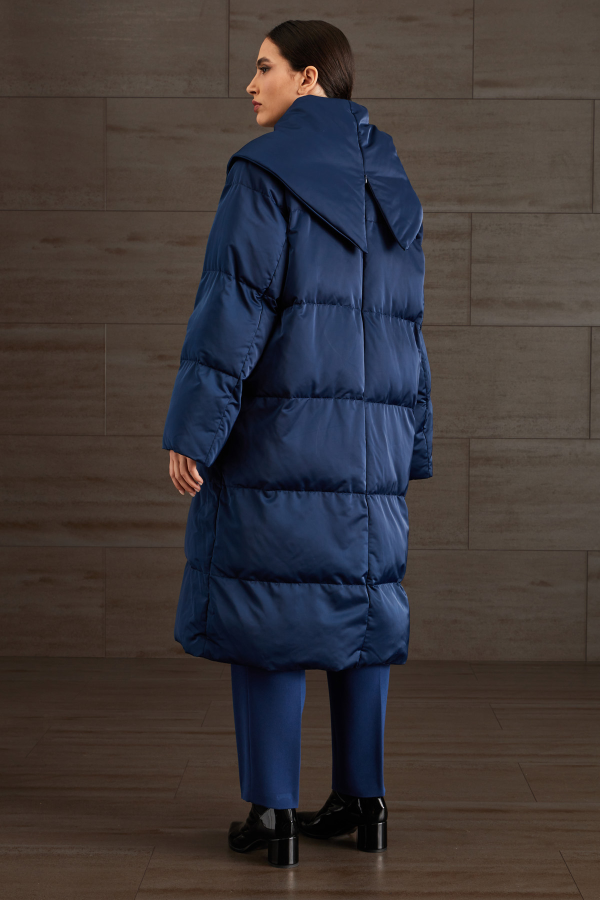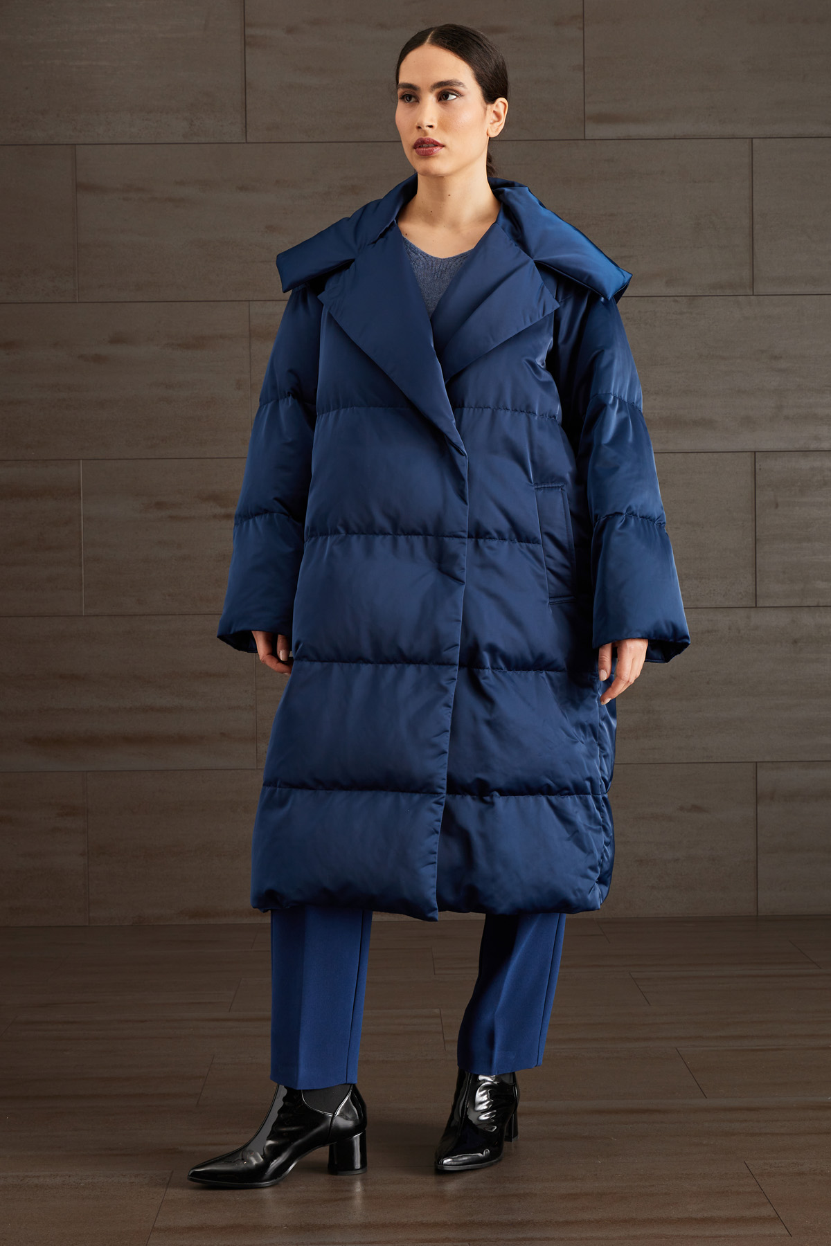 Imbottito lungo dalla linea over realizzato in duchesse tecnica trapuntata antigoccia, con maxi collo a rever e zip, maniche lunghe, tasche a filettone e allacciatura doppiopetto tramite bottoni a calamita.