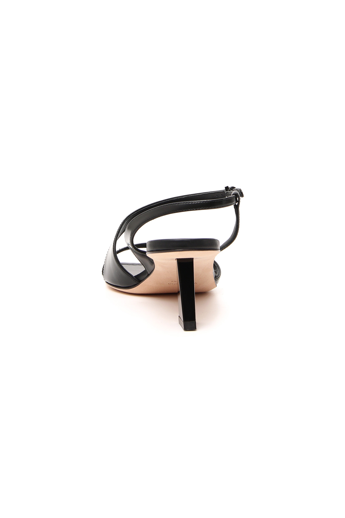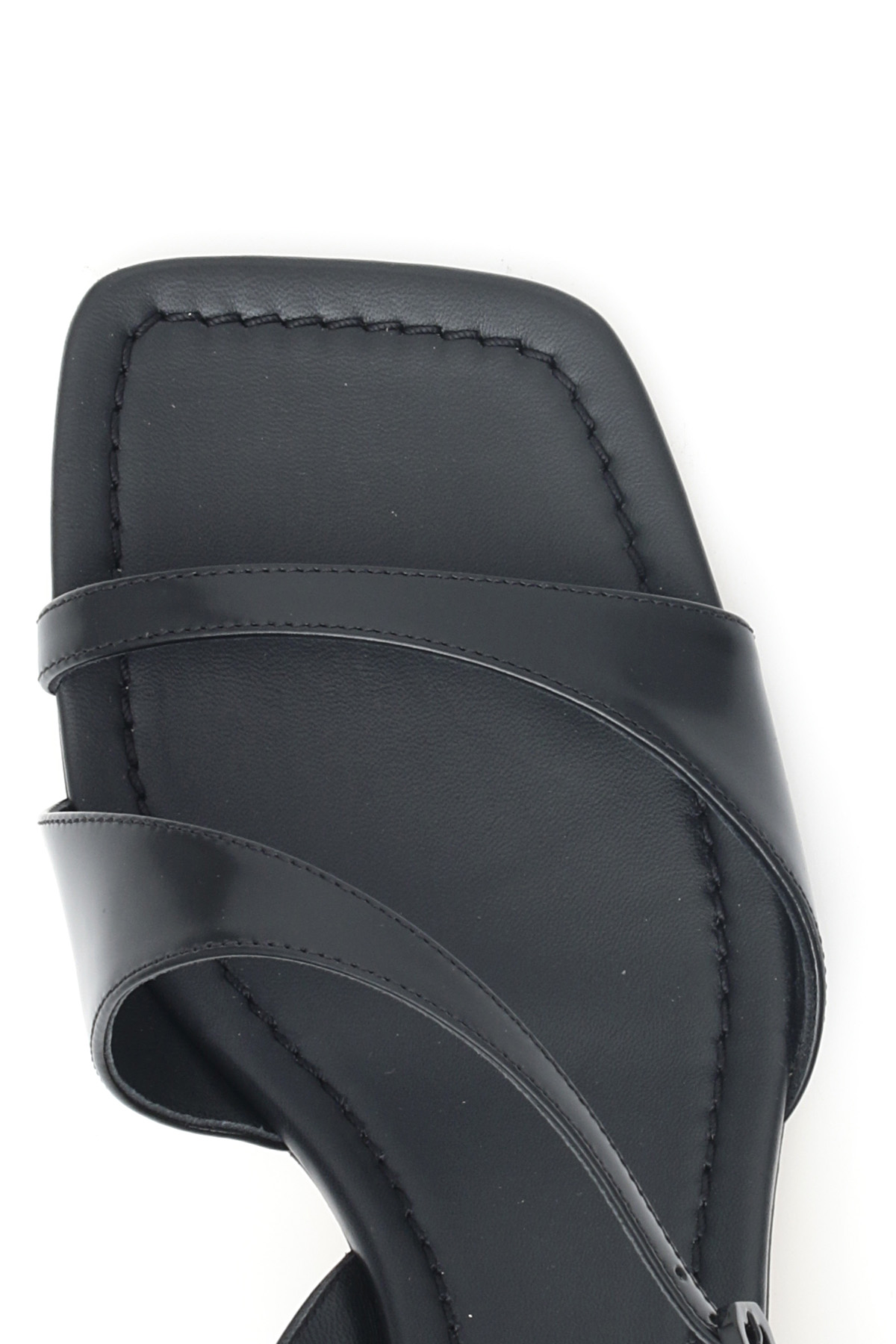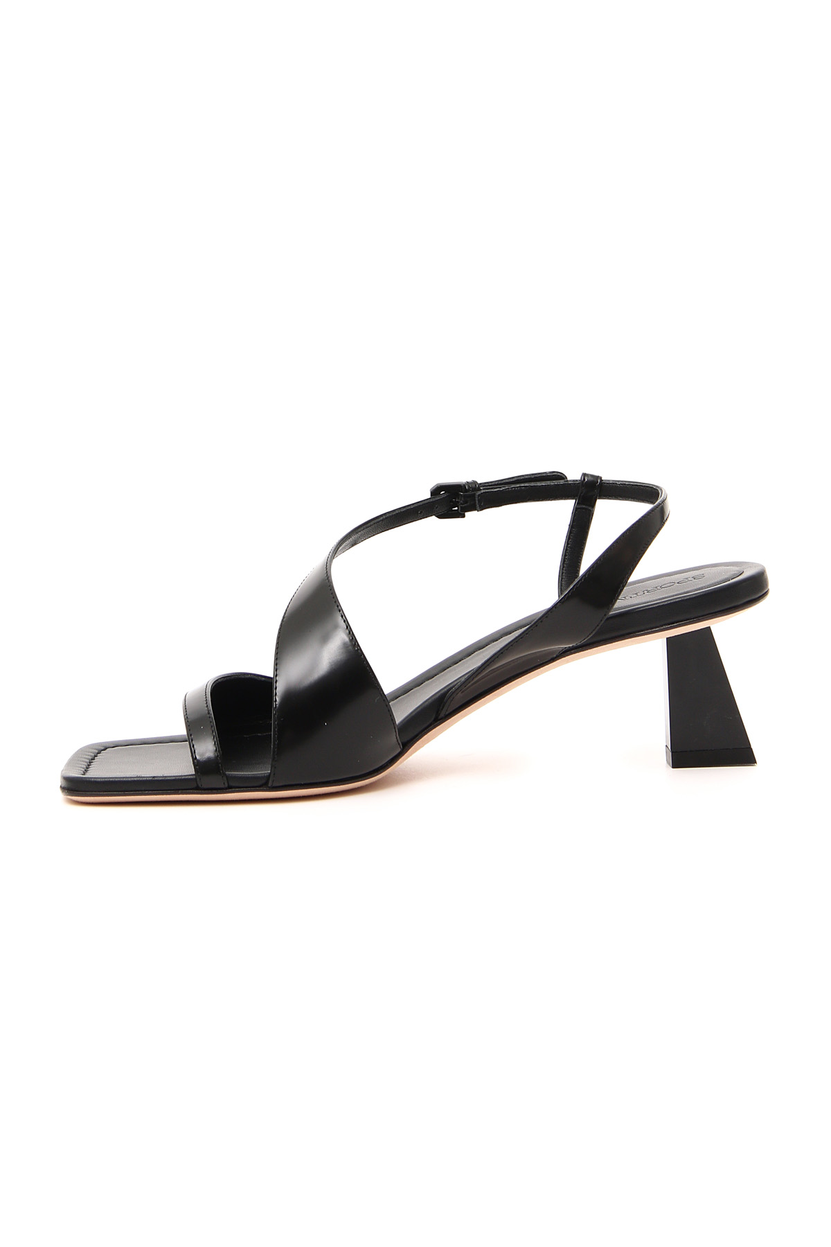 Sandali realizzati in vera pelle dal finish lucido, con fascia asimmetrica, punta squadrata e tacco geometrico. Chiusura con cinturino. Fodera in pelle, suola in cuoio.