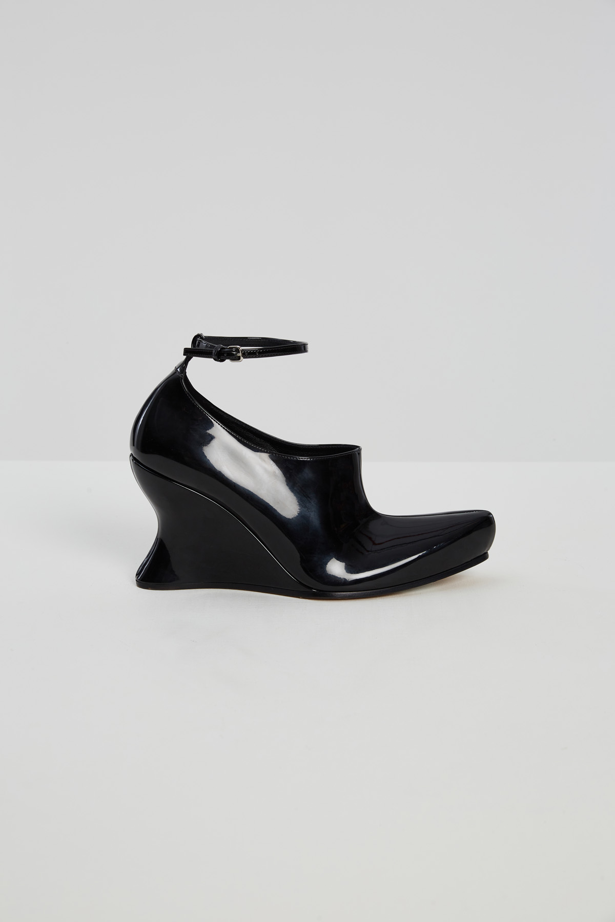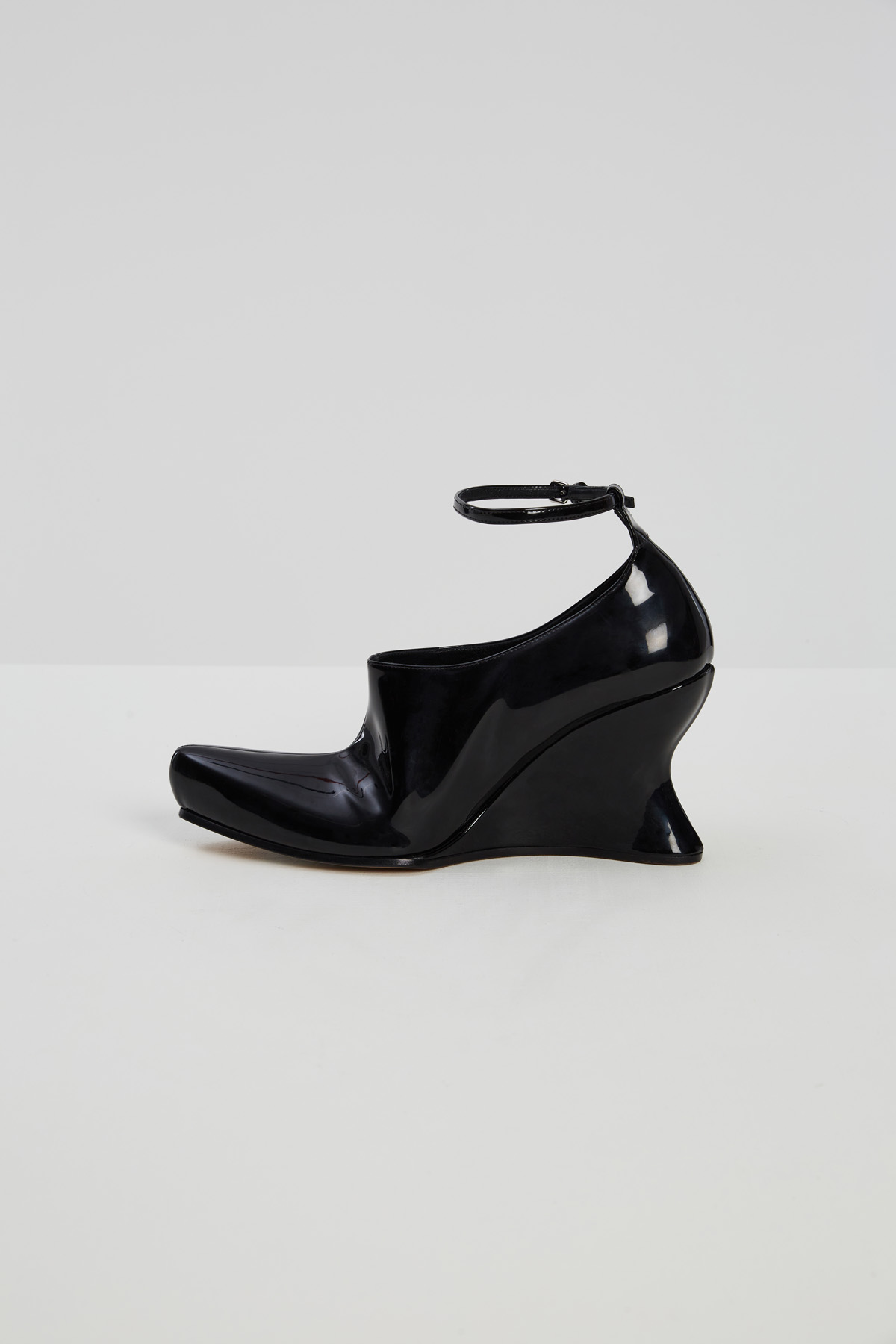 Scarpe con zeppa realizzate in vernice. Punta affusolata e cinturino alla caviglia. Fodera in pelle e suola in cuoio.