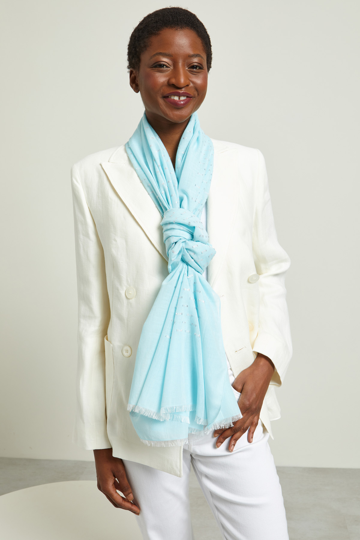 Stola realizzata in garza di misto cotone e fibra naturale con lavorazione fil coupé lamè, bordi sfrangiati.