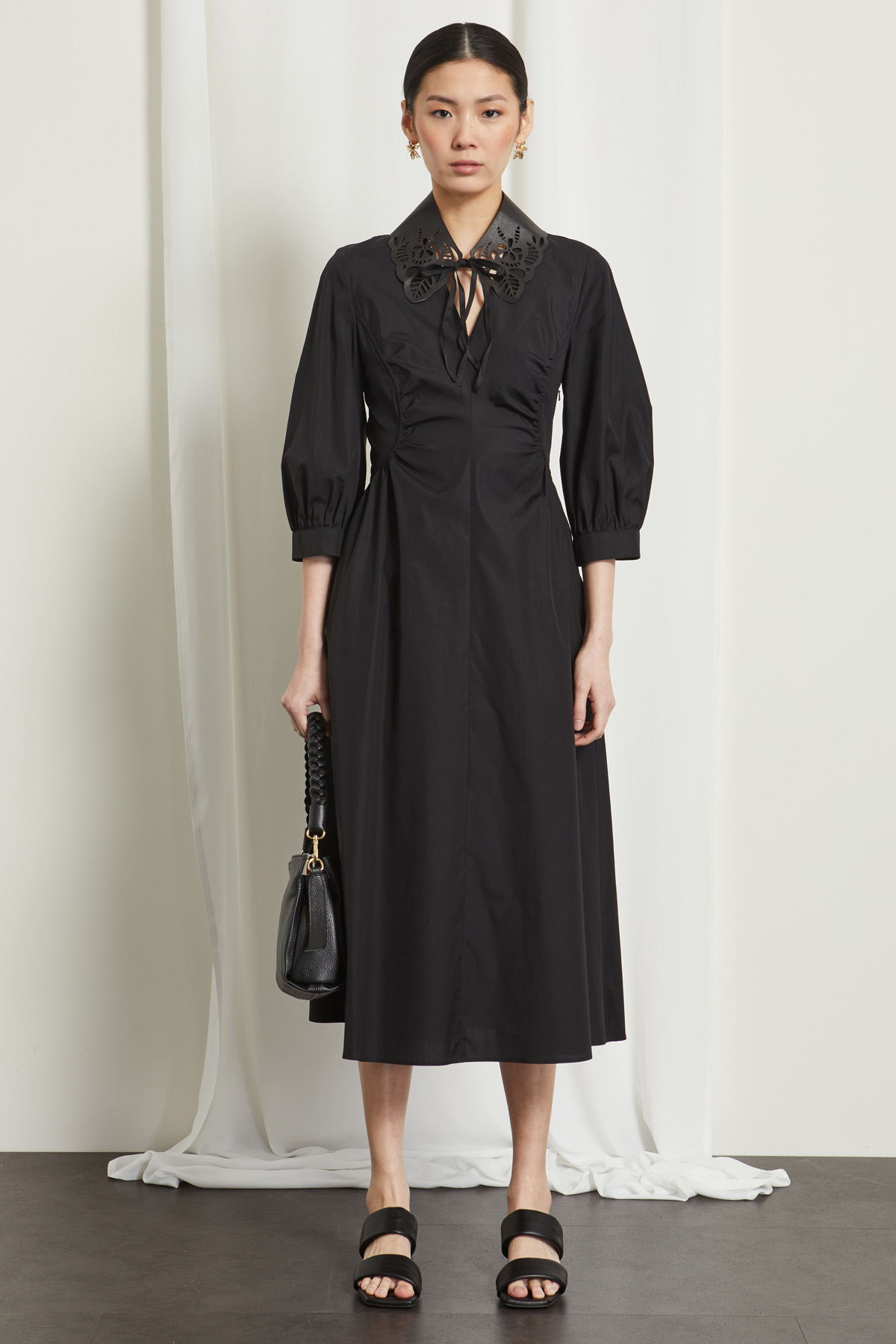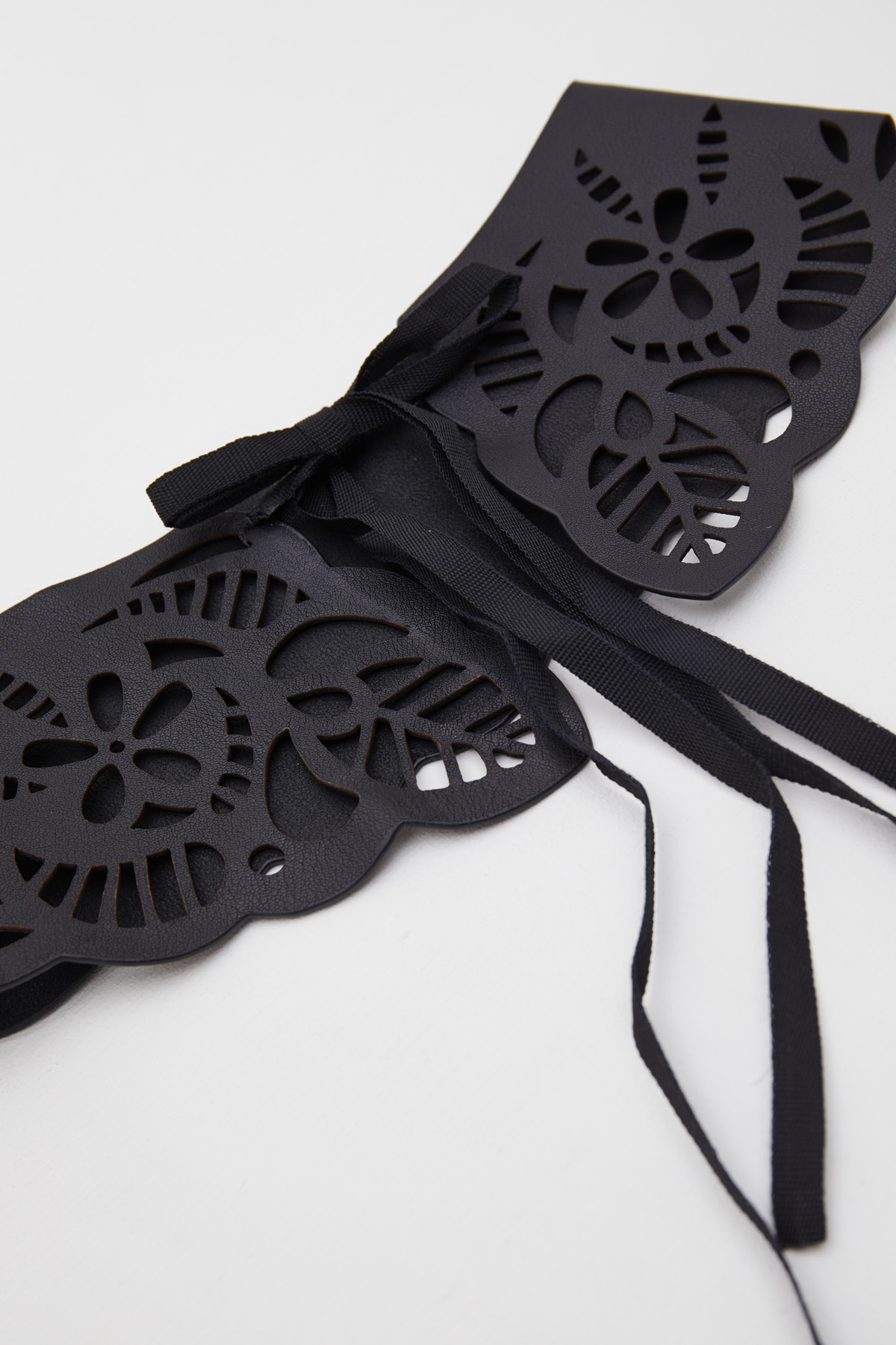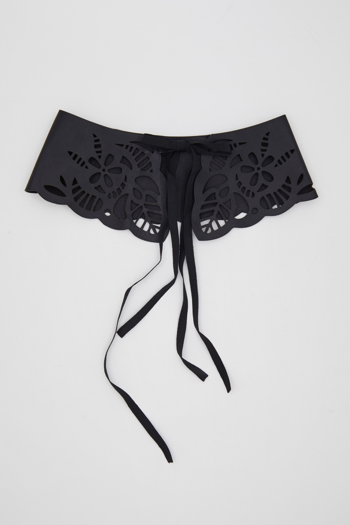 Colletto realizzato in pelle con bordo rifinito a cappetta e chiusura tramite nodo