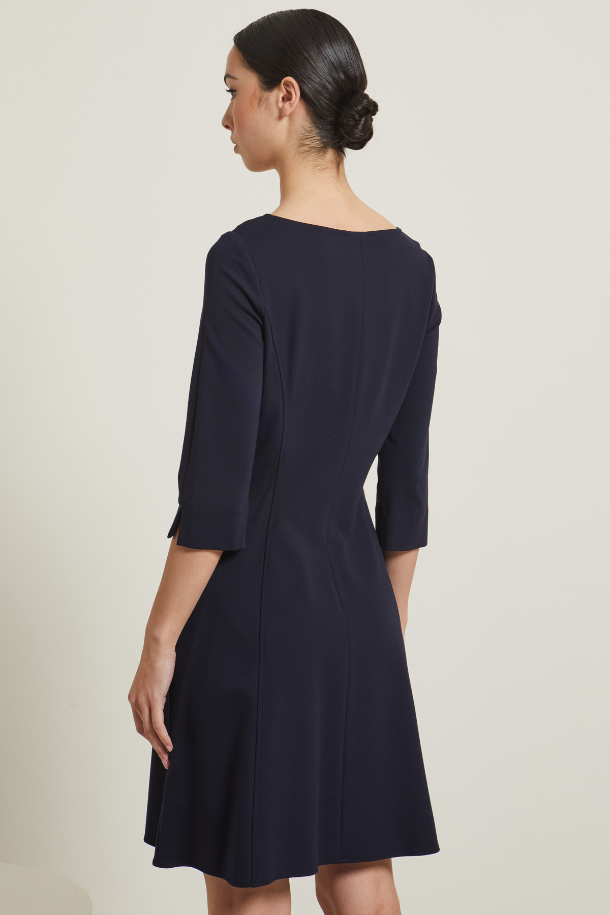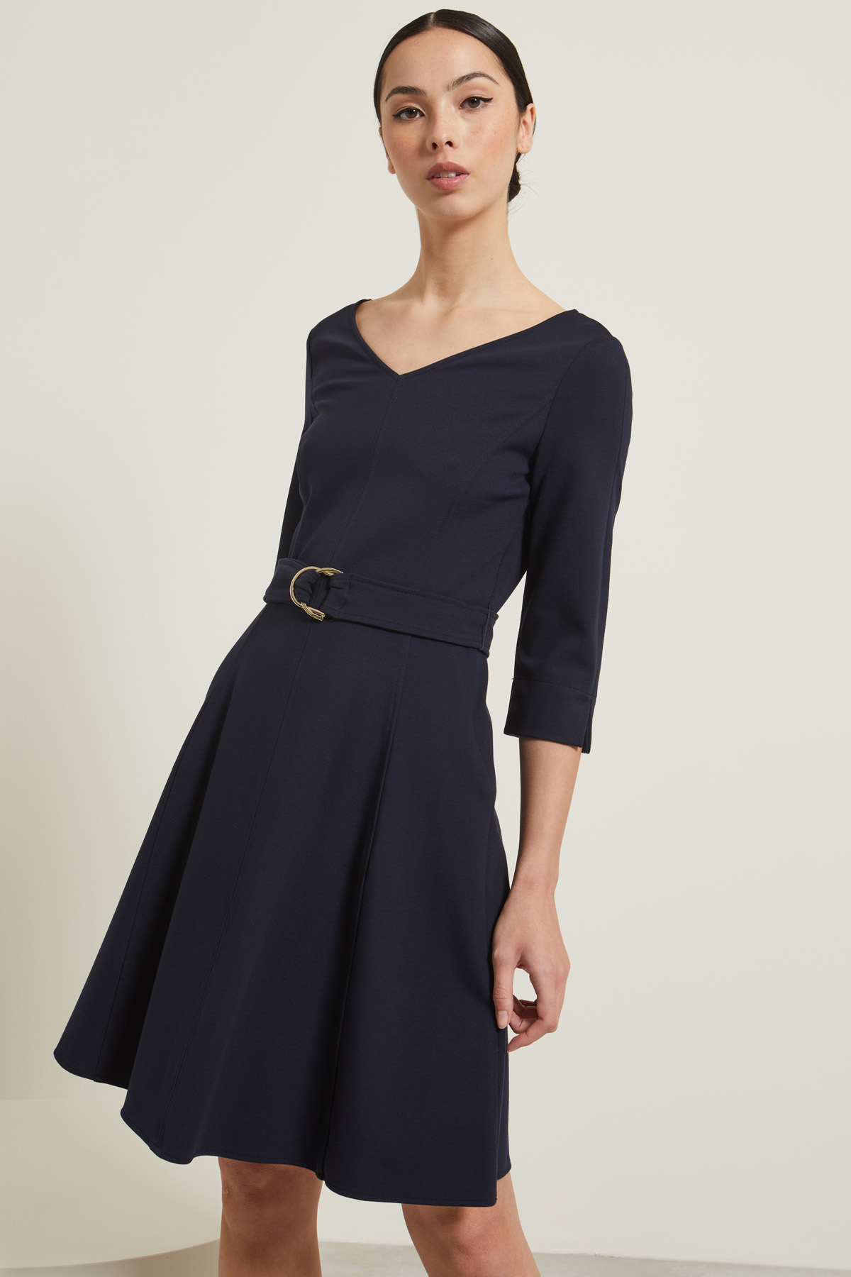 Abito corto dalla linea sfiancata realizzato in jersey di misto viscosa stretch, con scollo a V e maniche tre quarti. Allacciatura tramite zip invisibile sul fianco e cintura coordinata con fibbia in metallo.