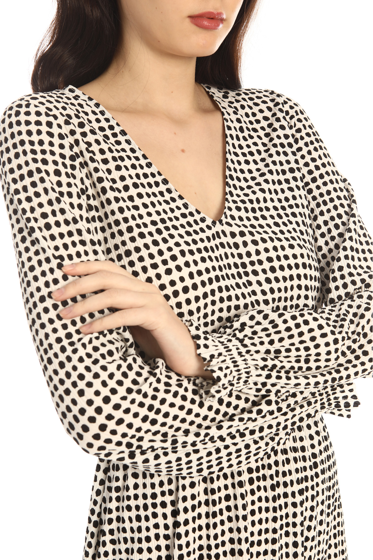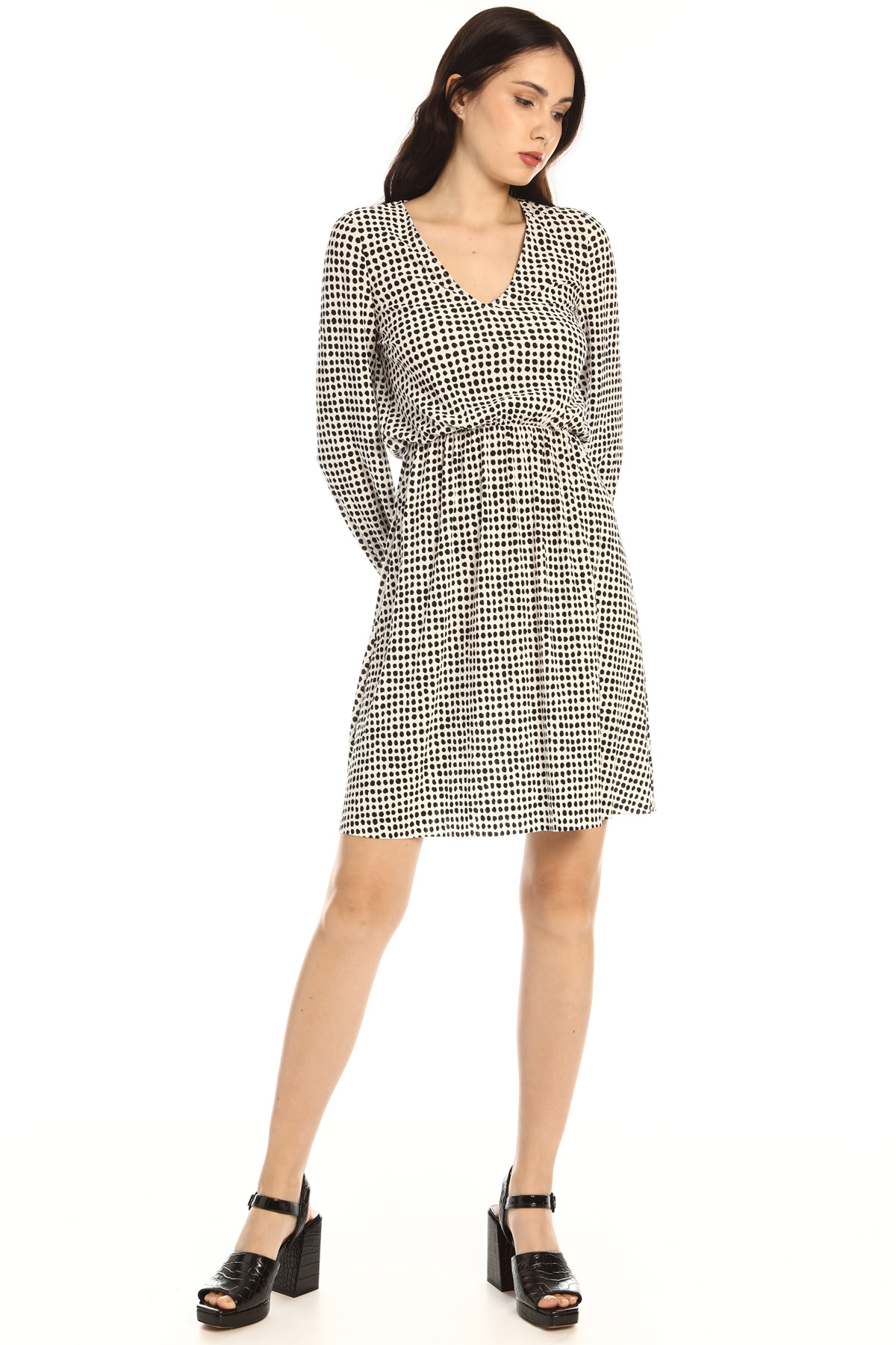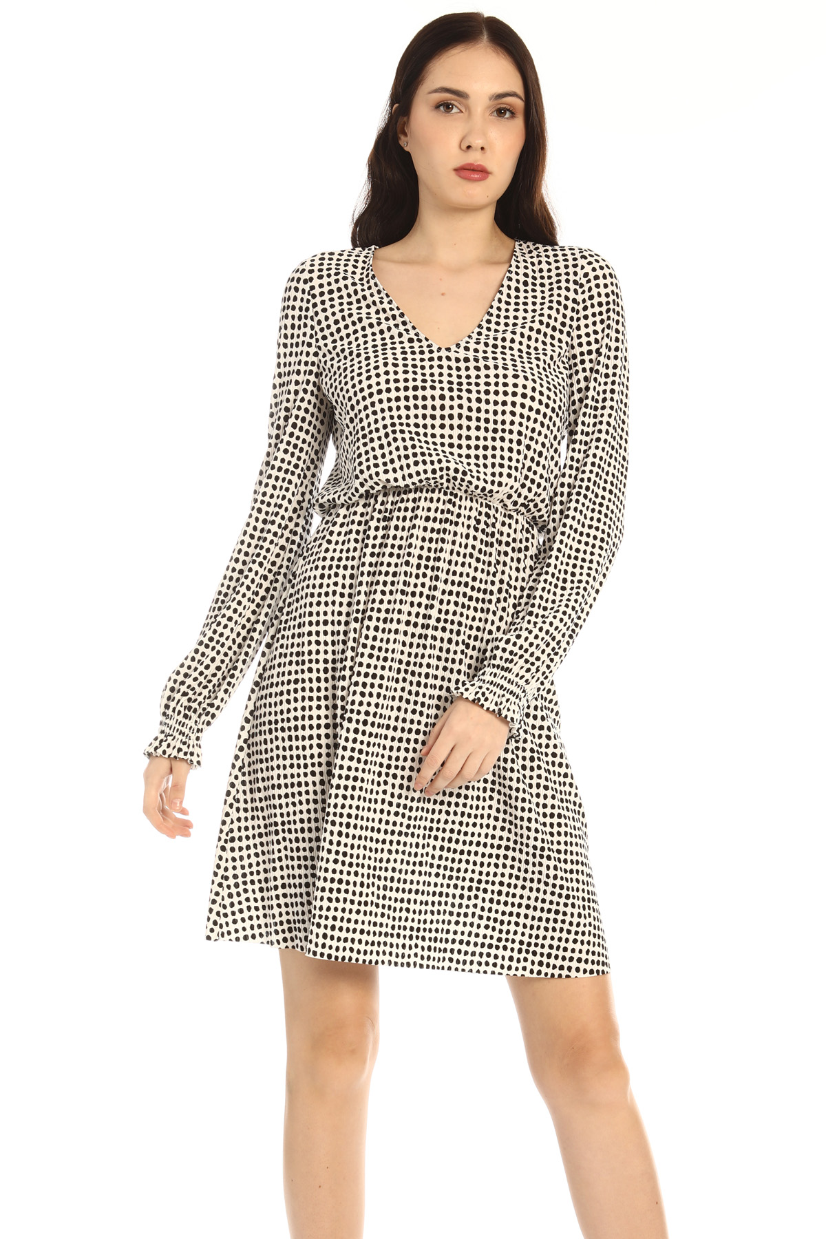 Abito dalla linea morbida realizzato in jersey plissè stretch stampato, con scollo a V, maniche lunghe con polsino elastico e inserto elastico in vita.