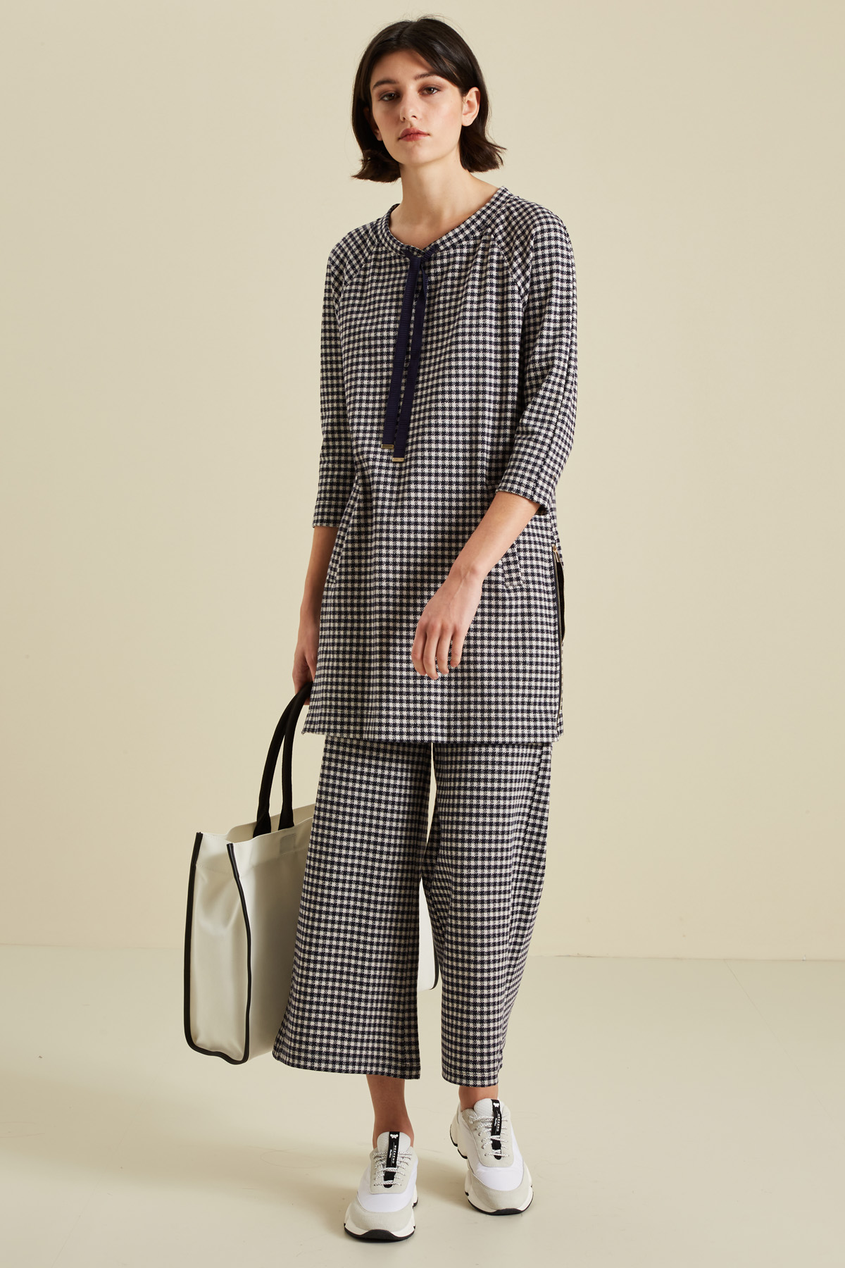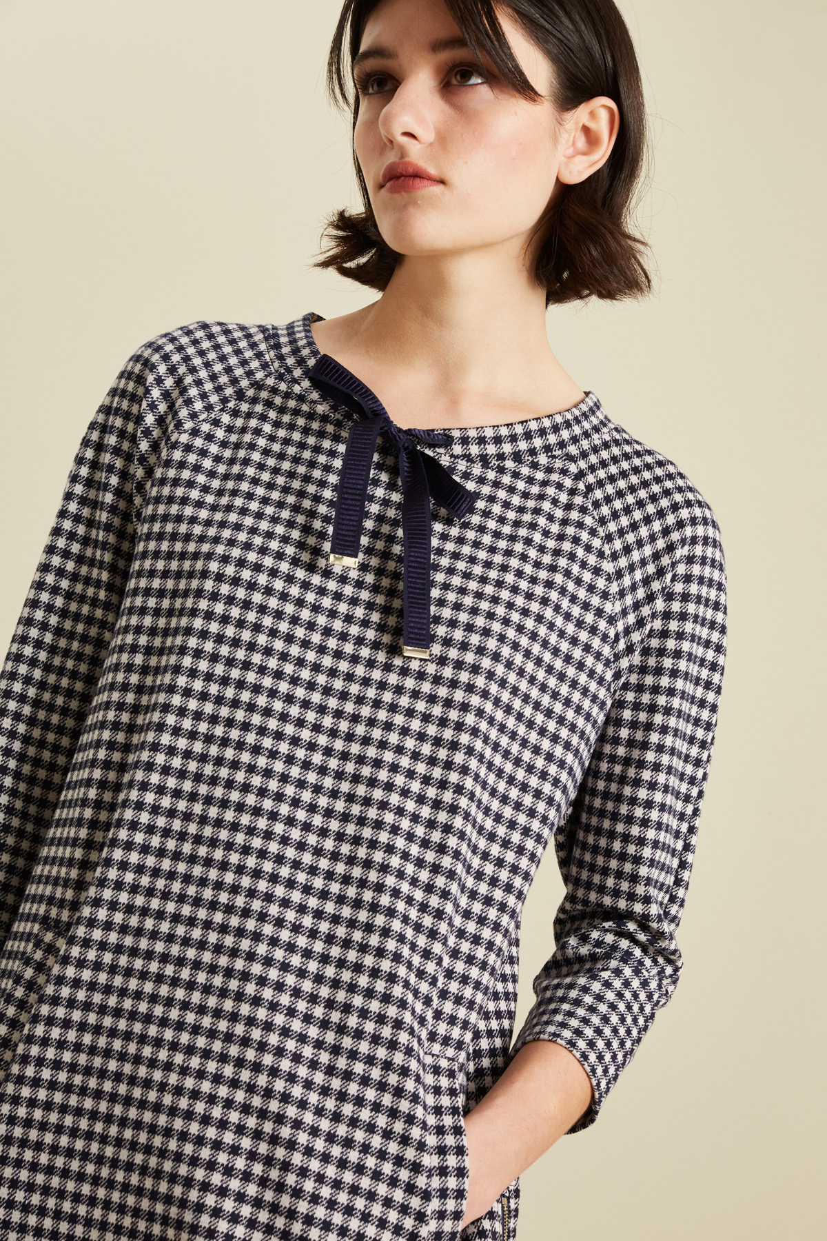 Abito corto dalla linea dritta realizzato in jersey di misto cotone e viscosa tinto filo, scollo rotondo con coulisse e nastri da annodare, maniche lunghe raglan, tasche oblique a filetto e aperture laterali tramite zip a fondo capo.