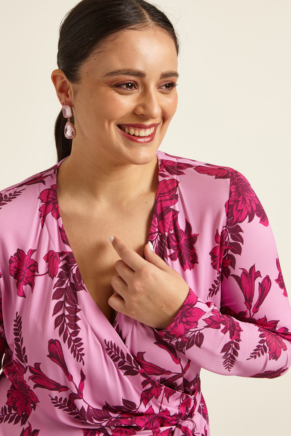 Abito a portafoglio dalla linea fluida realizzato in jersey stampato, scollatura a V con incrocio, maniche lunghe. Allacciatura incrociata tramite fusciacca.