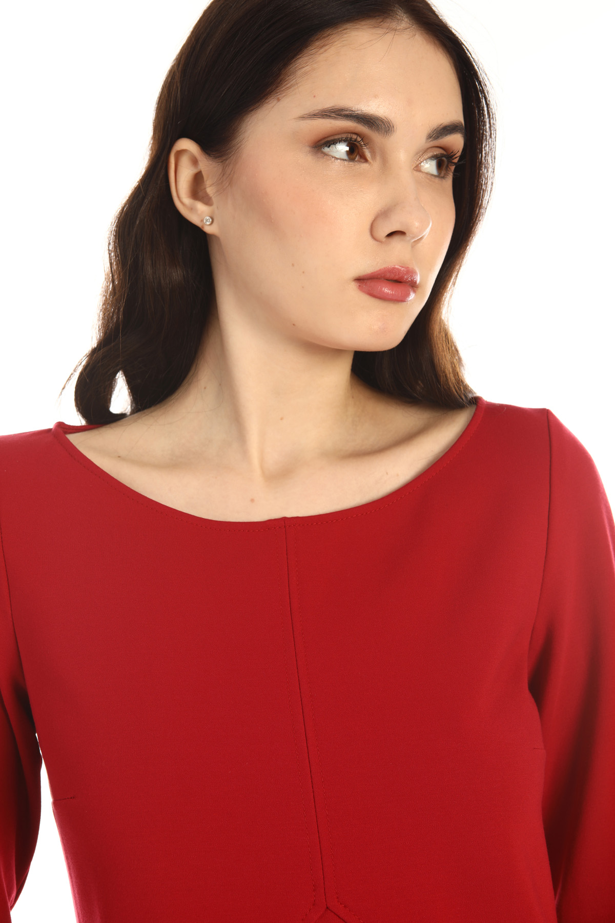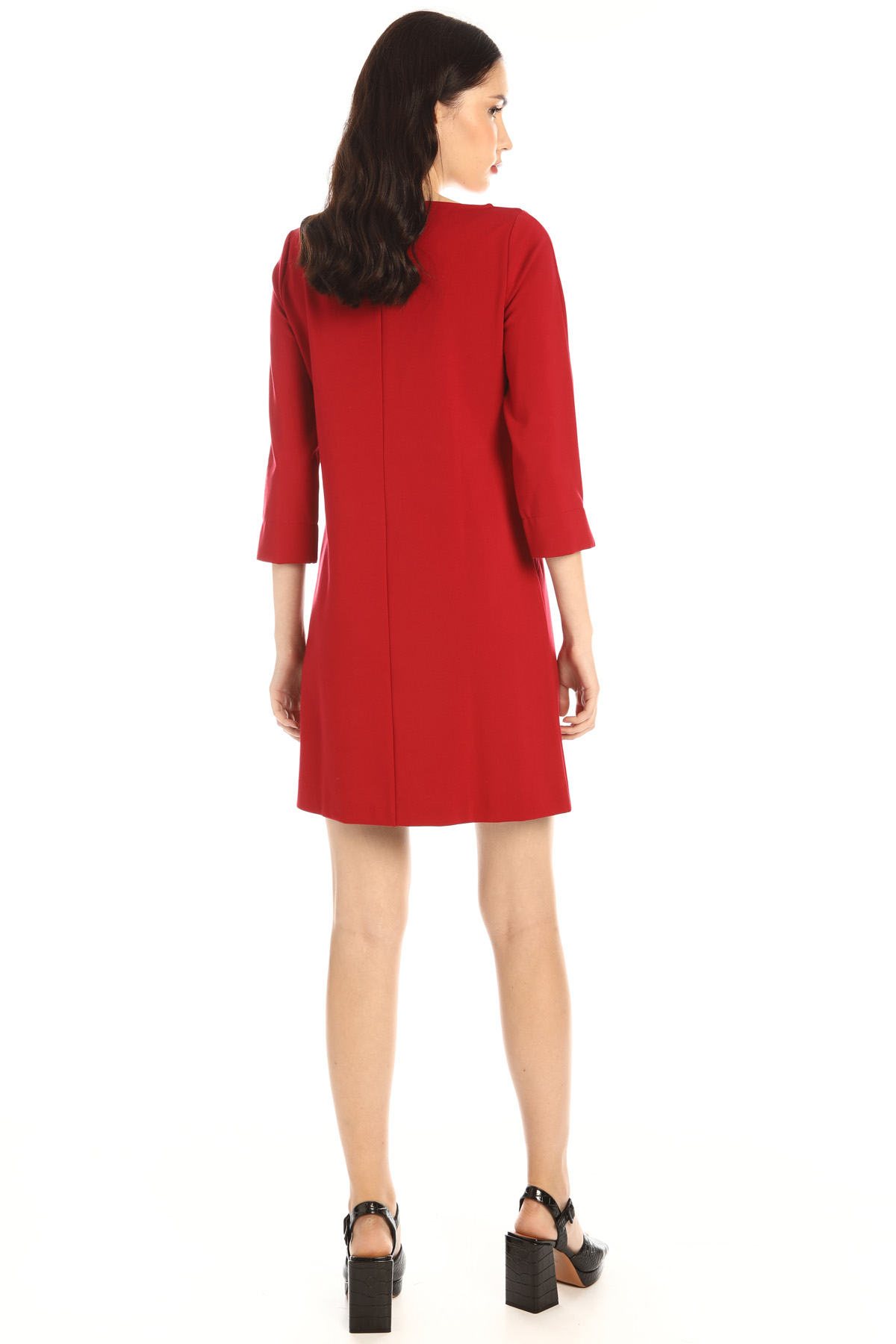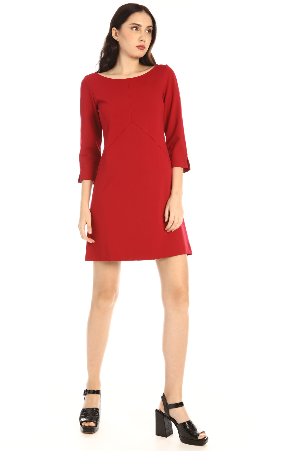 Abito dalla linea dritta realizzato in jersey pesante di misto viscosa stertch, con scollo a barchetta e maniche tre quarti con piccoli spacco al fondo.
