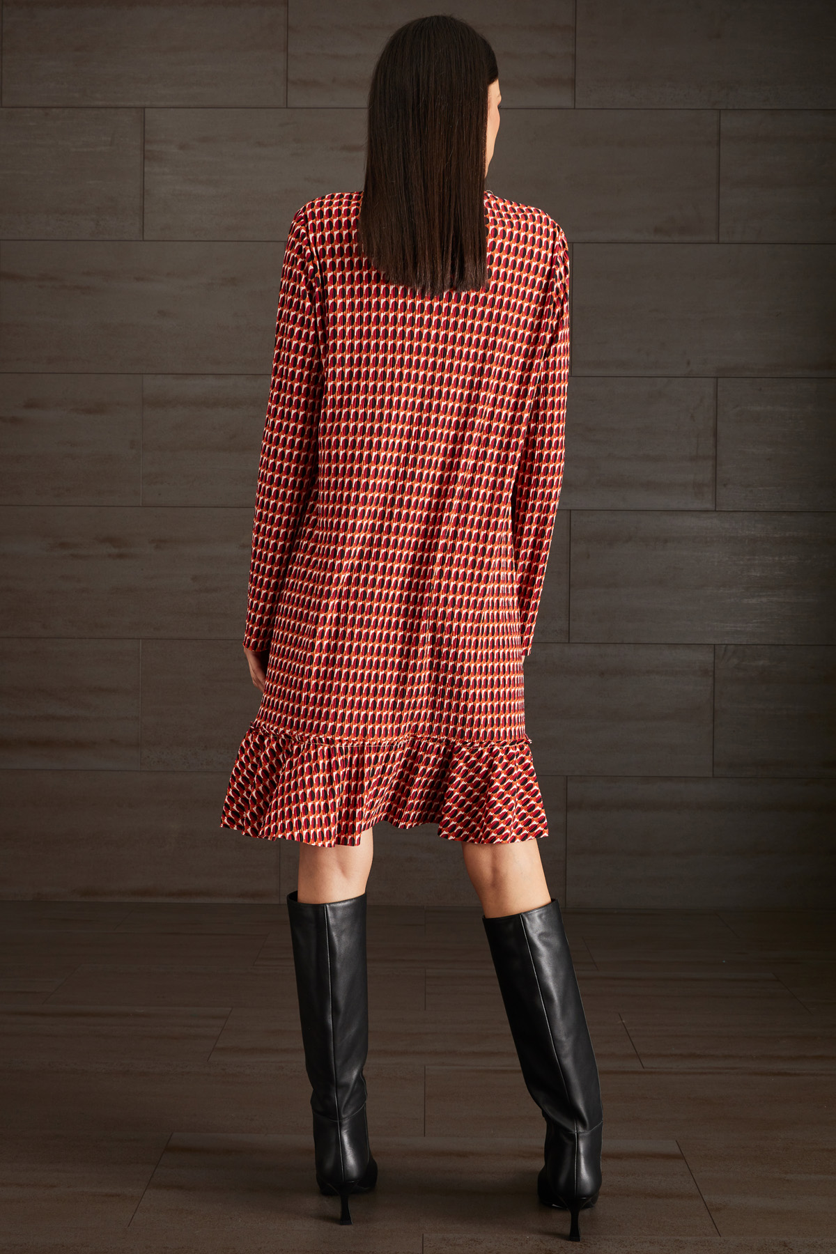 Abito dalla linea dritta realizzato in jersey creponne stampato, con collo a solino e apertura a goccia, maniche lunghe, dettaglio di balza al fondo e apertura a V con bottoni nel retro. Capo dotato di cintura tubolare in abbinamento.