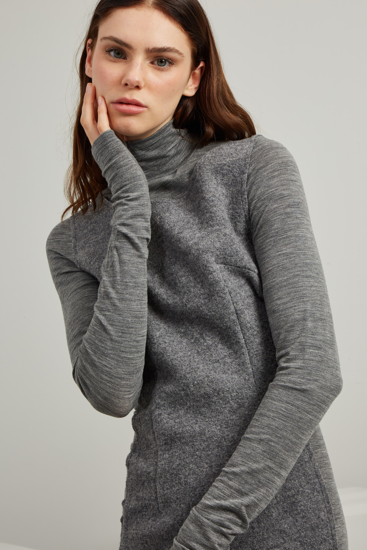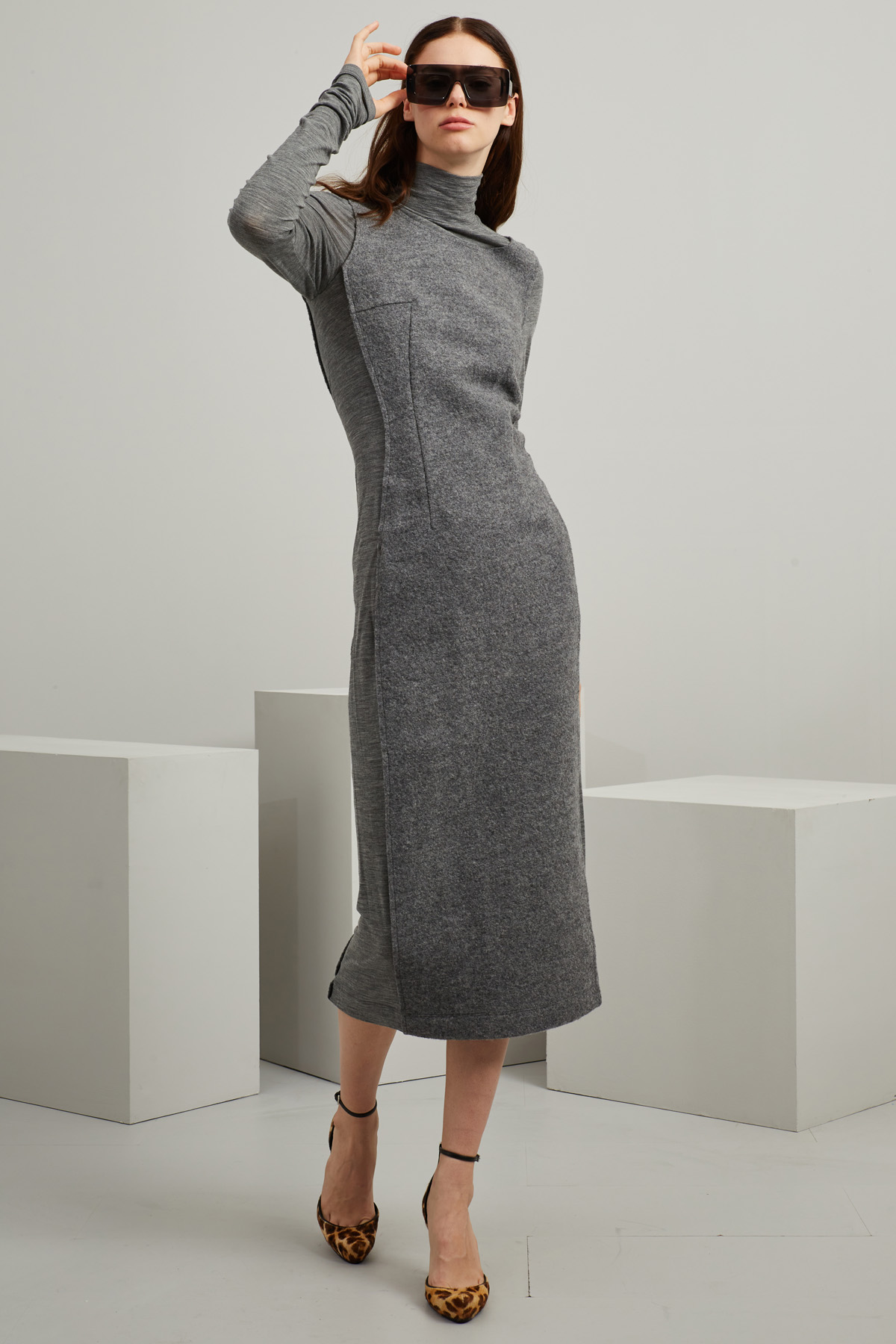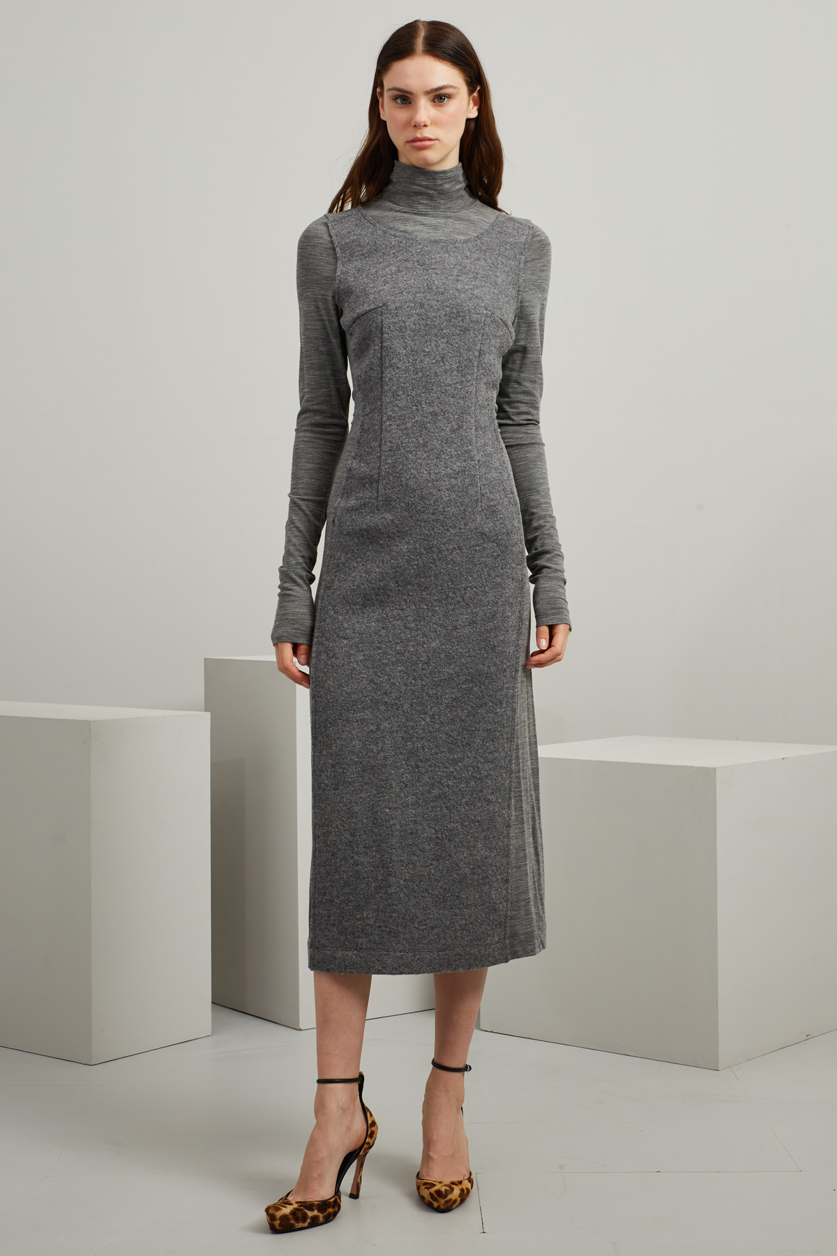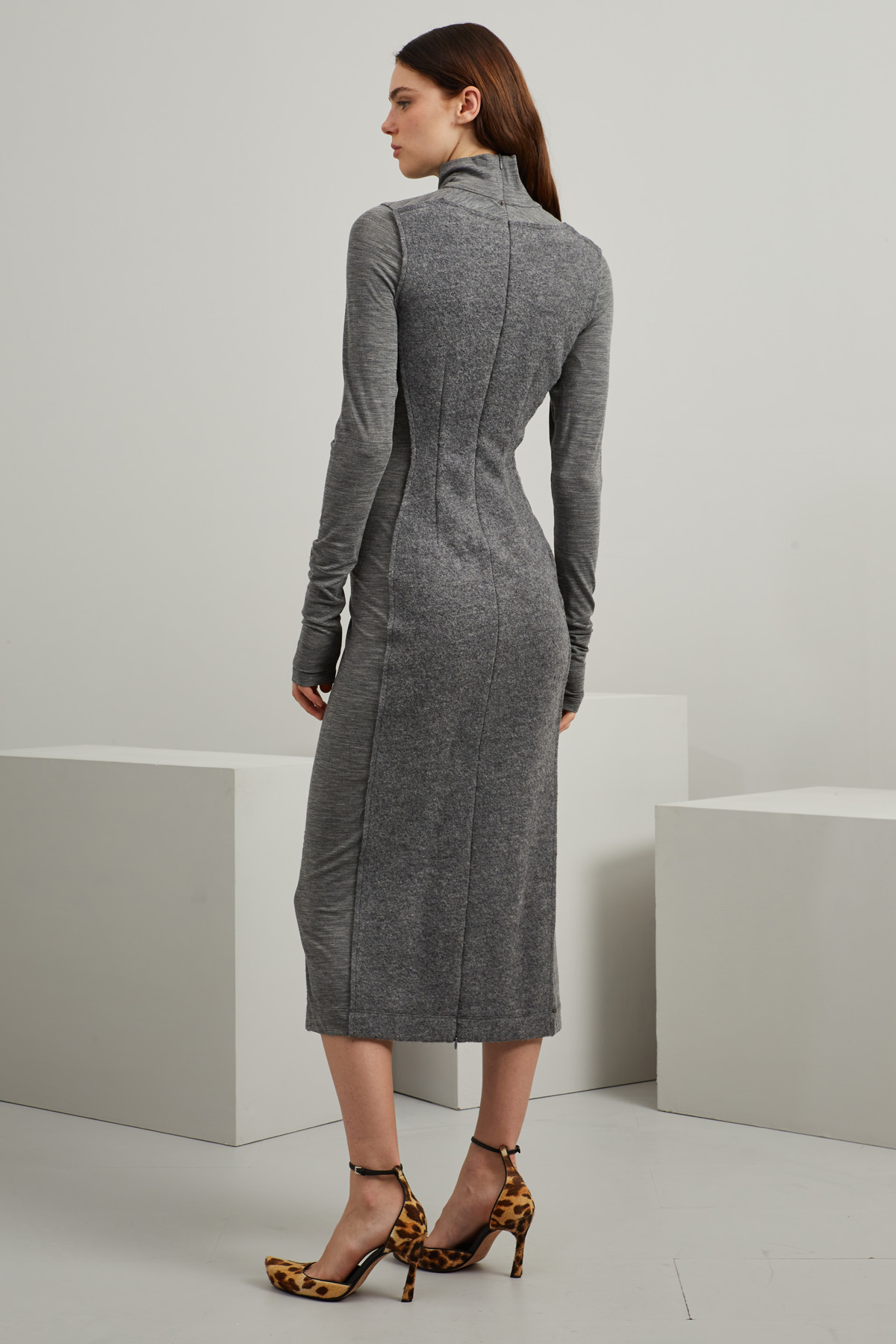 Tubino midi dalla linea semiaderente realizzato in tessuto garzato di pura lana, con inserti in jersey di lana stretch, collo alto, maniche lunghe e allacciatura tramite zip nel retro.