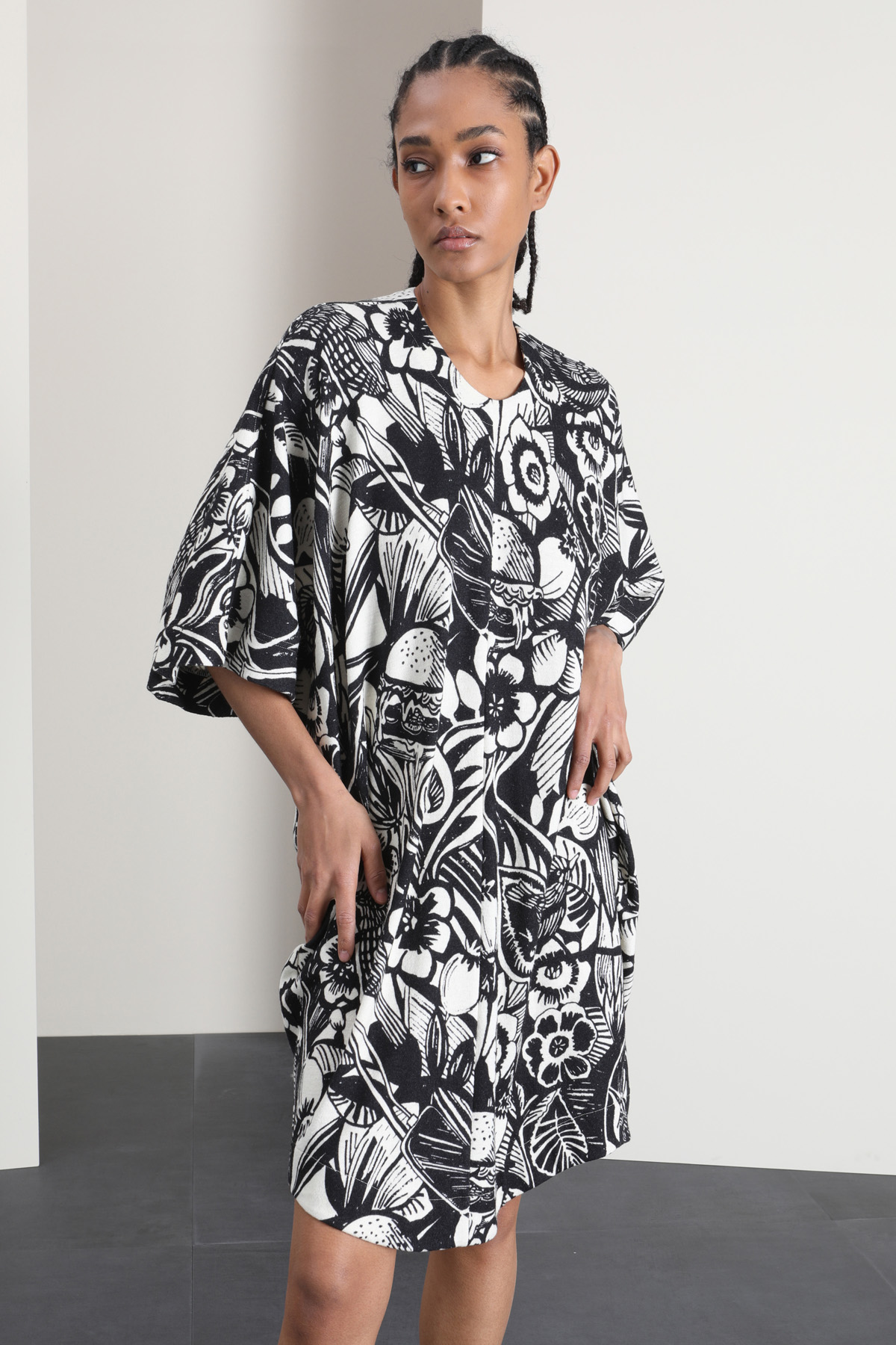 Abito dalla linea over realizzato in maglia di lana e cotone stampato, con scollo a giro, maniche tre quarti a kimono e allacciatura tramite zip invisibile sul retro.