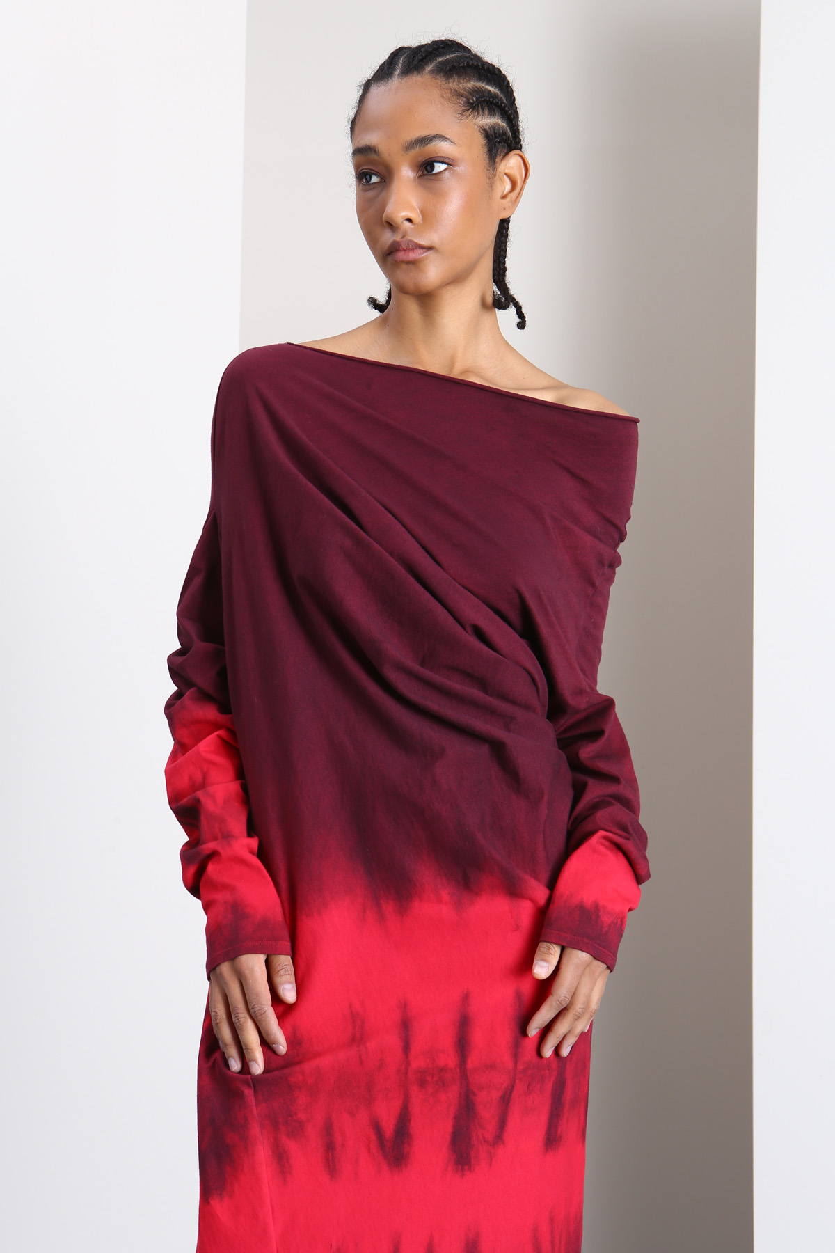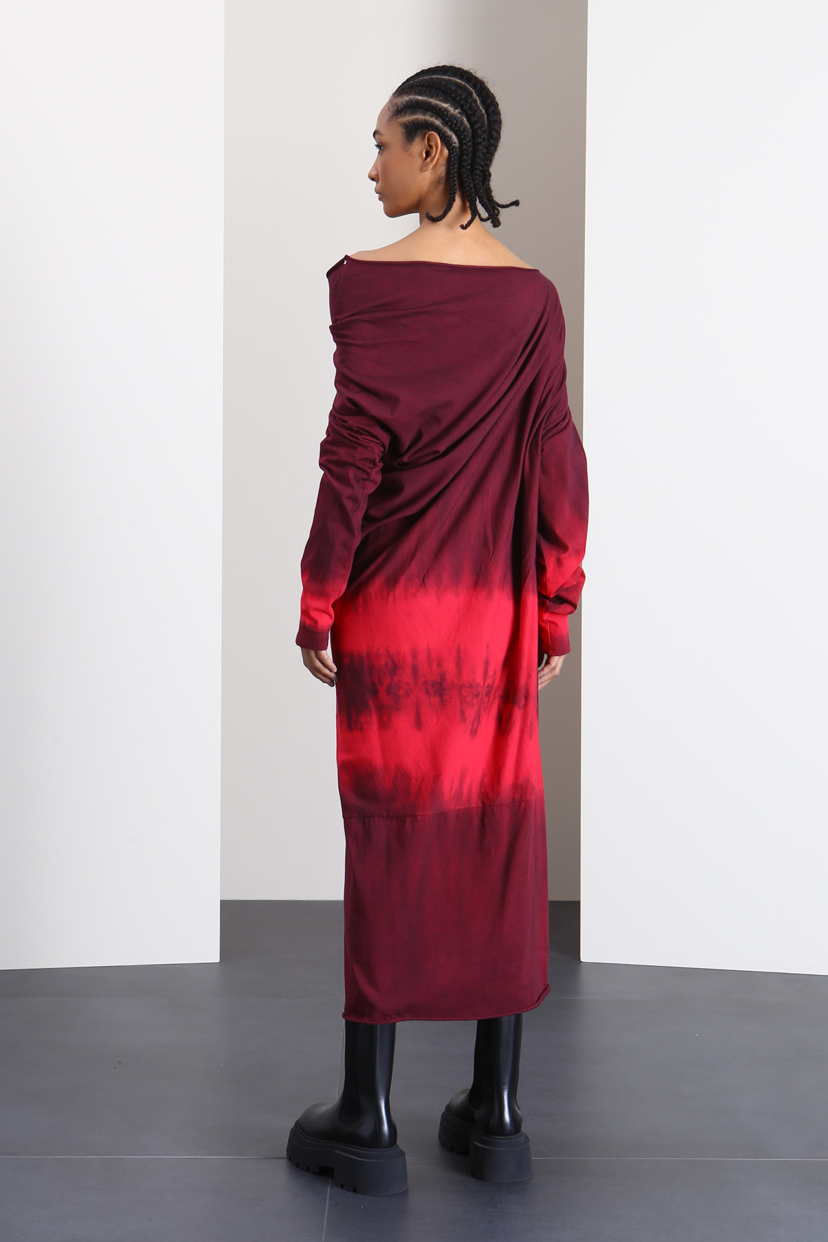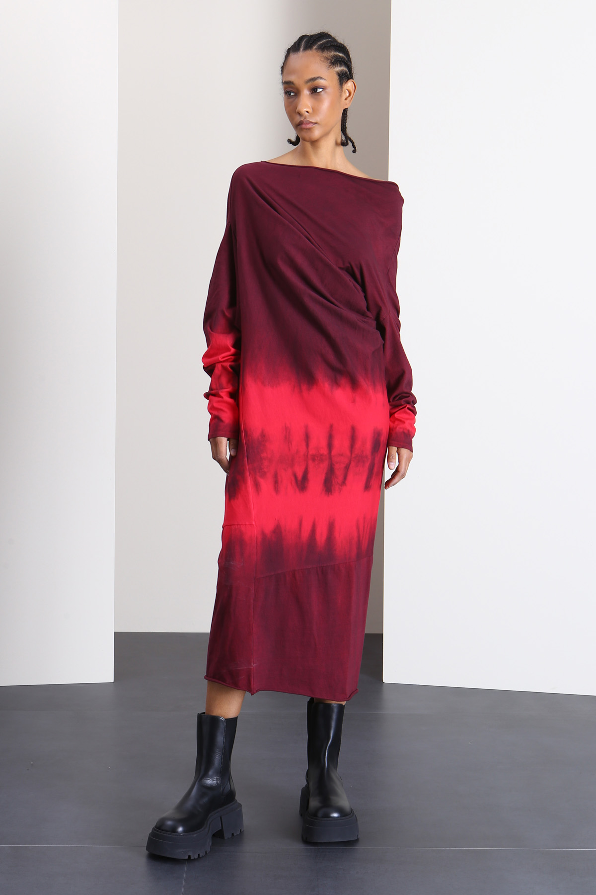 Abito longuette dalla linea dritta realizzato in jersey di puro cotone, con effetto tye-dye, motivo drappeggiato, scollo asimmetrico, maniche lunghe e profili arrotolati.