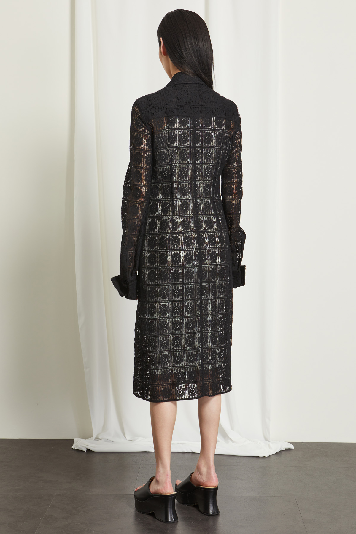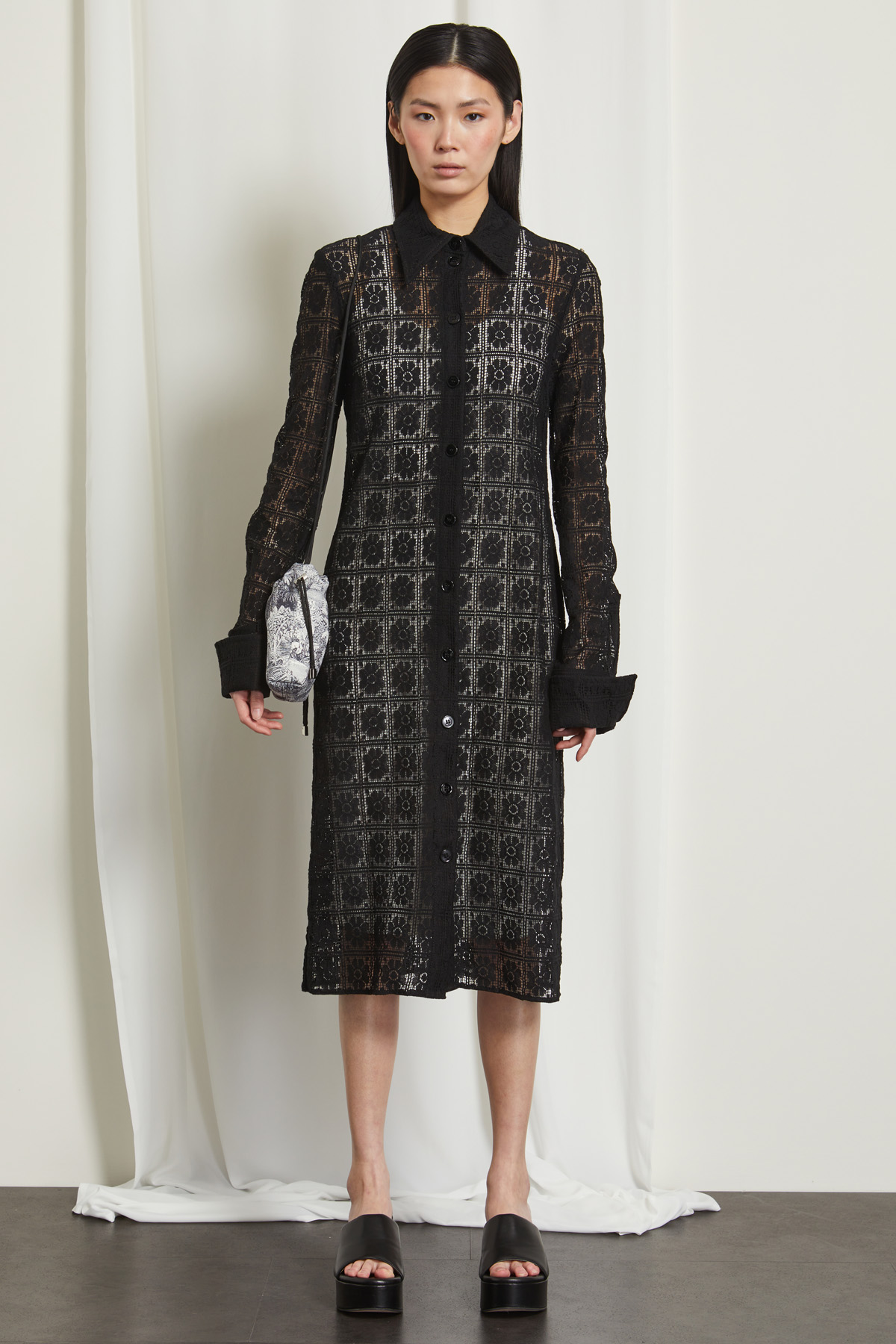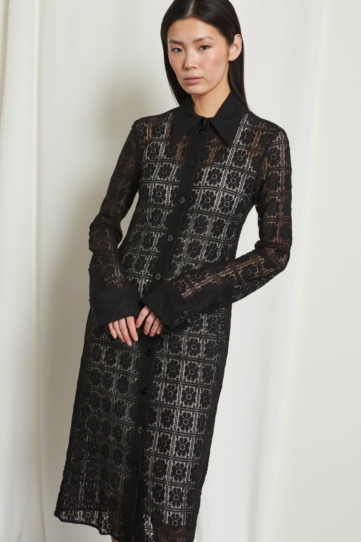 Chemisier dalla linea aderente realizzato in pizzo macramè di misto cotone, con colletto classico, maniche lunghe con polsino alto e bottoni, carrè nel retro. Allacciatura tramite bottoni. Abito lungo smanicato abbinato in jersey di cotone stretch con scollo a giro.