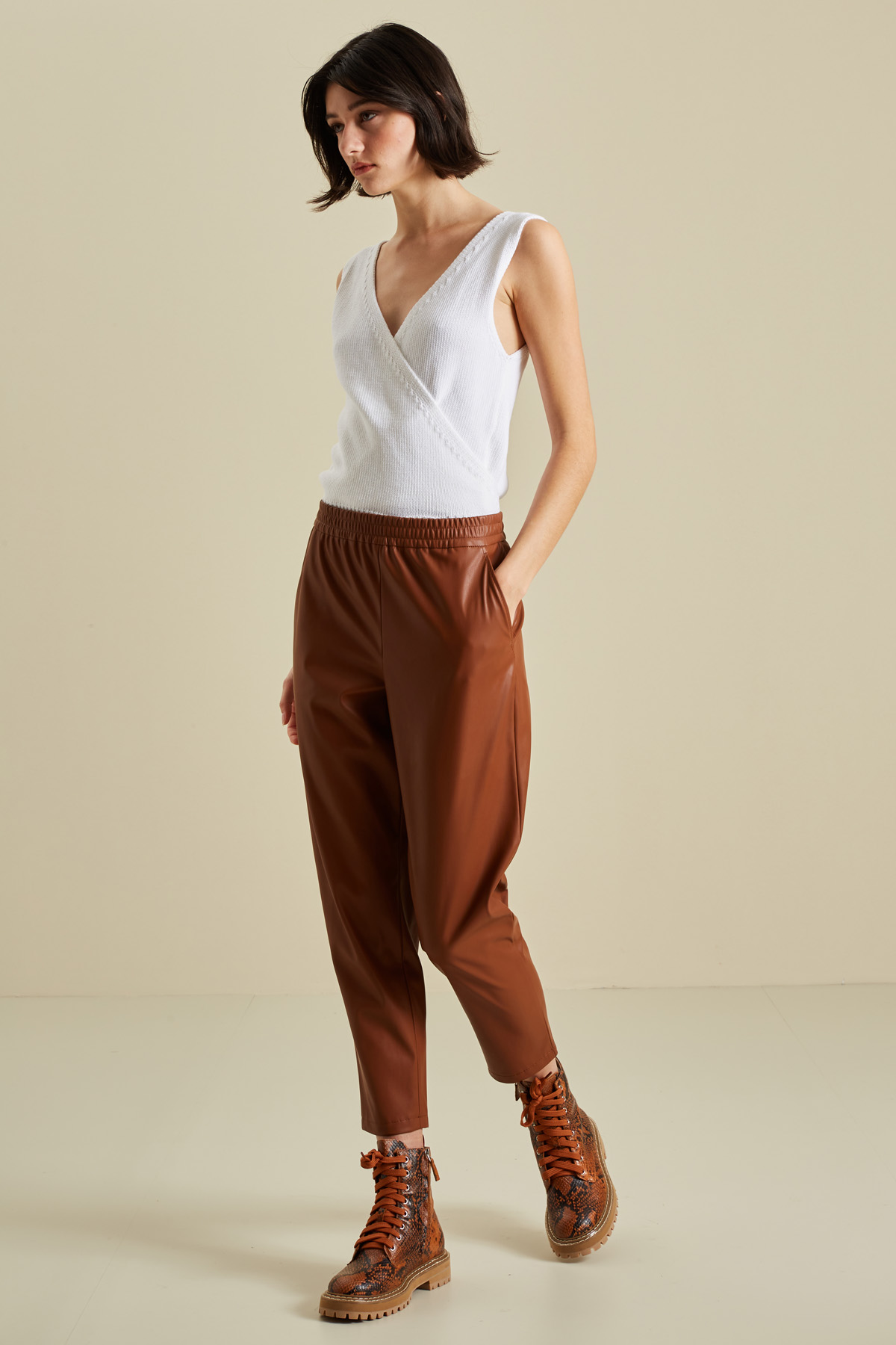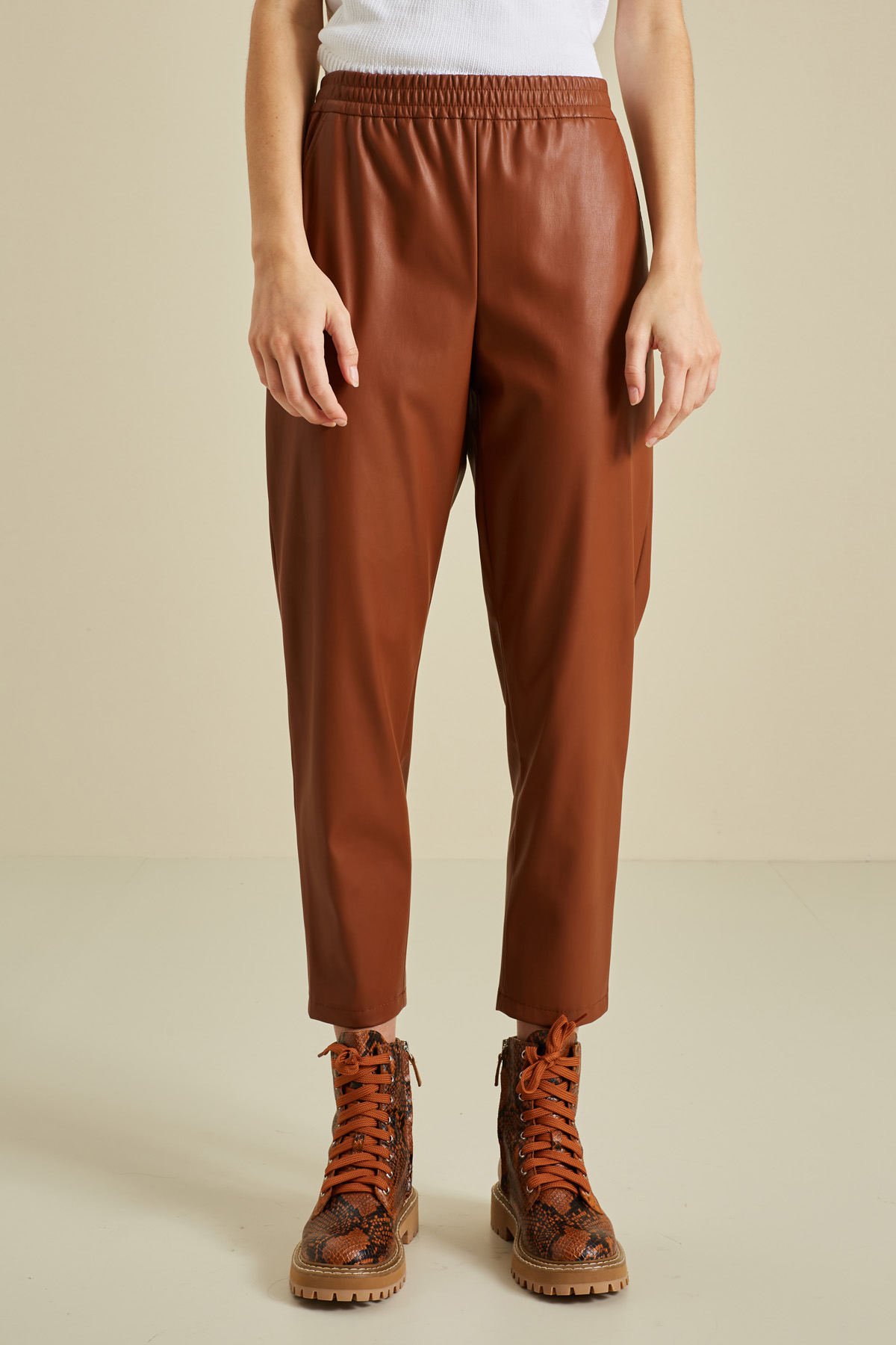 Pantaloni carrot realizzati in similpelle, con inserto elastico in vita e tasche alla francese ai fianchi.