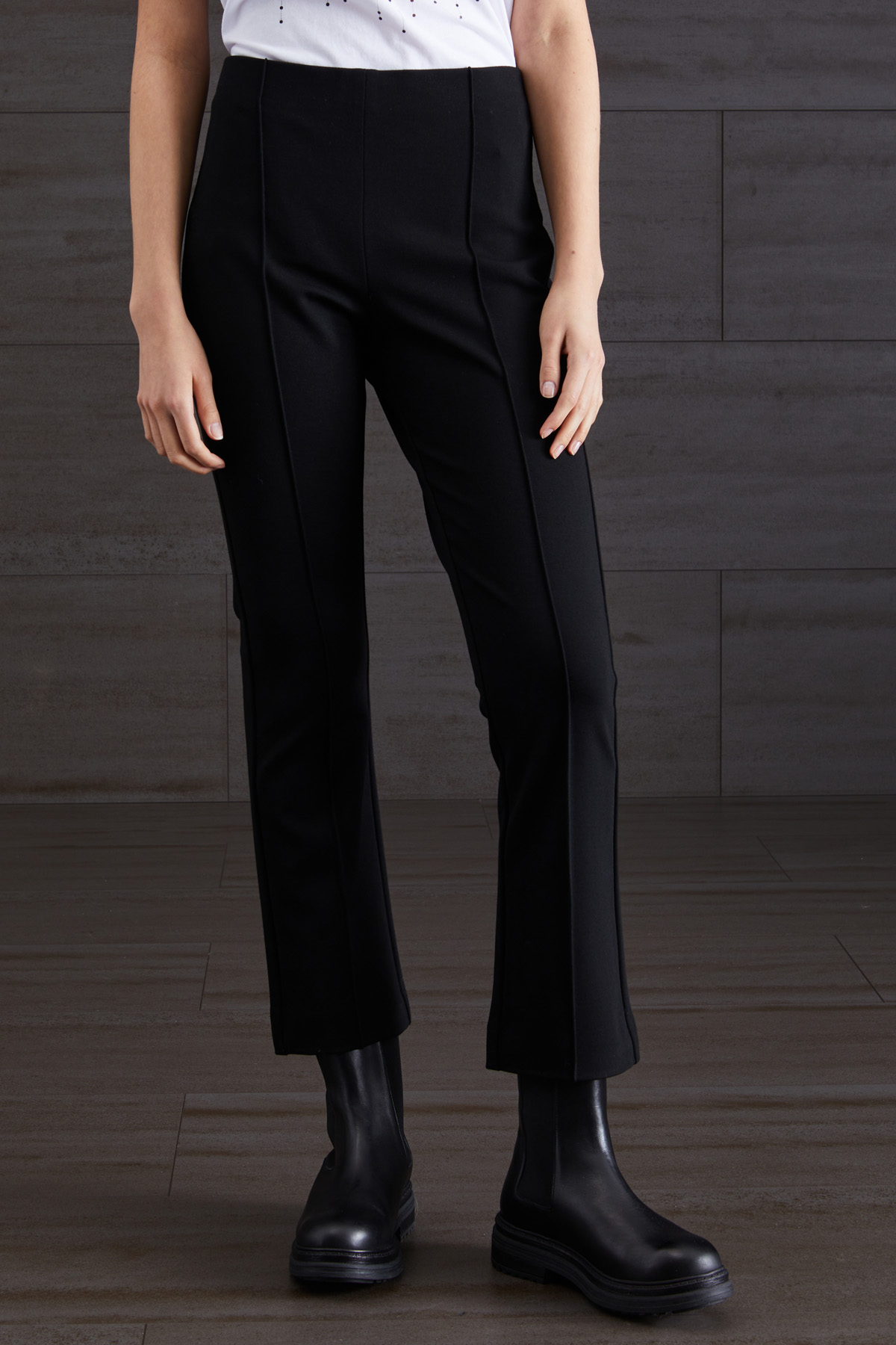 Pantaloni dalla linea aderente realizzati in jersey di misto viscosa stretch con elastico in vita e piega cucita in lunghezza.