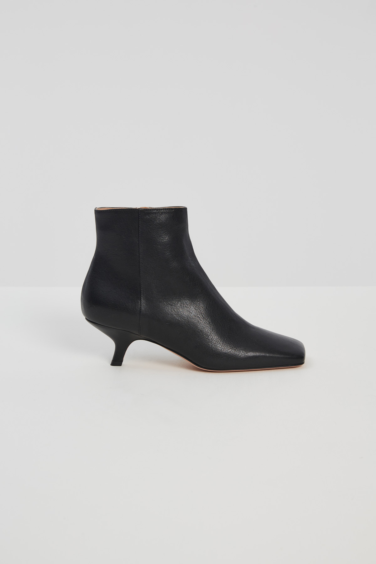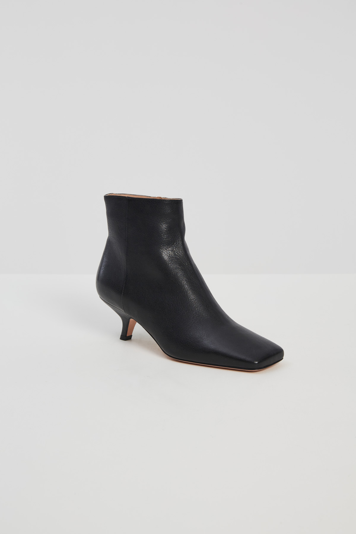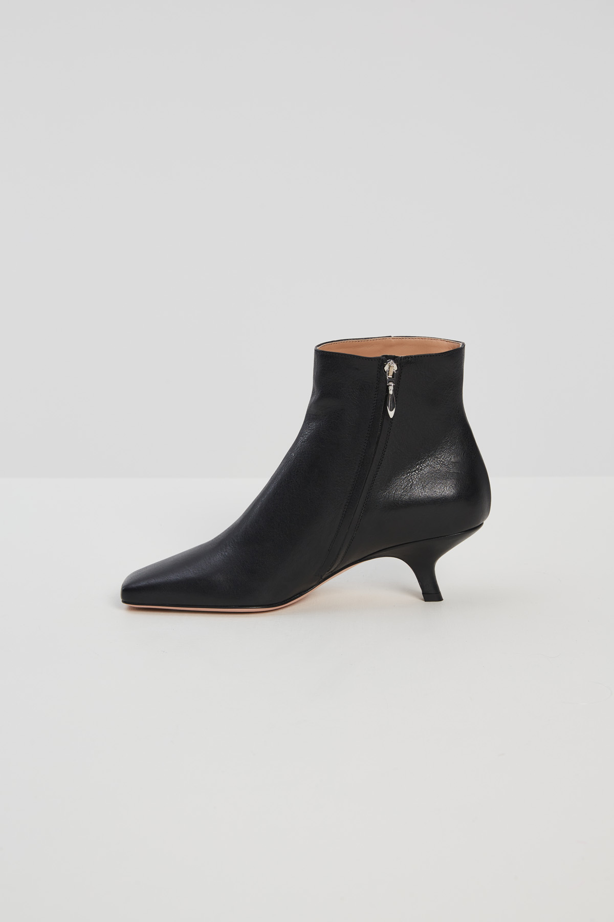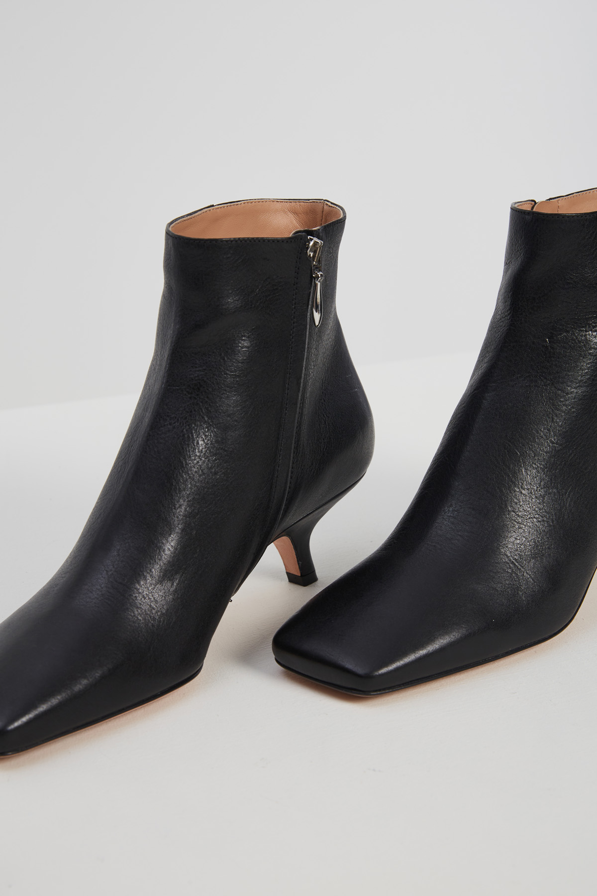 Stivaletti bassi realizzati in vera pelle, con punta squadrata e tacco rientrante. Chiusura tramite zip invisibile sul lato interno. Fodera in pelle e suola in cuoio.