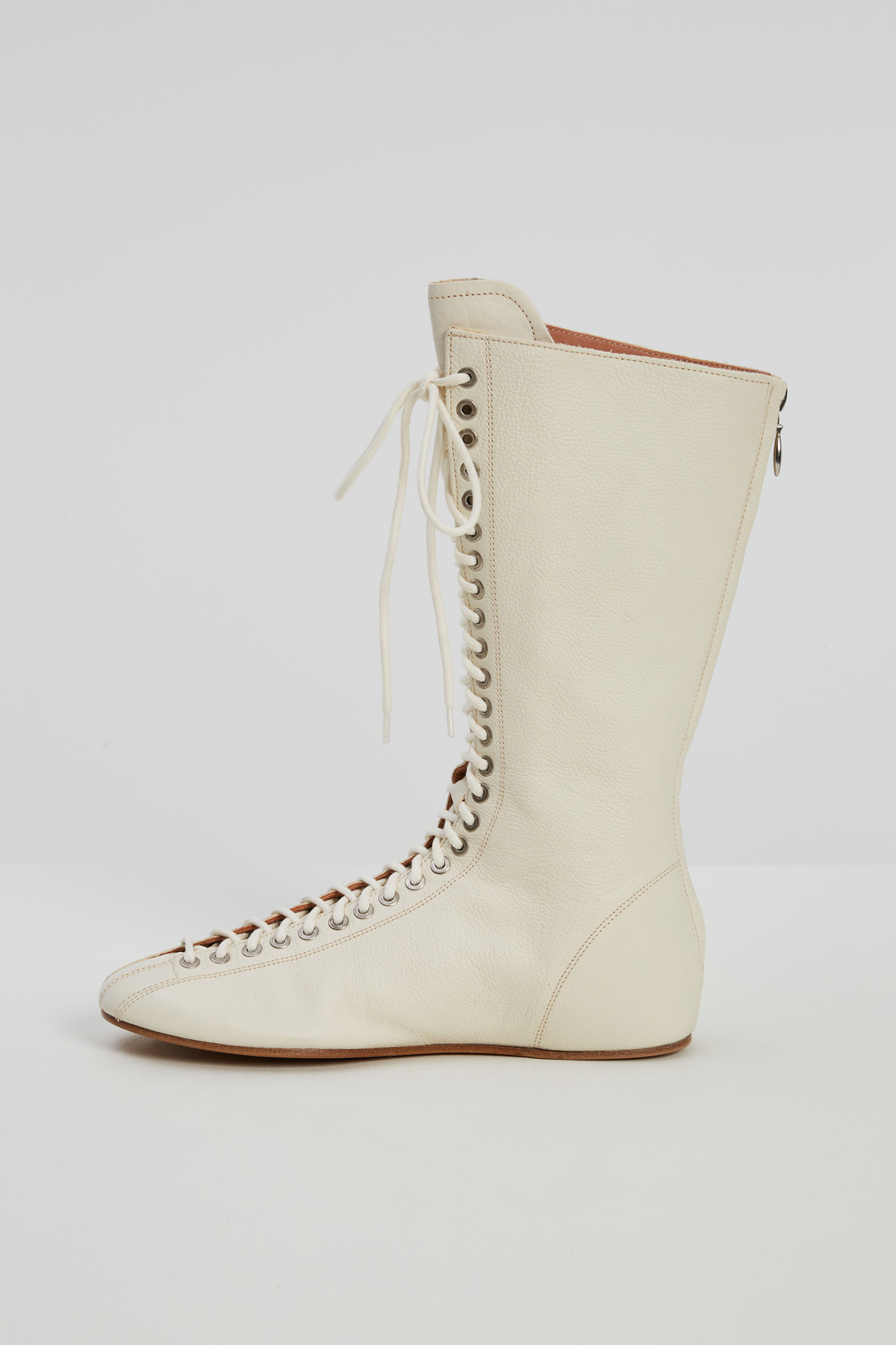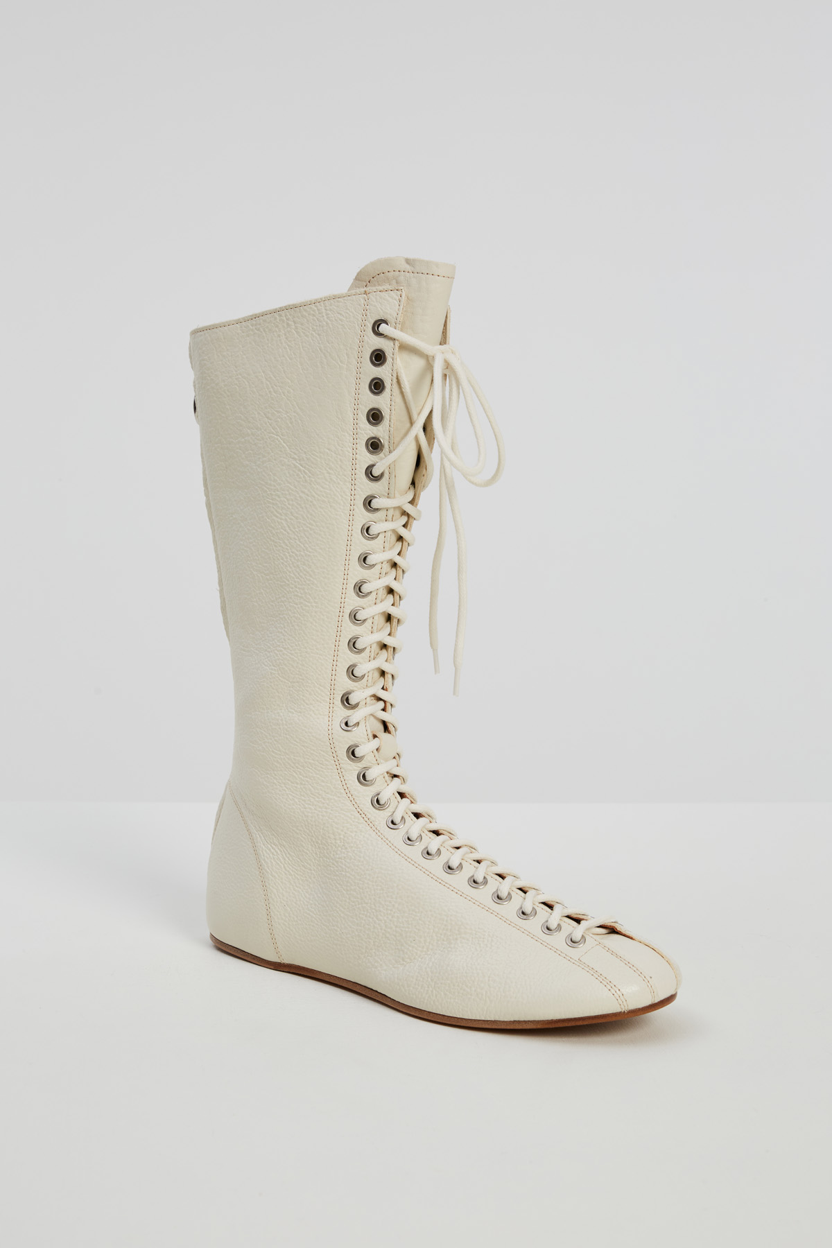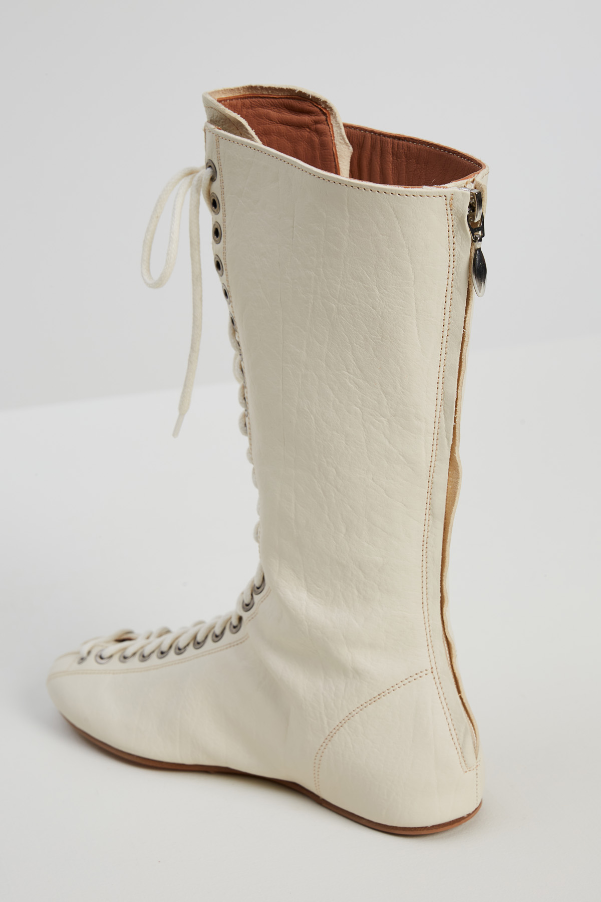 Stivali stile boxeur realizzati in vera pelle martellata, con punta arrotondata. Chiusura tramite lacci e zip a tutta lunghezza nel retro. Fodera in pelle e suola in cuoio.