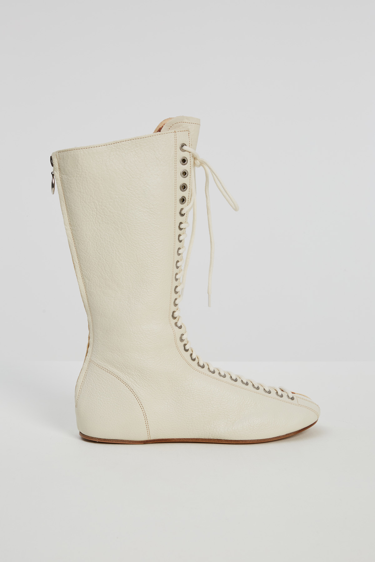 Stivali stile boxer realizzati in vera pelle martellata con punta arrotondata. Chiusura tramite lacci e zip integrale sul retro. Fodera in pelle e suola in cuoio.
