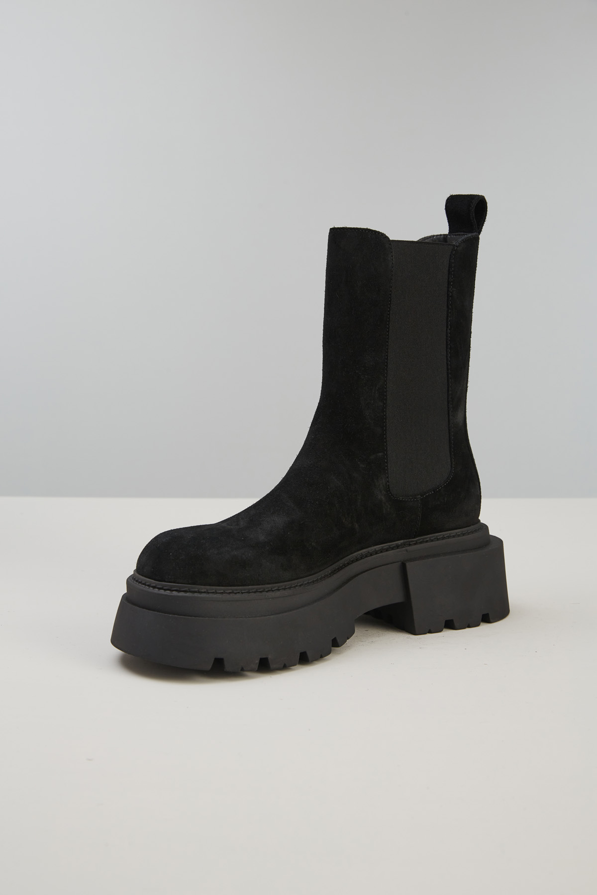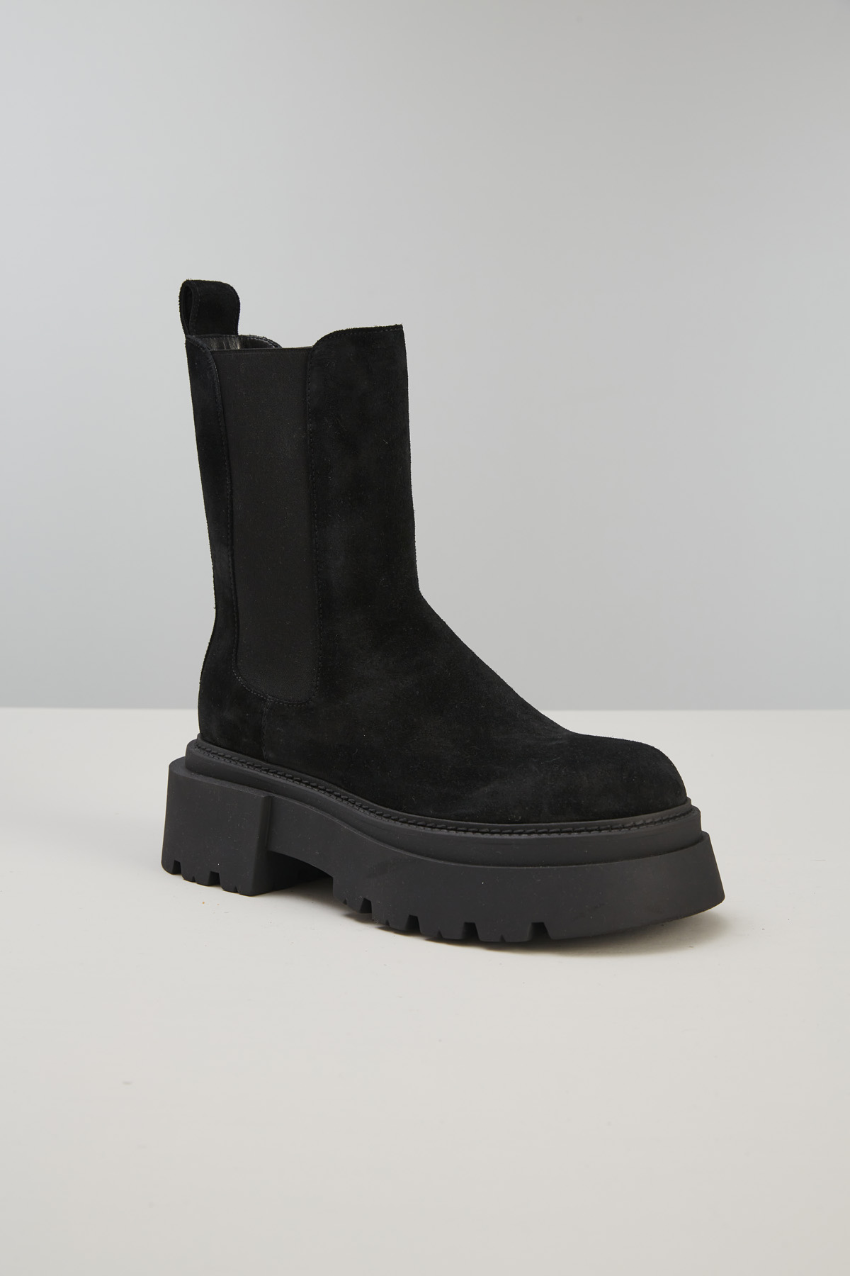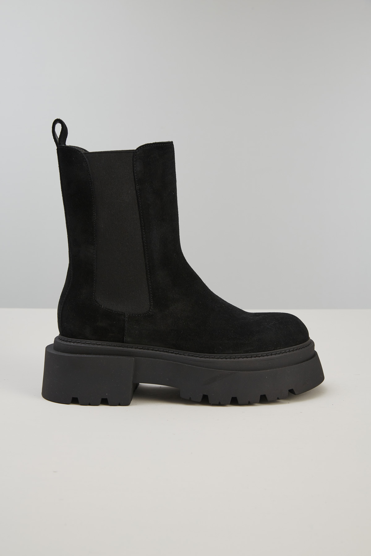 Stivaletti realizzati in suede con inserti elastici ai lati, fodera in pelle e suola trekking in gomma.