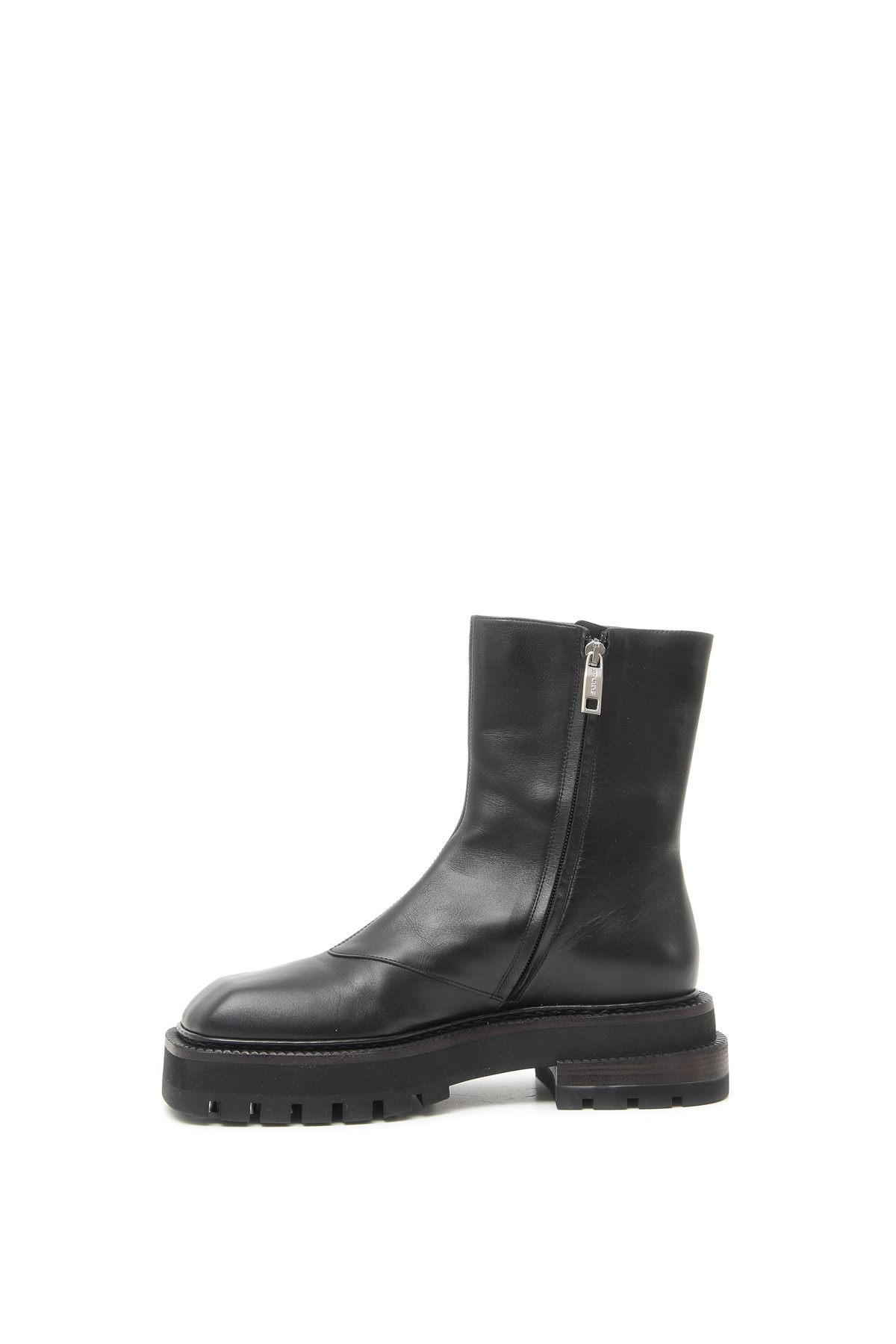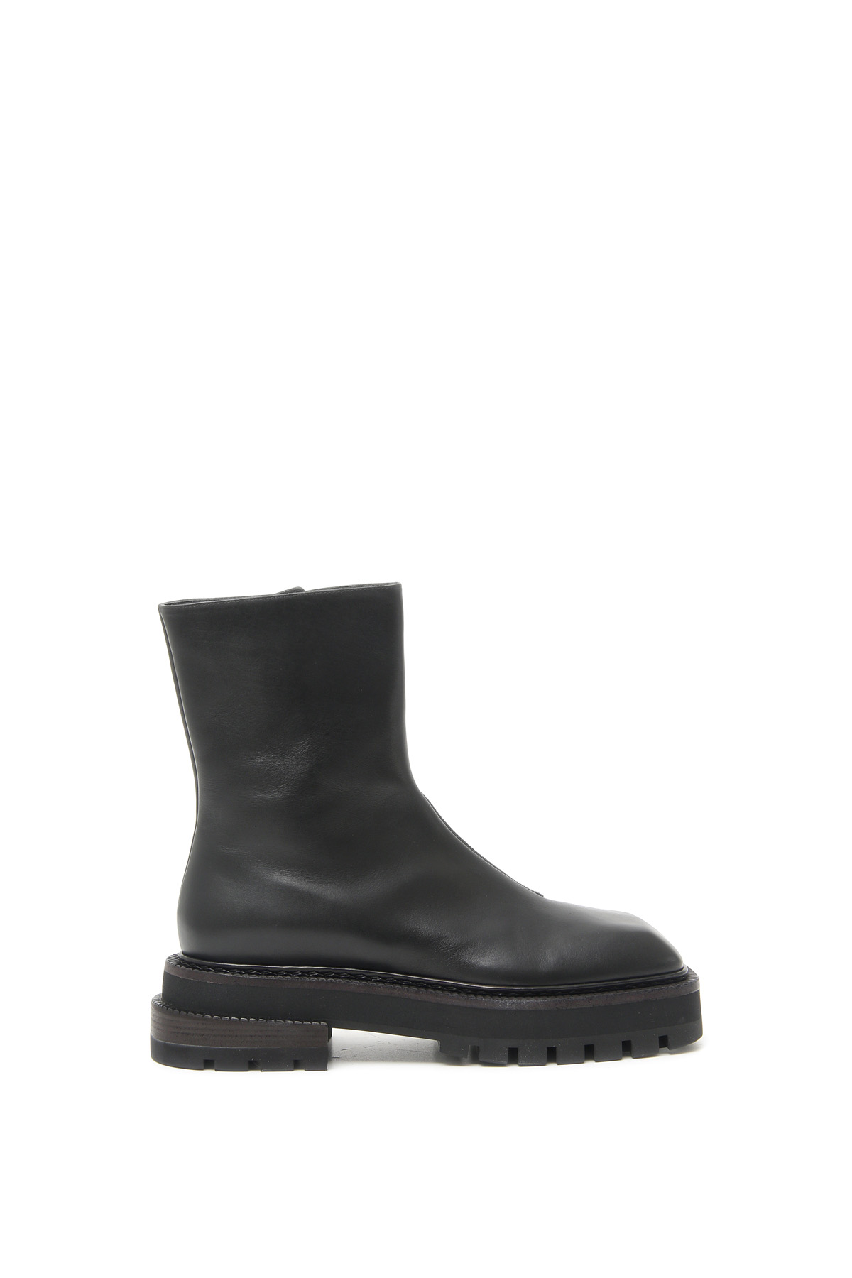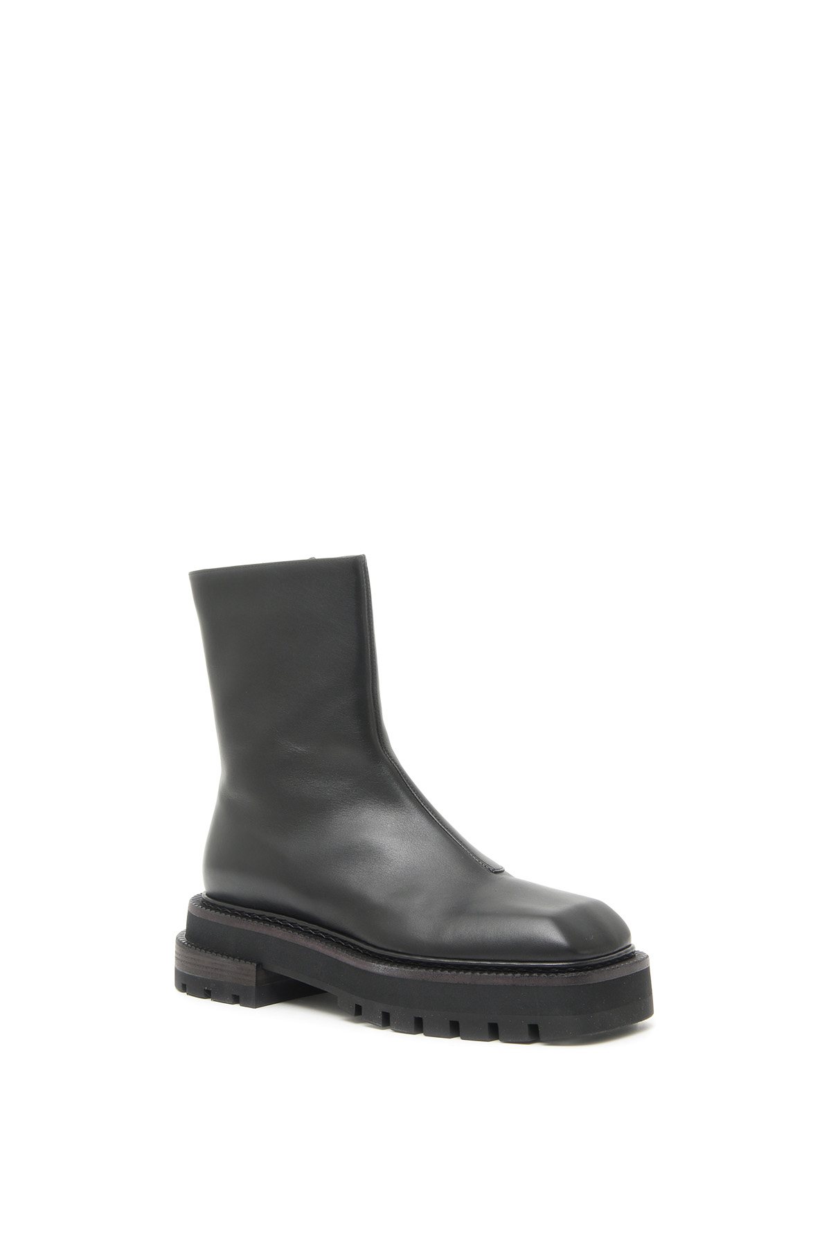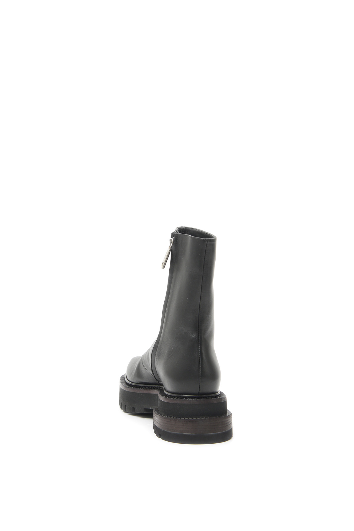 Stivaletti alla caviglia realizzati in vera pelle, con punta squadrata, guardolo sporgente con motivo zigrinato e chiusura con zip sul lato interno. Fodera in pelle, suola trekking in gomma.