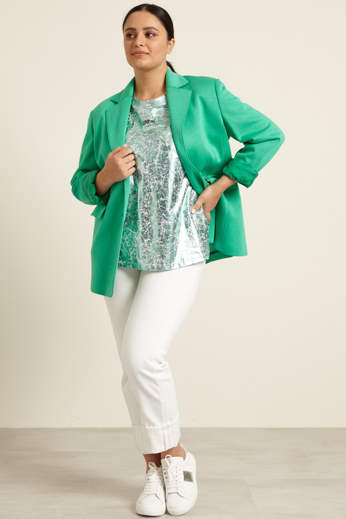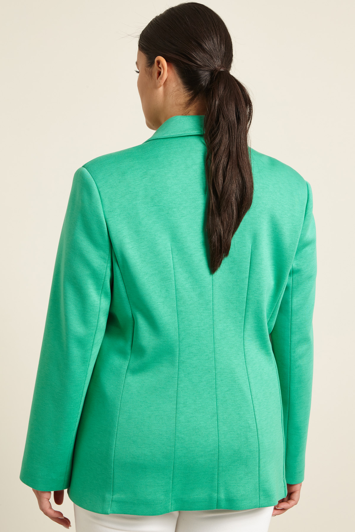 Giacca blazer dalla linea semiaderente realizzata in jersey neoprene con collo rever, spalle imbottite, maniche lunghe e tasche a filetto con patta. Chiusura con bottoni. Capo semifoderato.