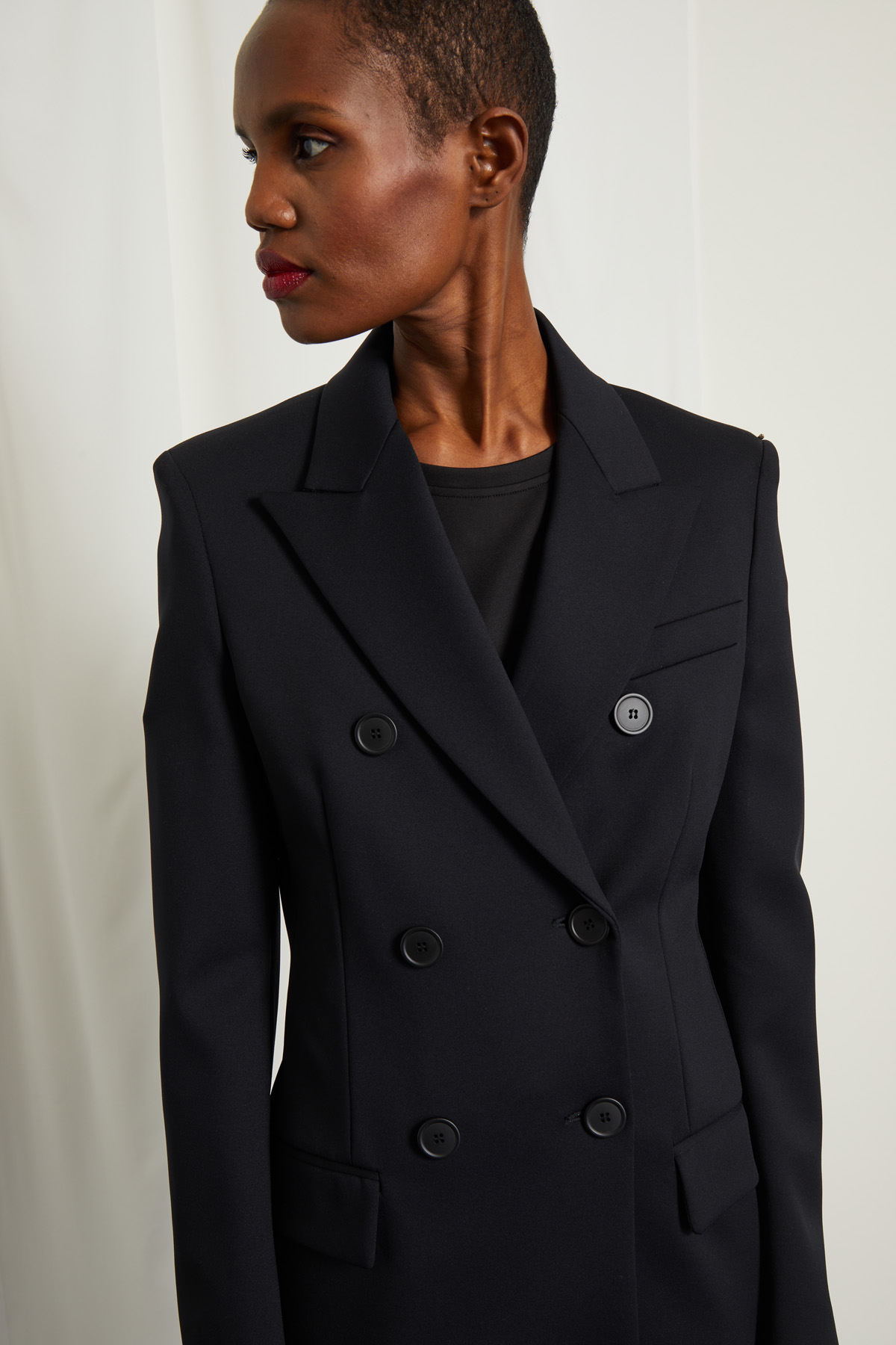 Blazer dalla linea sfiancata realizzato in jersey, con collo rever, maniche lunghe, taschino a filettone sul petto e doppiofiletto con patta sul davanti. Allacciatura doppiopetto tramite bottoni a vista. Foderato.