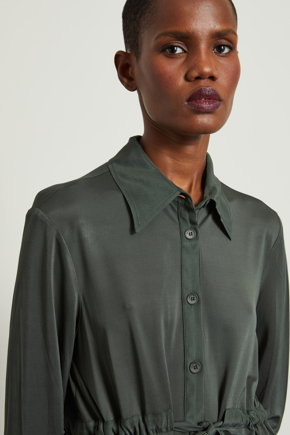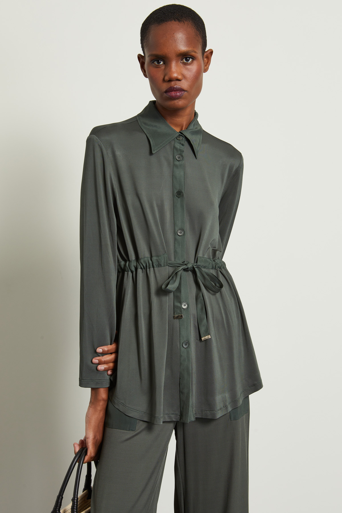 Casacca dalla linea morbida realizzato in jersey tecnico con inserti in crèpe e coulisse in vita, colletto a camicia e maniche lunghe. Allacciatura tramite bottoni.
