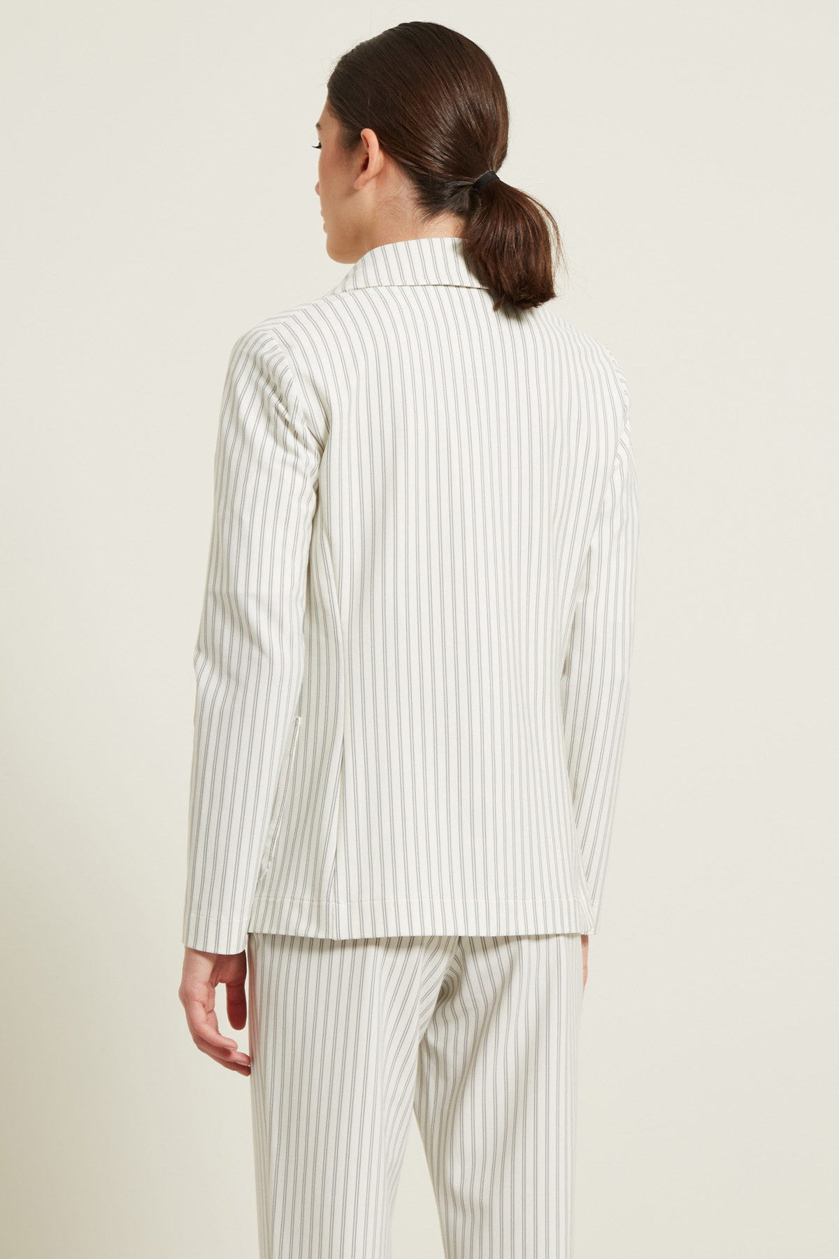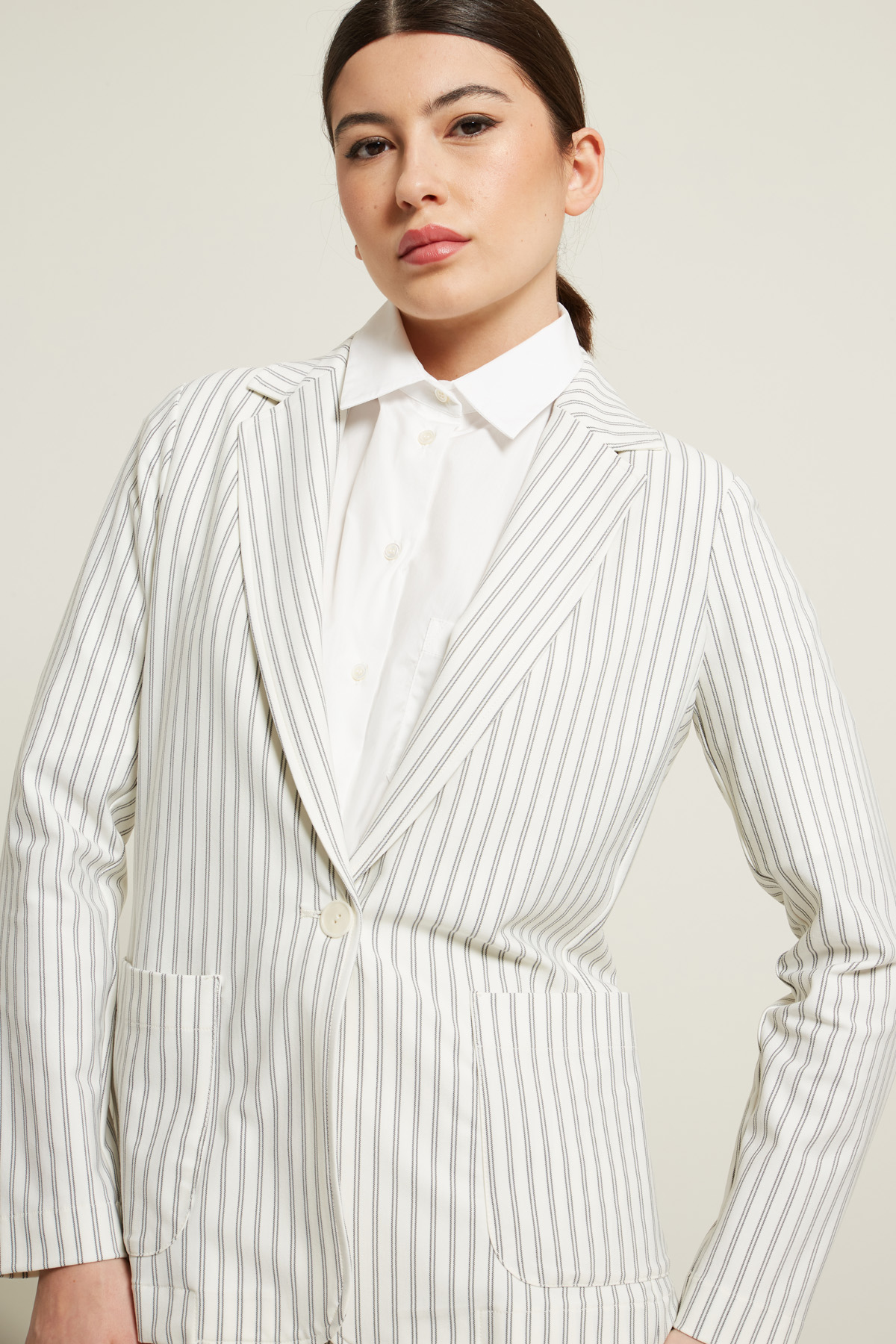 Blazer dalla linea dritta realizzato in jersey di misto viscosa stretch tinto filo effetto oxford, con collo a rever, maniche lunghe, tasche applicate. Allacciatura monopetto tramite bottone. Sfoderato.