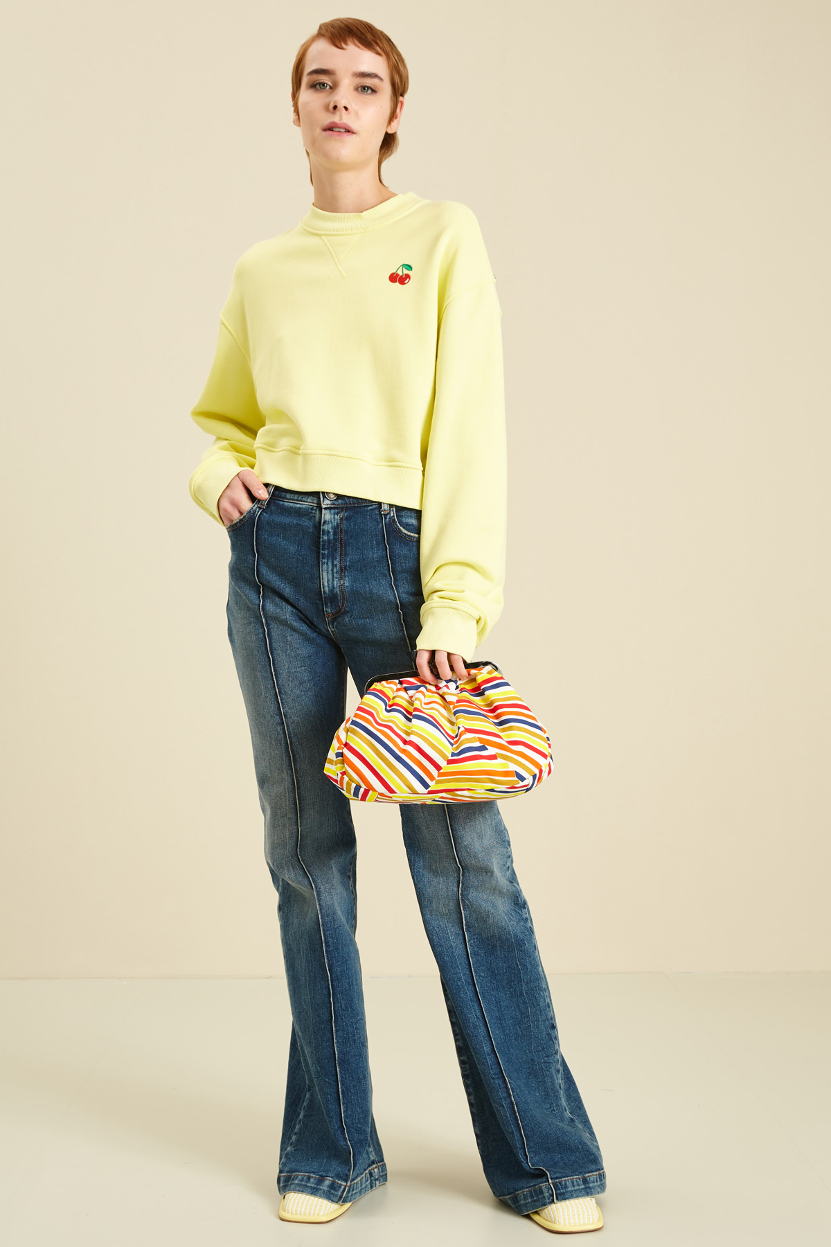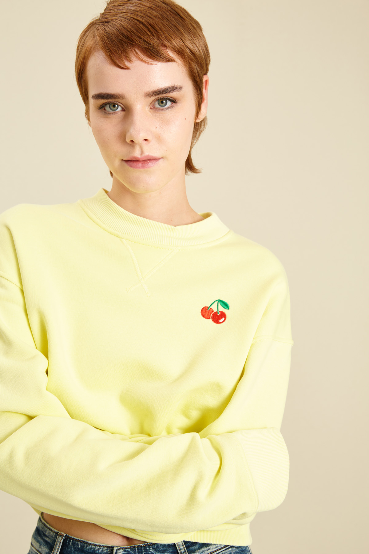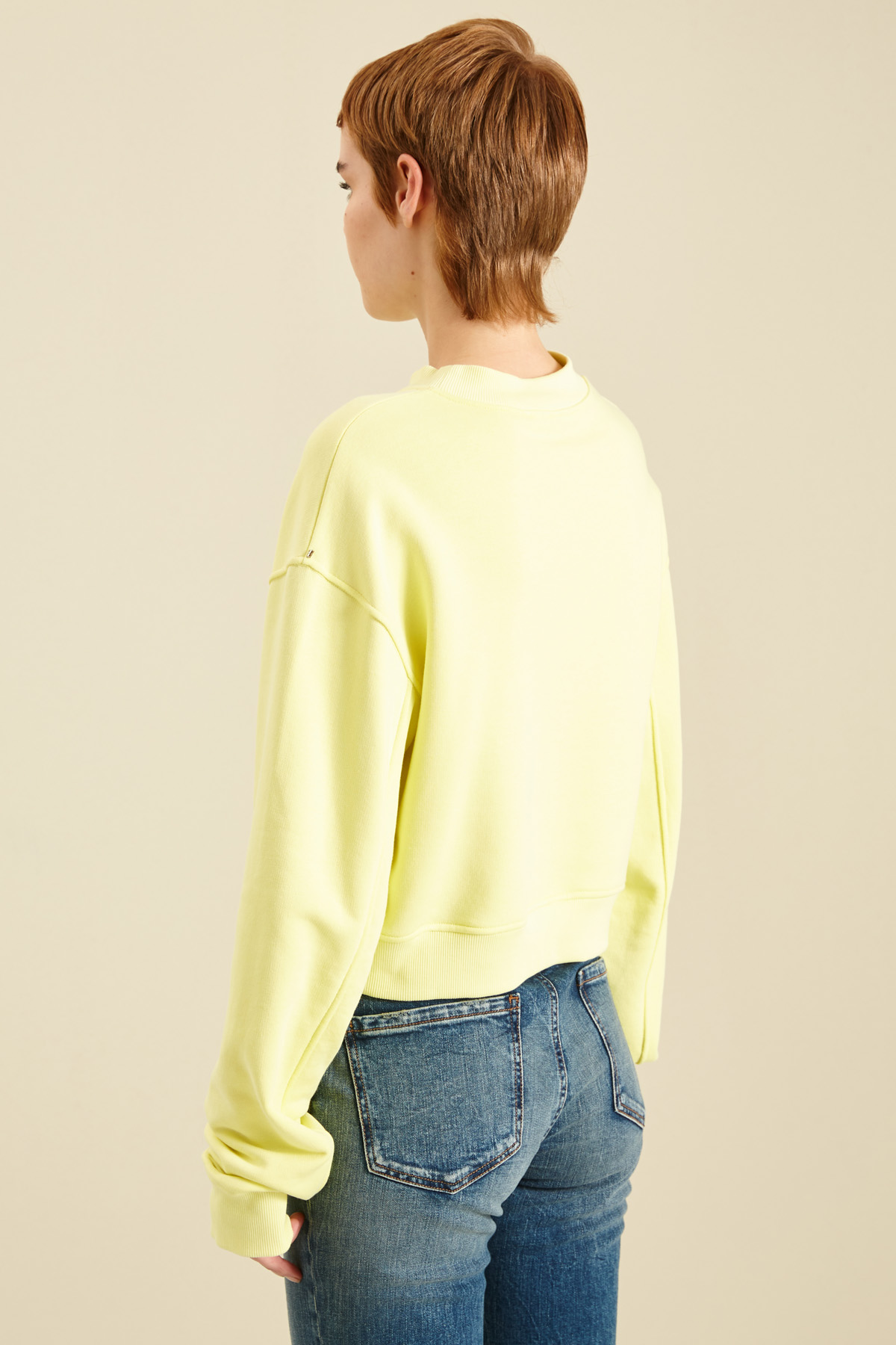 Felpa corta dalla linea morbida realizzata in jersey spesso di misto cotone stretch, con scollo a giro, maniche lunghe dal giro sceso, profili rifinite a coste.