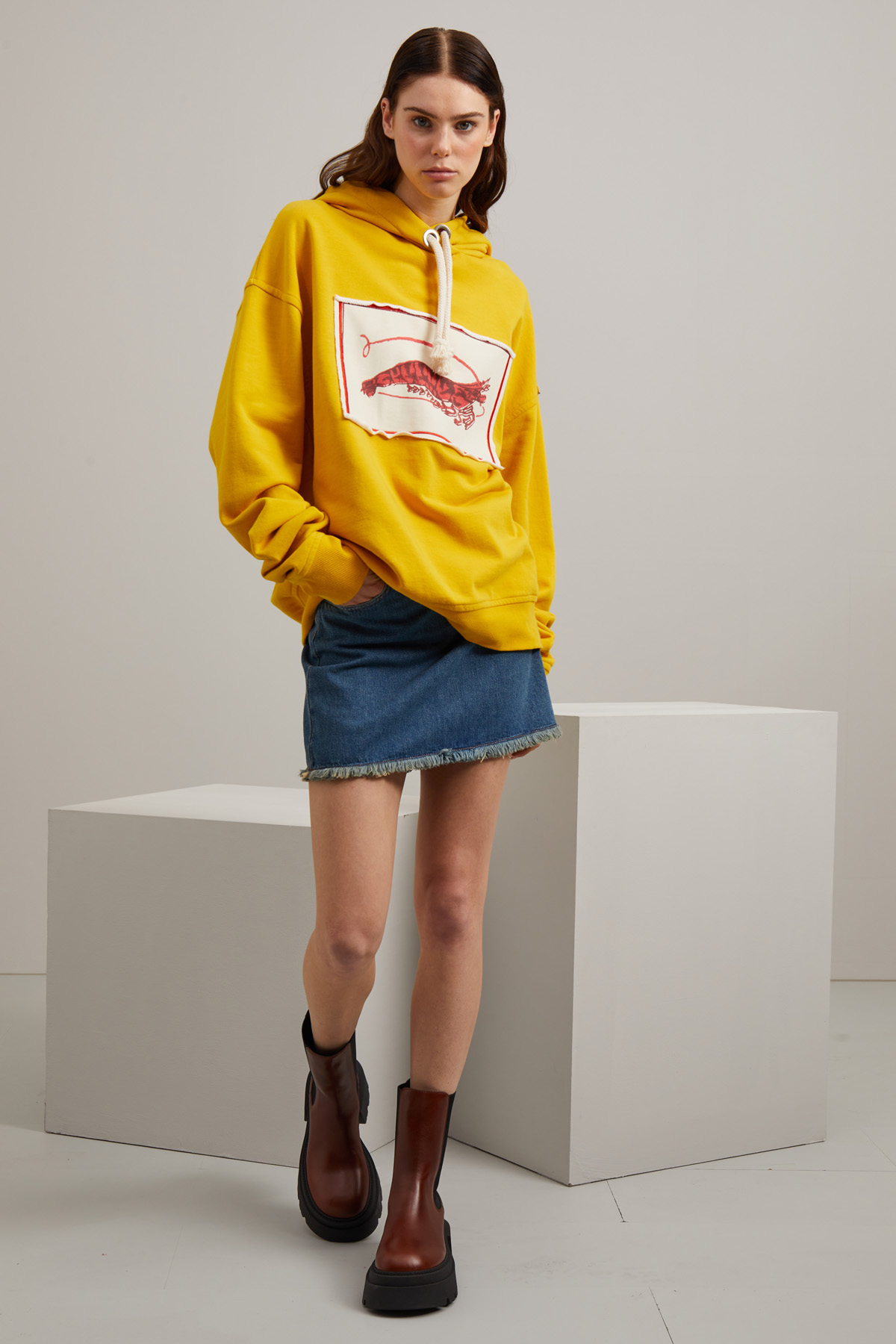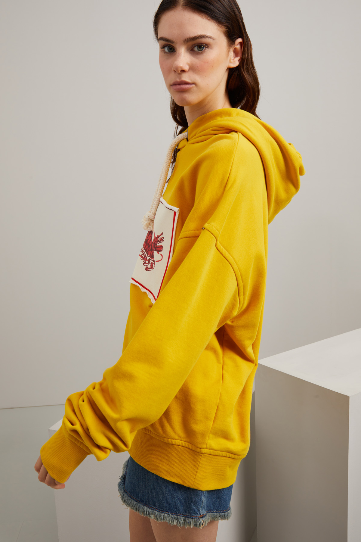 Felpa dalla linea over realizzata in jersey pesante di puro cotone, con dettaglio applicato sul davanti, cappuccio, coulisse con cordini, maniche lunghe dal giro sceso e profili rifiniti a coste.