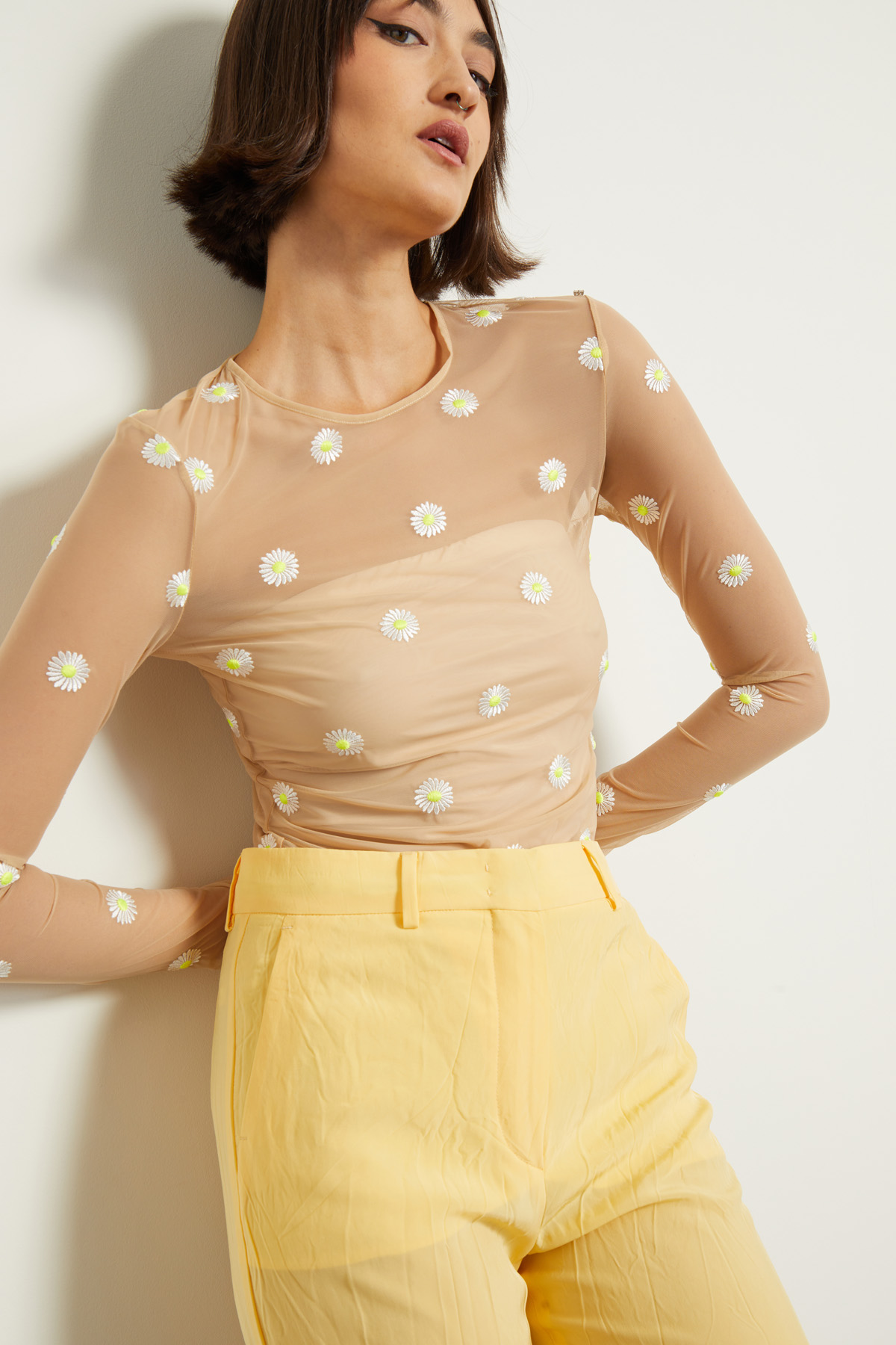 Top dalla linea aderente realizzato in jersey tulle con dettagli ricamati, scollo a giro e maniche lunghe. Capo dotato di top a fascia con inserto elastico in abbinamento.