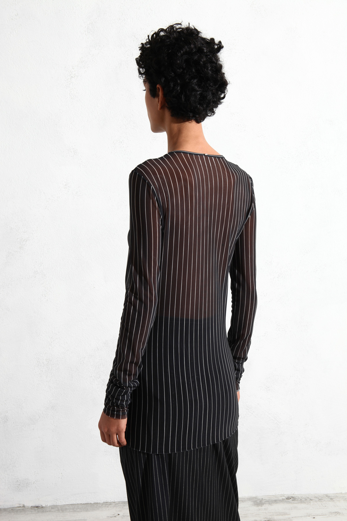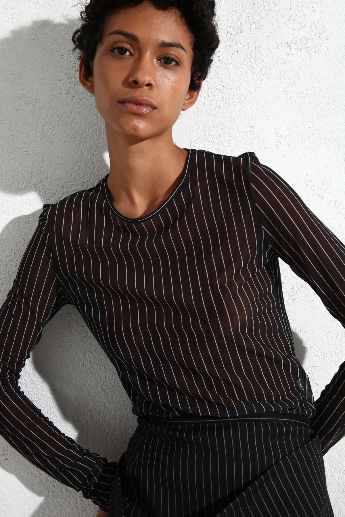Top dalla linea aderente realizzato in tulle leggero stretch stampato all over, con scollo a giro e maniche lunghe.