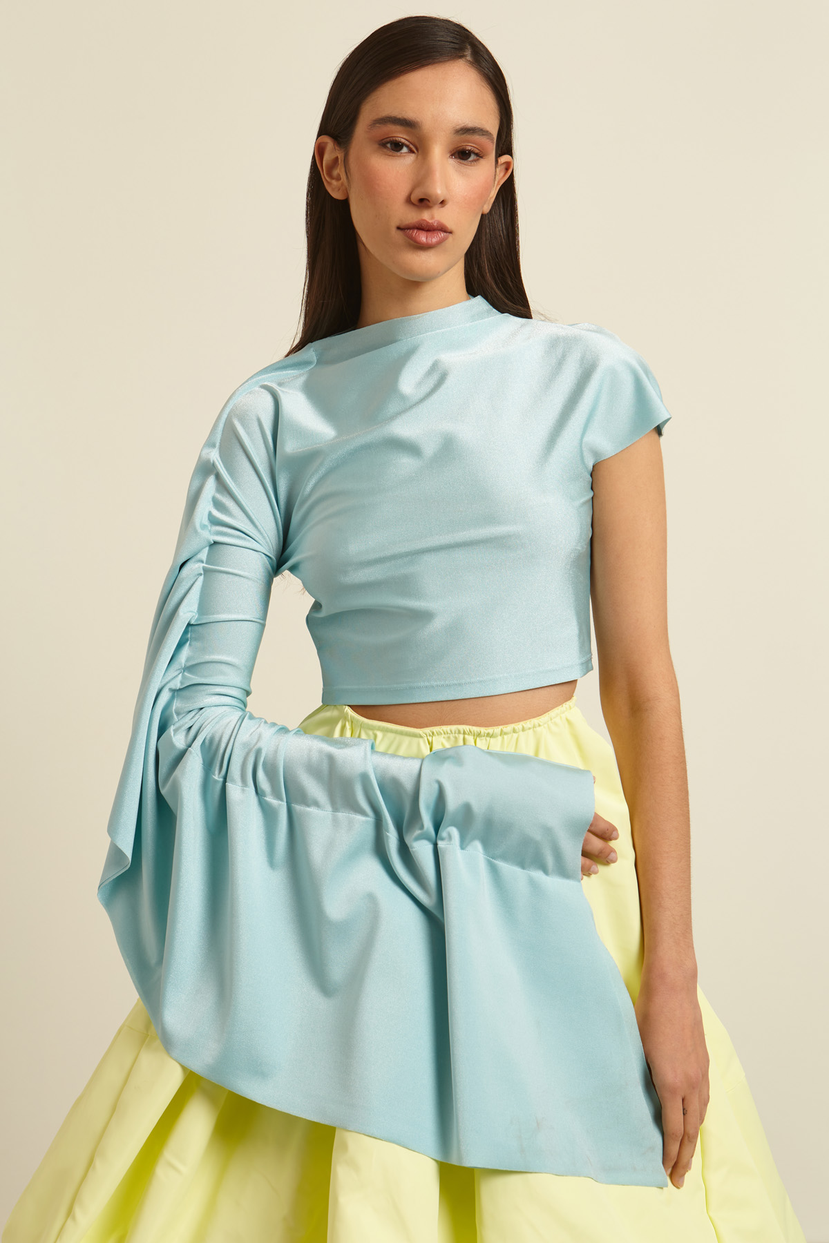 Top dalla linea aderente realizzato in lycra lucida, con collo alto e costruzione asimmetrica delle maniche: ad aletta a sinistra e lunga con doppio volant nella parte destra.