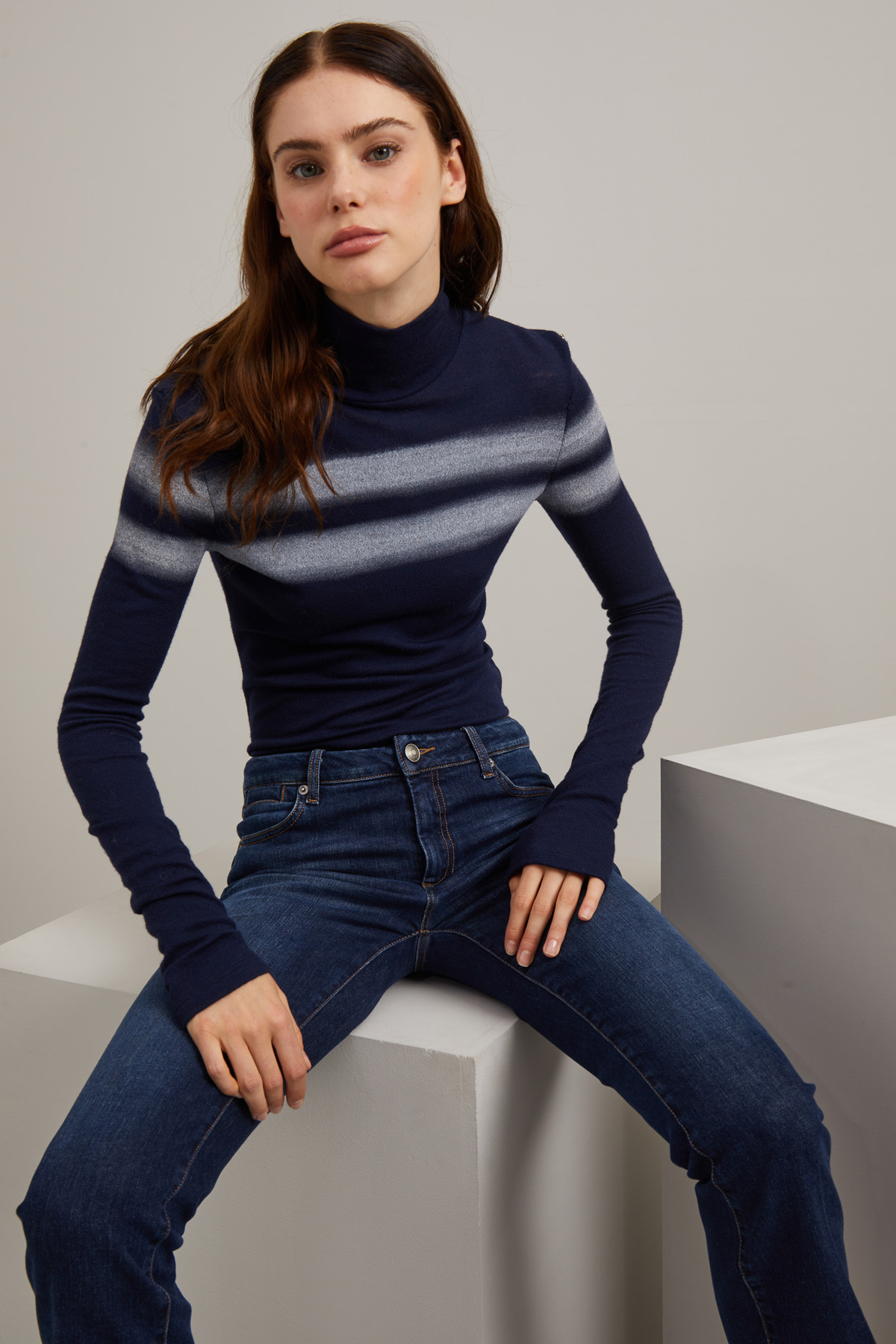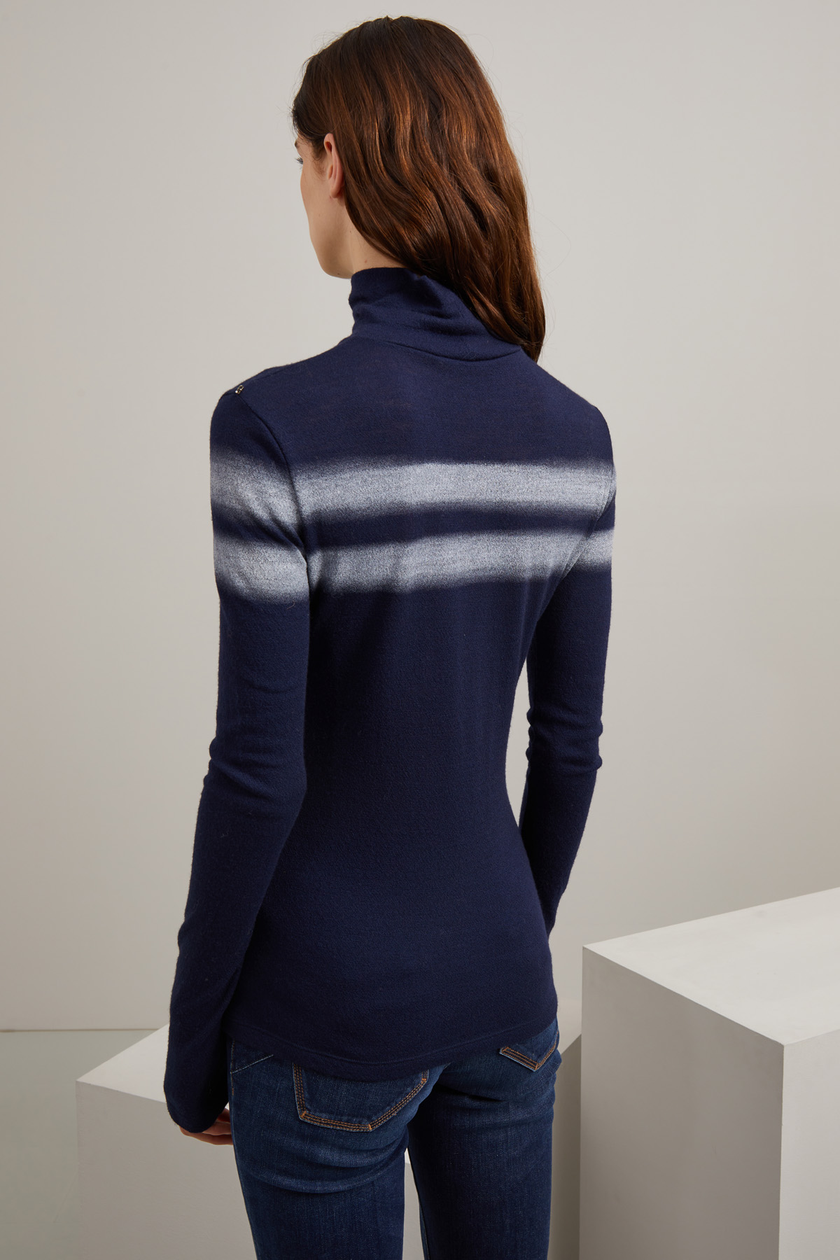Dolcevita dalla linea aderente realizzata in filato di pura lana crépe, con dettagli spalmati, collo alto e maniche lunghe.