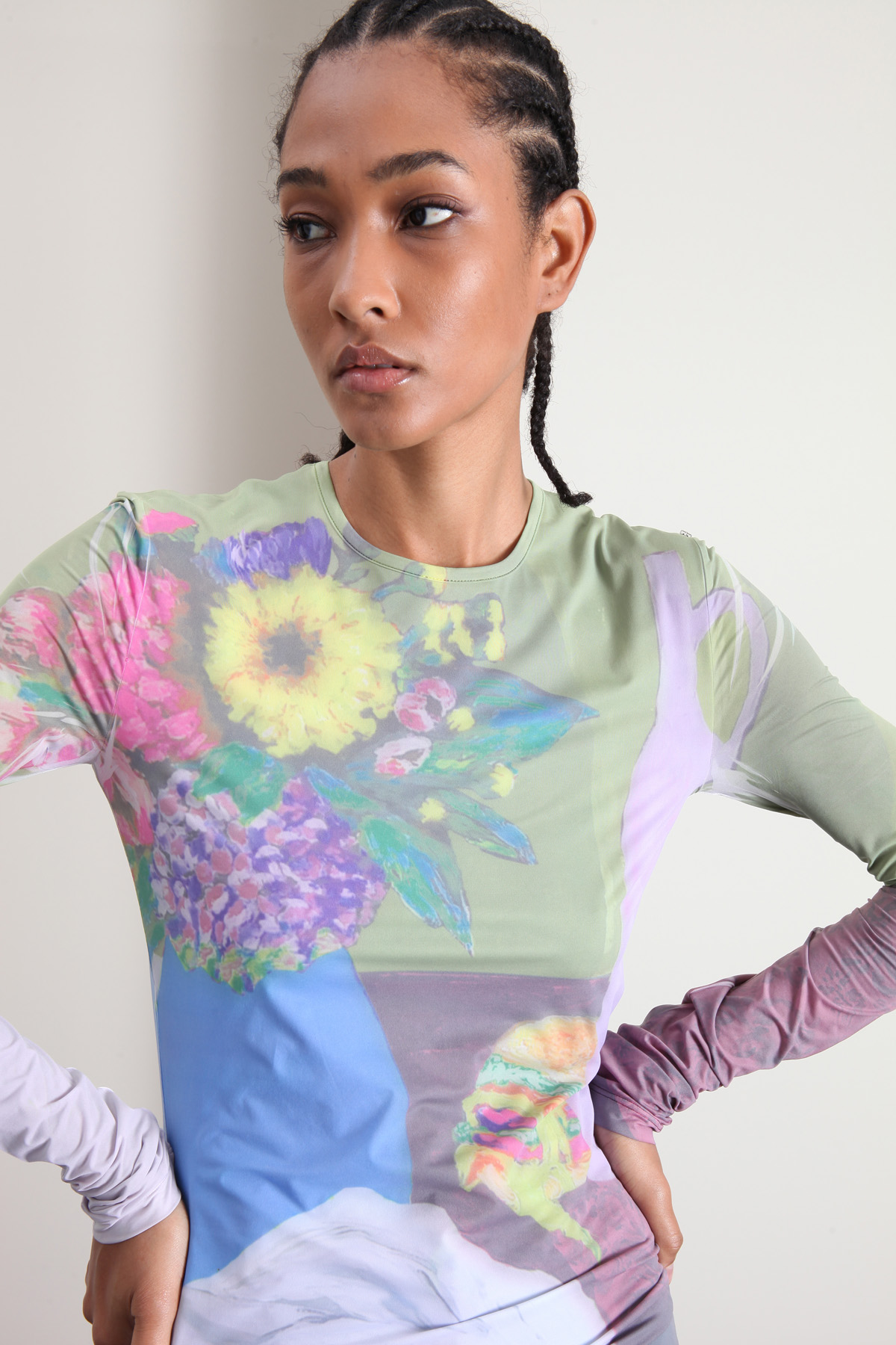 Top dalla linea aderente realizzato in jersey calza stampato, con scollo a giro e maniche lunghe.
