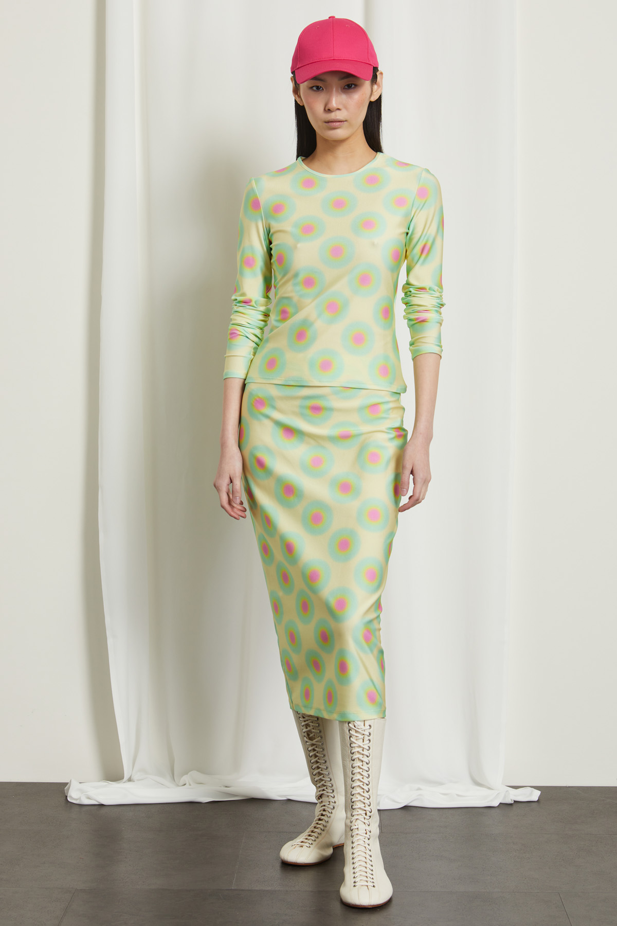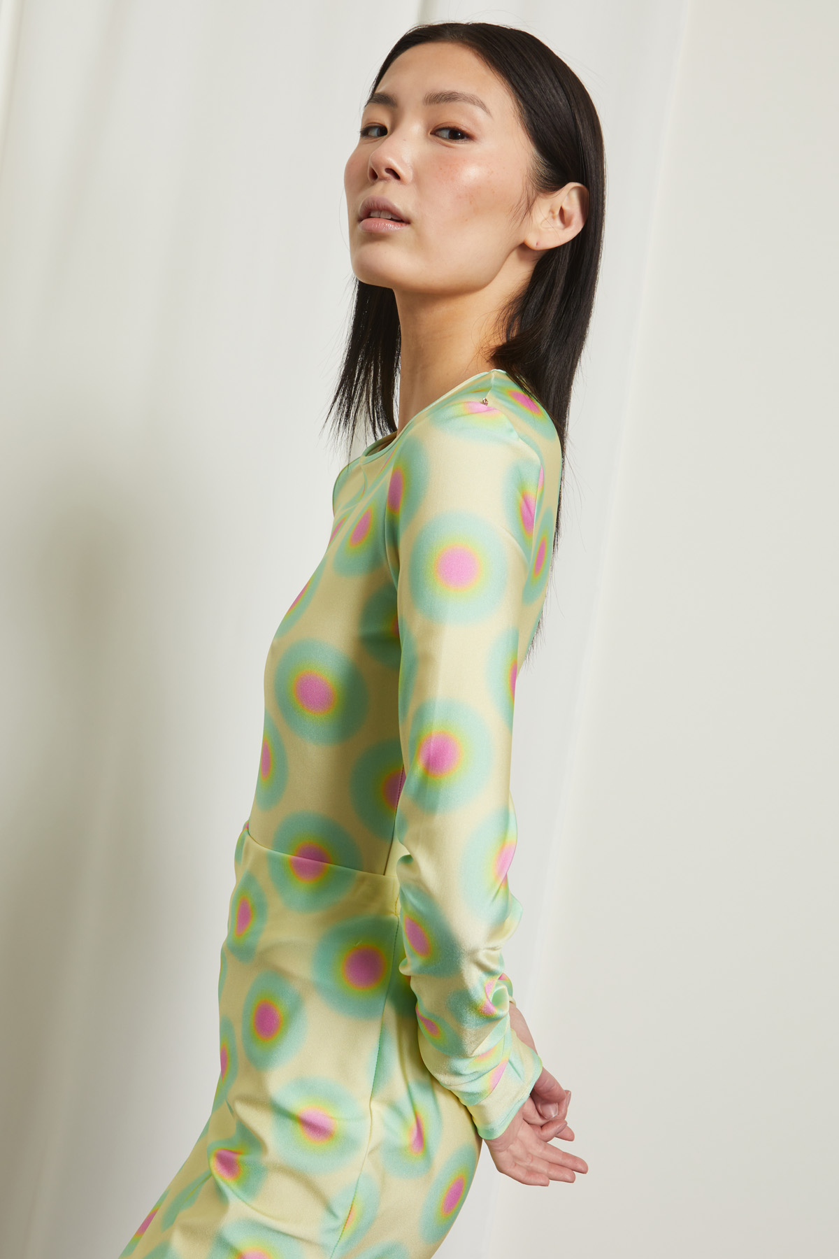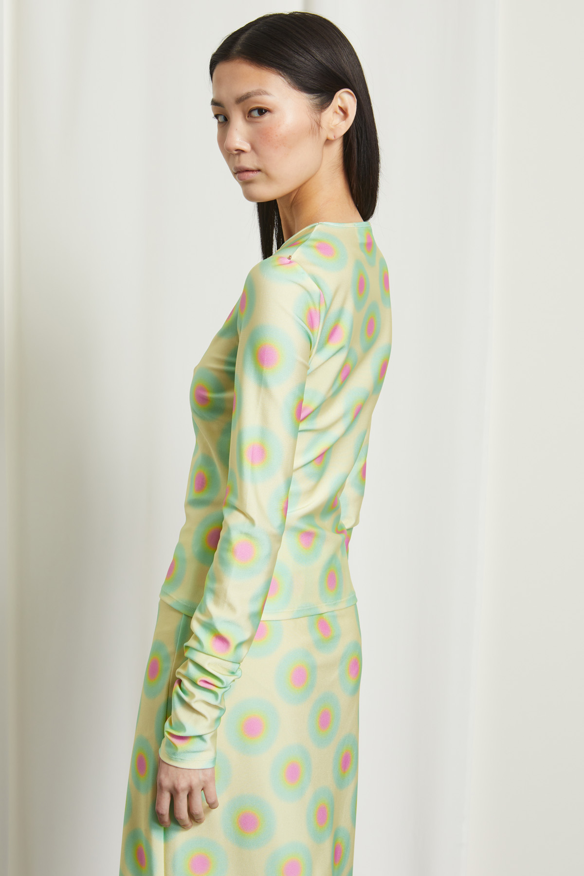 T-shirt crop dalla linea aderente realizzata in jersey di lycra stampato, con scollo a giro e maniche extra lunghe.