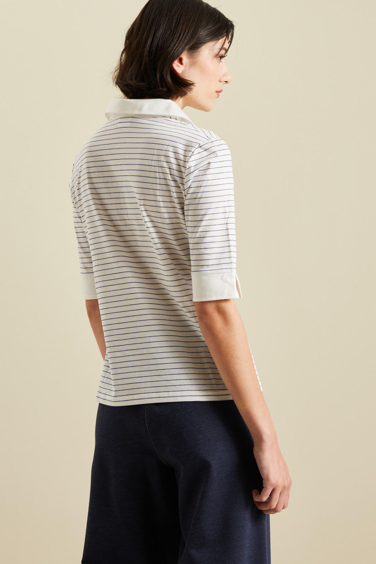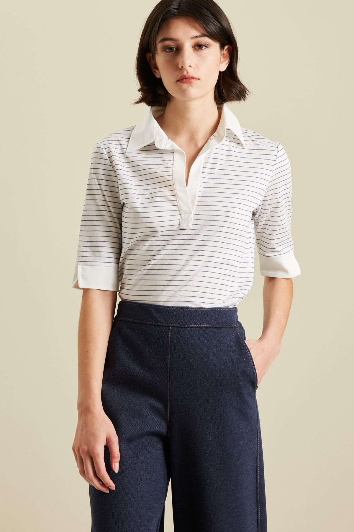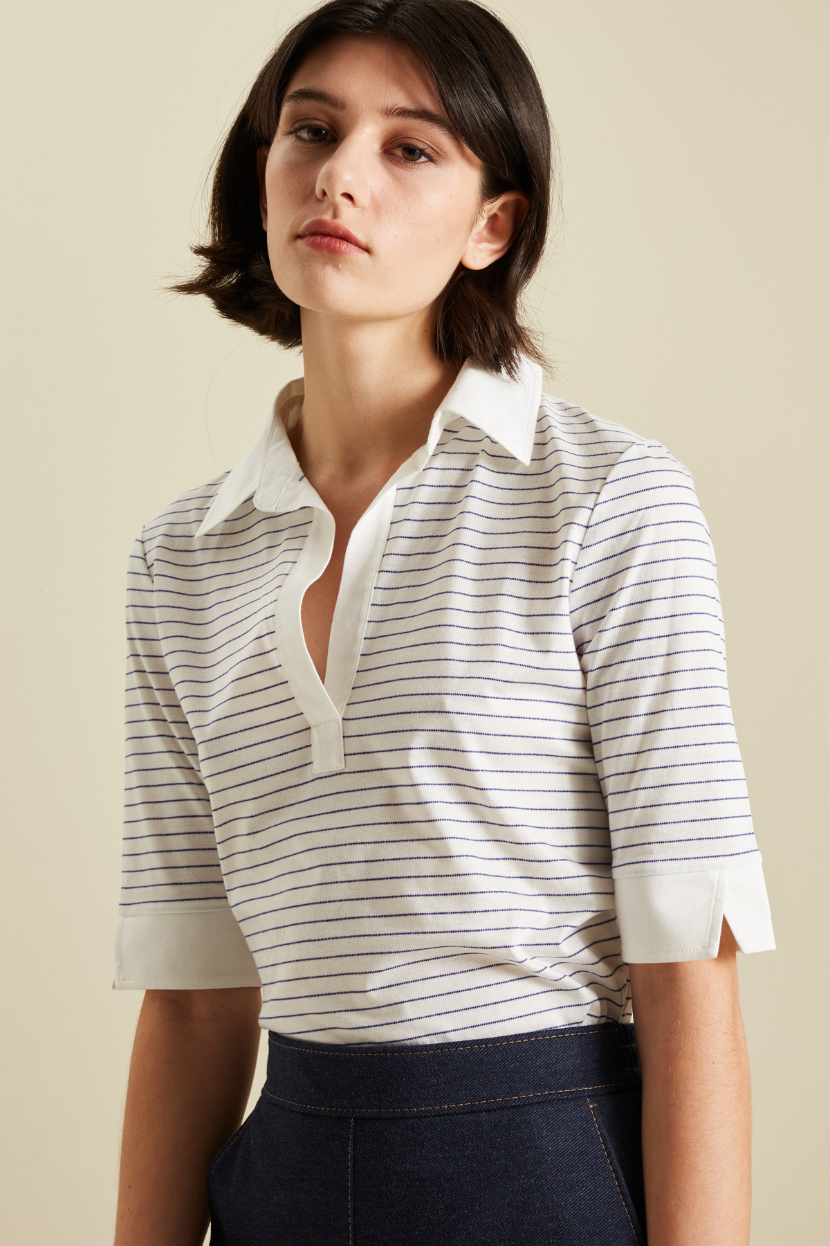 Polo dalla linea sfiancata realizzata in jersey di cotone piquet, con apertura a V senza bottoni e maniche corte con piccoli spacchi al fondo.