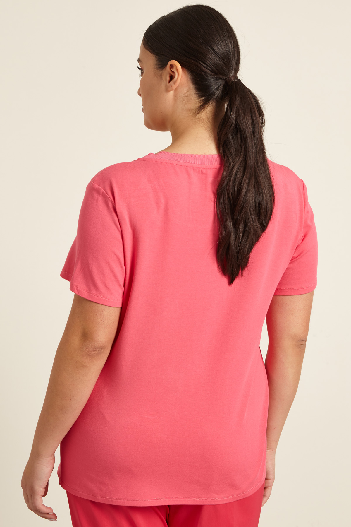 Top dalla linea fluida realizzato in jersey di viscosa stretch, con inserto in raso sul davanti, scollo rotondo e maniche corte.
