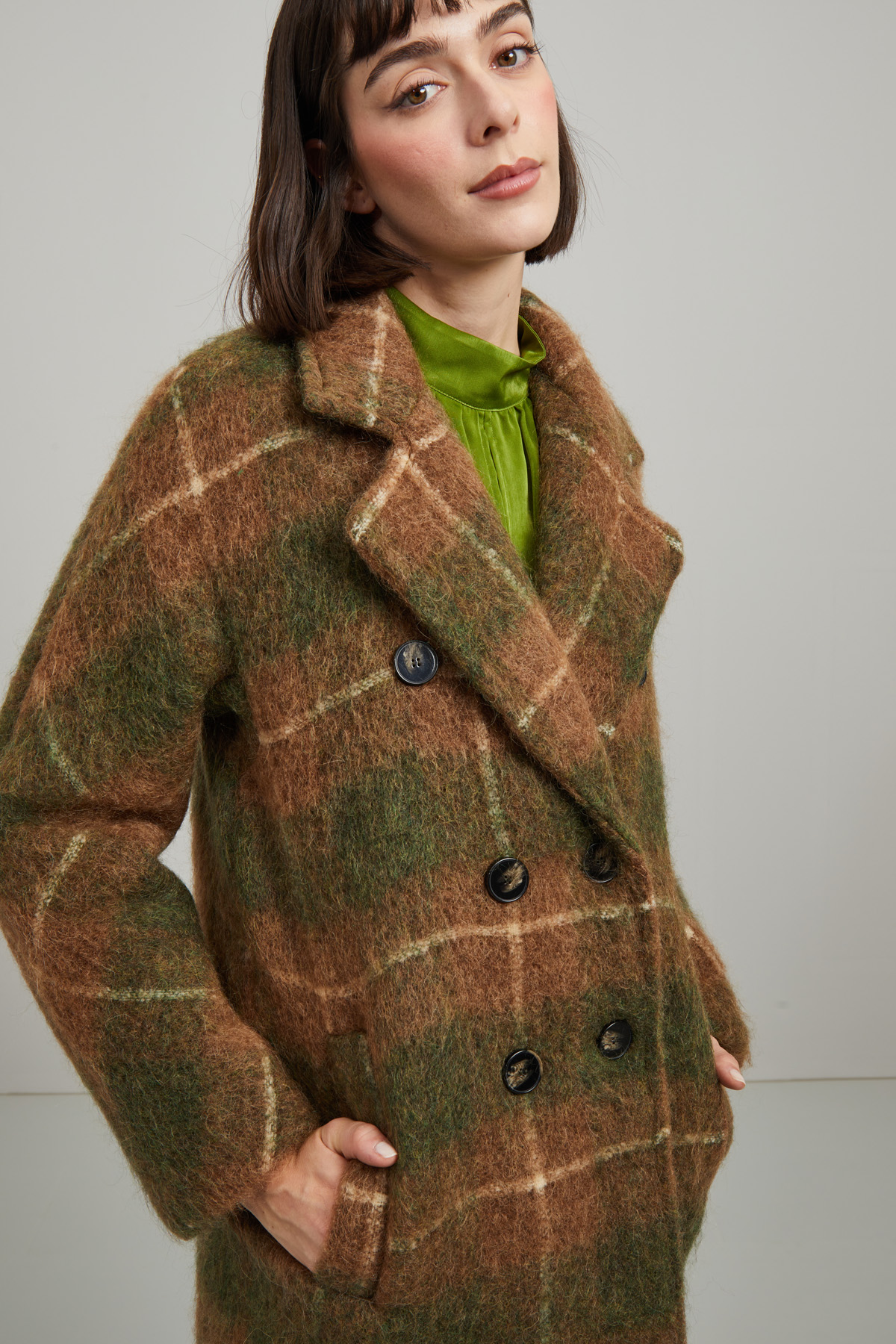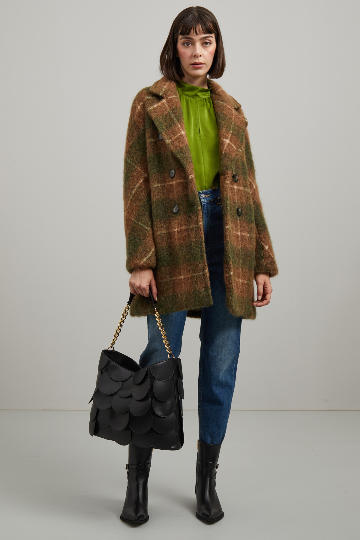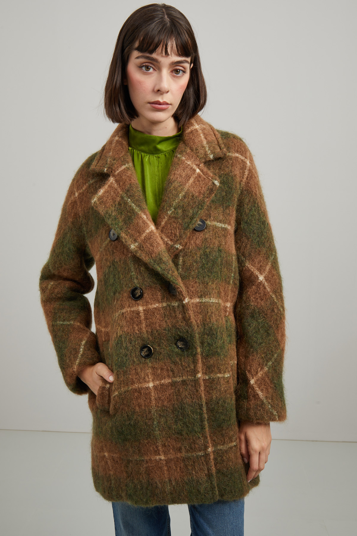 Cappotto dalla linea leggermente over realizzato in misto lana effetto pelliccia, con collo rever, maniche lunghe a kimono e tasche a filettone. Allacciatura a doppiopetto tramite bottoni a vista. Foderato.