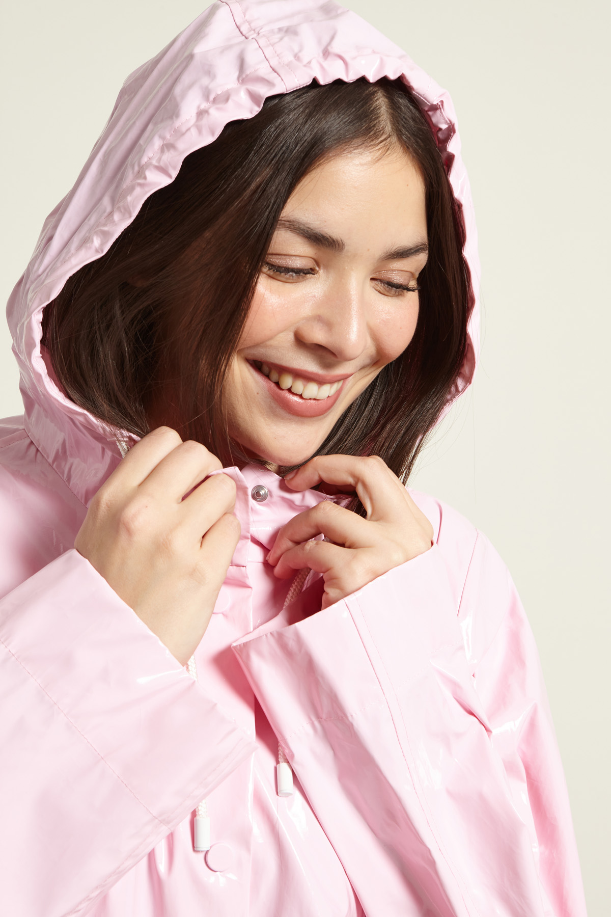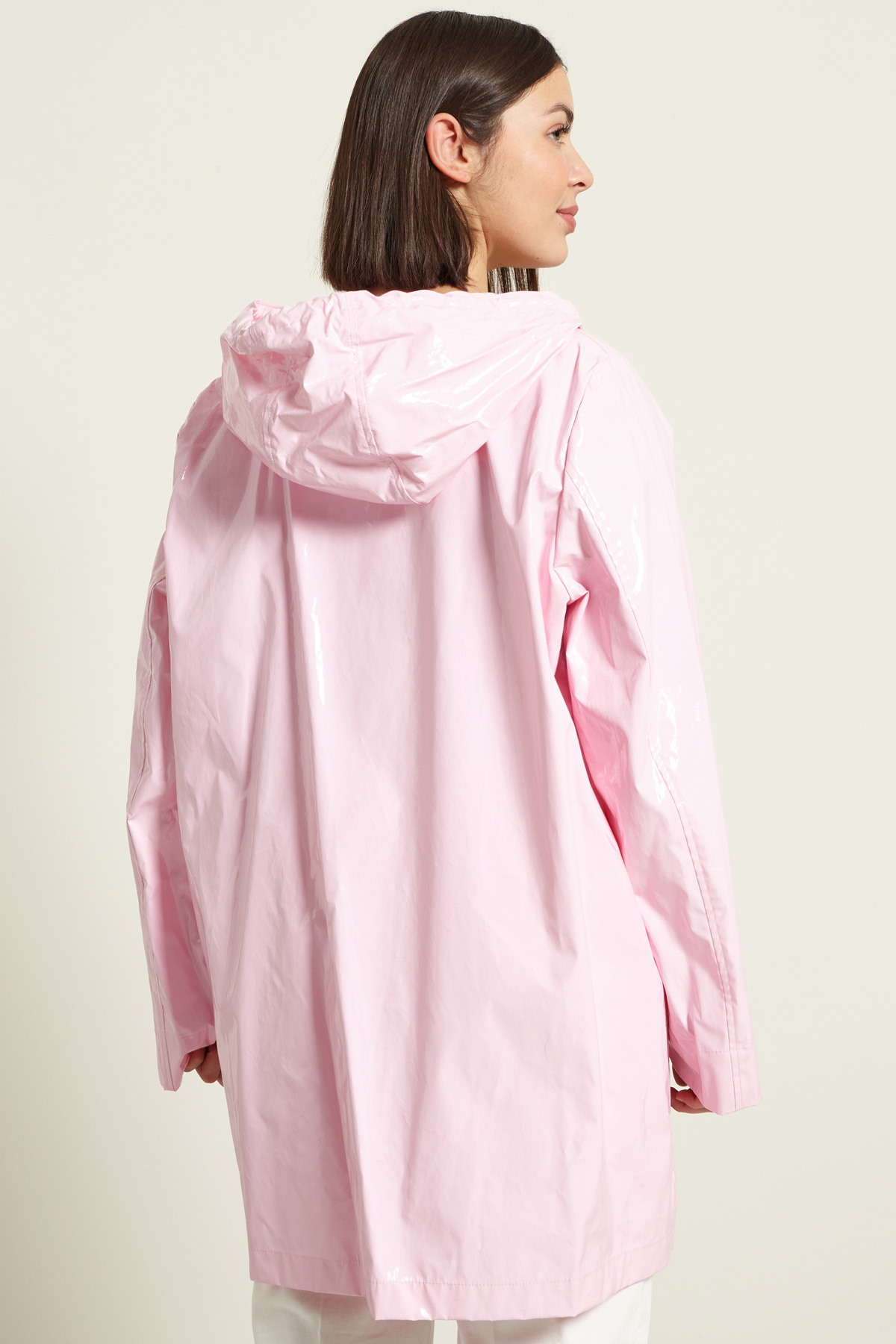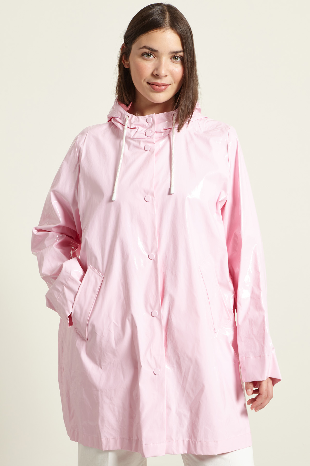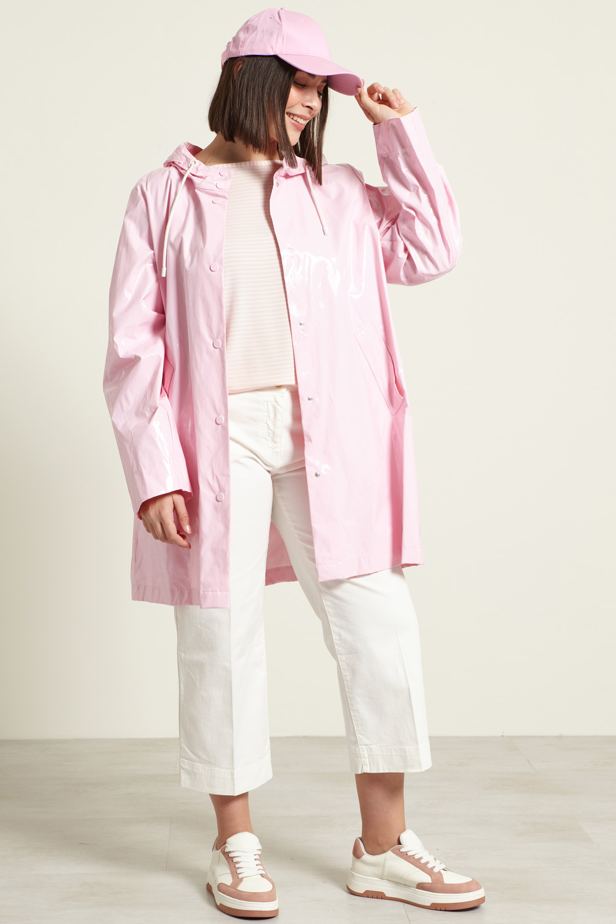 Impermeabile dalla linea dritta realizzato in tessuto di puro cotone spalmato effetto vernice antigoccia, con collo alto, cappuccio e coulisse, maniche lunghe, tasche laterali a filettone. Allacciatura monopetto tramite bottoni automatici. Sfoderato.