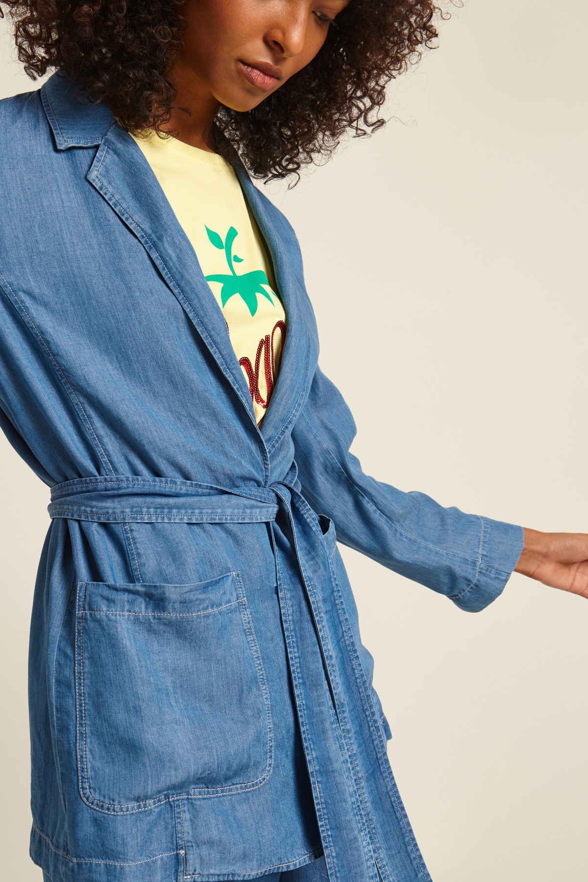 Giacca dalla linea fluida realizzata in tessuto leggero e fluido effetto denim, con collo a rever, maniche lunghe con polsino e spacchetto, maxi tasche applicate. Allacciatura monopetto tramite bottoni e cintura coordinata. Sfoderata.