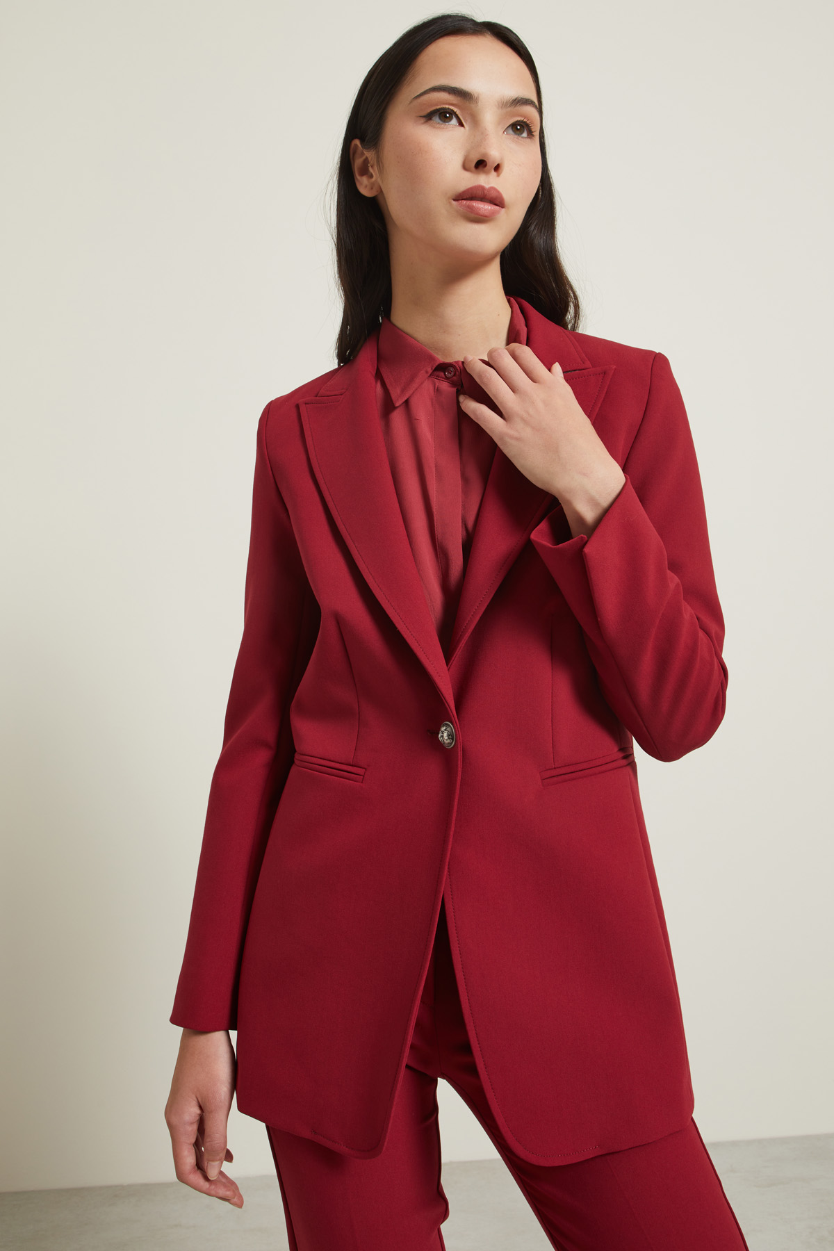 Blazer dalla linea dritta realizzato in tela spessa di misto viscosa stretch, con collo rever, maniche lunghe con spacchetti, tasche doppio filetto e spacco nel retro. Allacciatura monopetto tramite bottone in metallo. Foderato.