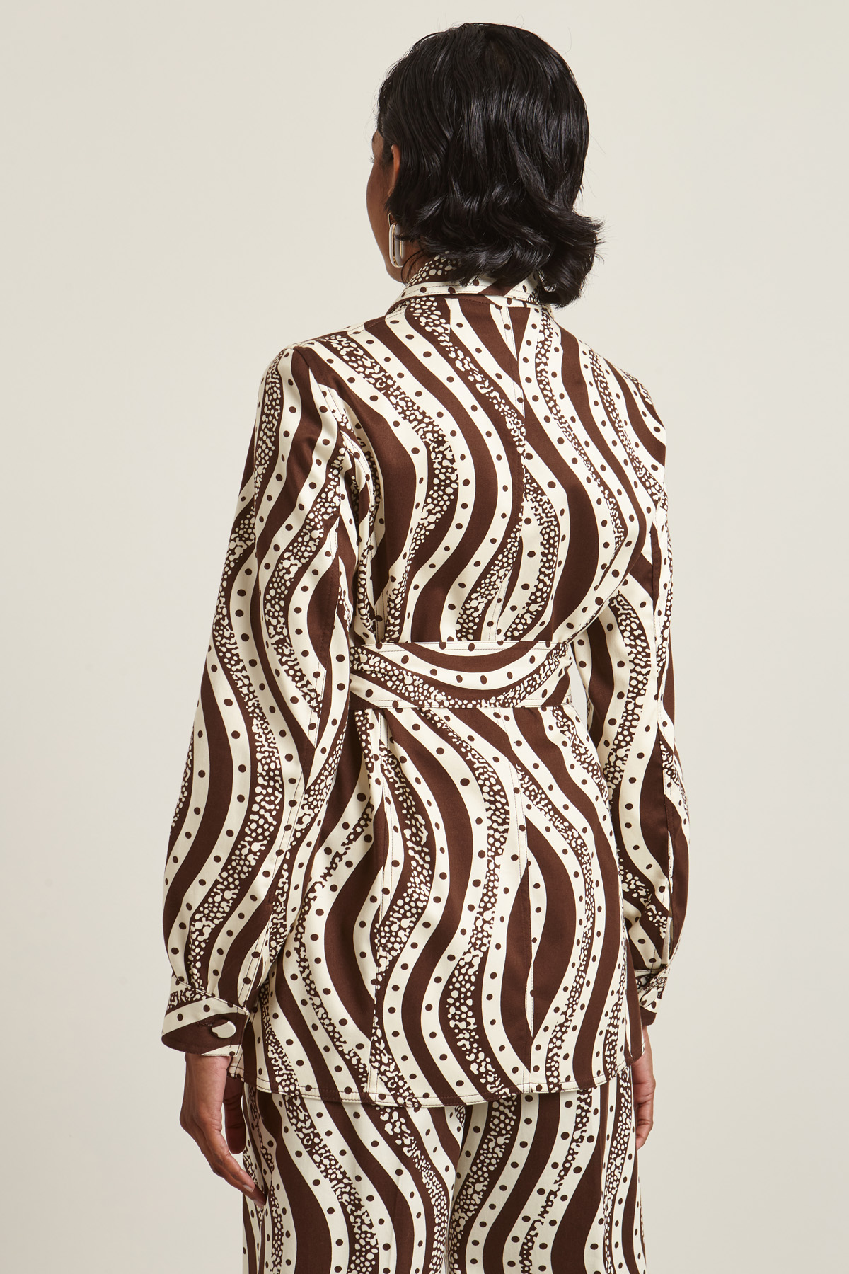 Giacca stile sahariana realizzata in raso di cotone stretch con collo a camicia, maniche lunghe con polsino alto e bottone, tasche applicate con patta e bottoni sul davanti, spacchi laterali. Allacciatura tramite bottoni rivestiti e cintura coordinata. Sfoderato.