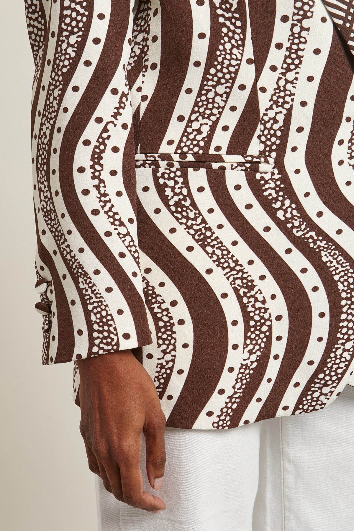 Blazer dalla linea dritta realizzato in enver satin stampato, con collo reve, maniche lunghe con spacchetti e bottoni, taschino a filetto e doppio filetto sul davanti, spacco nel retro. Allacciatura monopetto tramite bottone rivestito. Foderato.