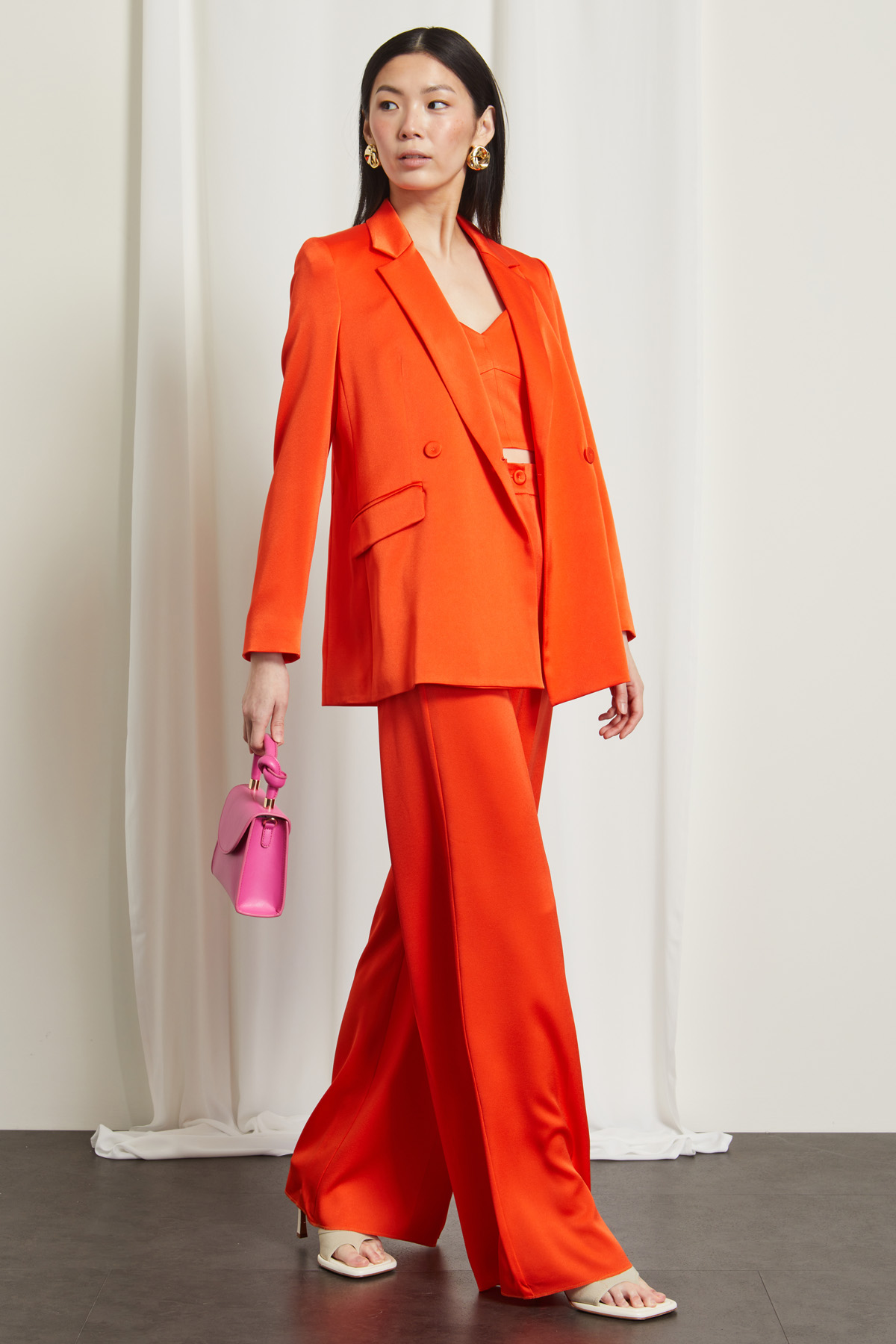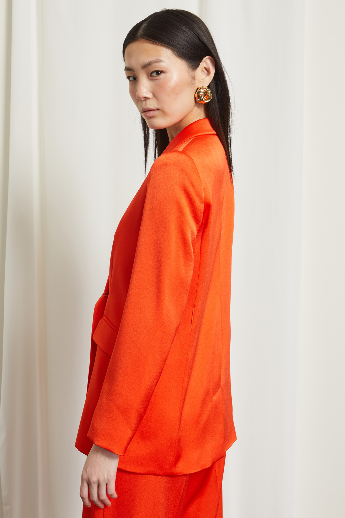 Blazer dalla linea dritta realizzato in raso, con collo rever, maniche lunghe, tasche a doppio filetto con patta e spacco nel retro. Allacciatura doppiopetto tramite bottoni e cintura coordinata. Foderato.