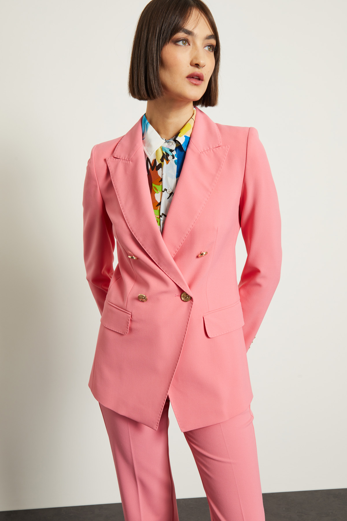 Blazer dalla linea sfiancata realizzato in tela di viscosa stretch con collo rever, maniche lunghe con spacchetto e bottoni, tasche a doppio filetto con patta e spacco nel retro, profili rifiniti a puntino. Allacciatura doppiopetto tramite bottoni in metallo. Capo foderato.